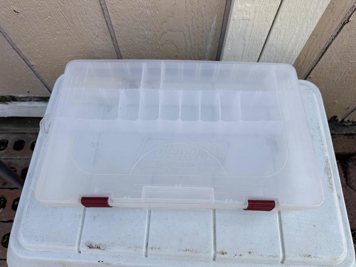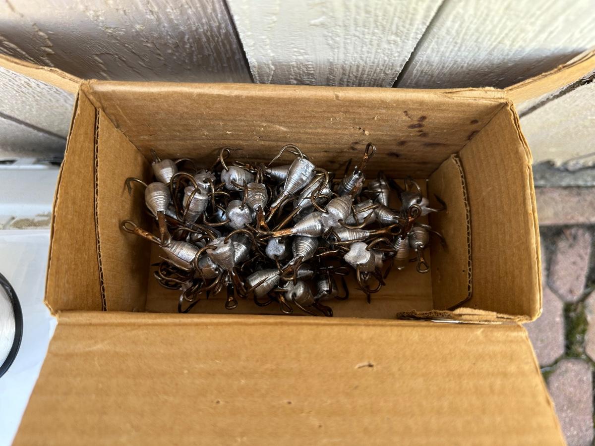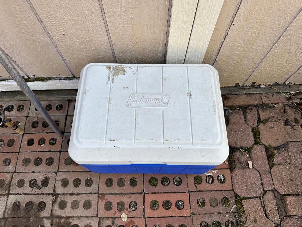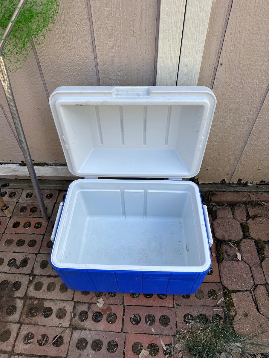 FISHING NET AND WEIGHTED HOOKS, COOLER & ROD/REEL