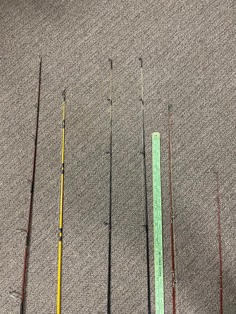Assortment of 6 poles and 4 reels. 3 spinning reels and 1 deep-sea style reel. 3 poles approx. 7 feet long, 2 are slightly over 6 feet, and 1 is approx 5 feet long.