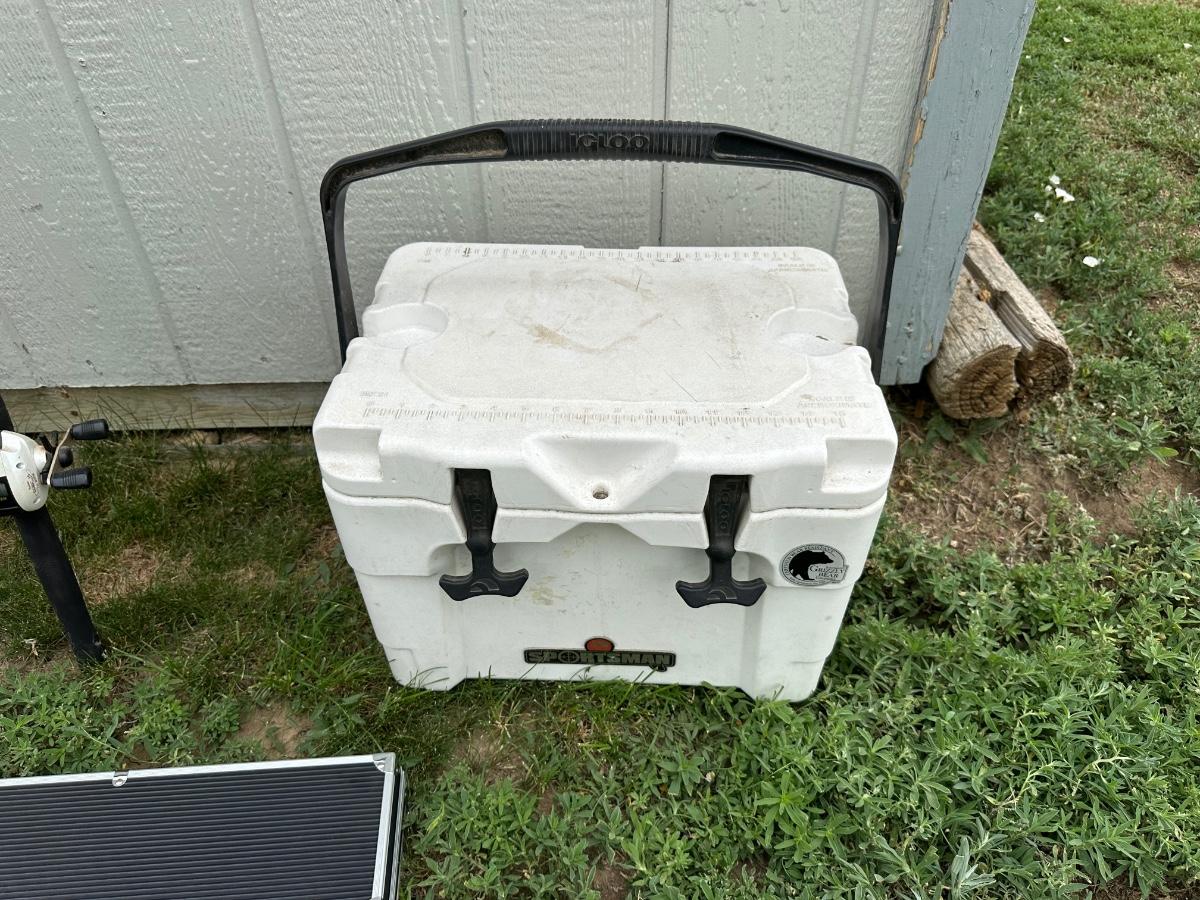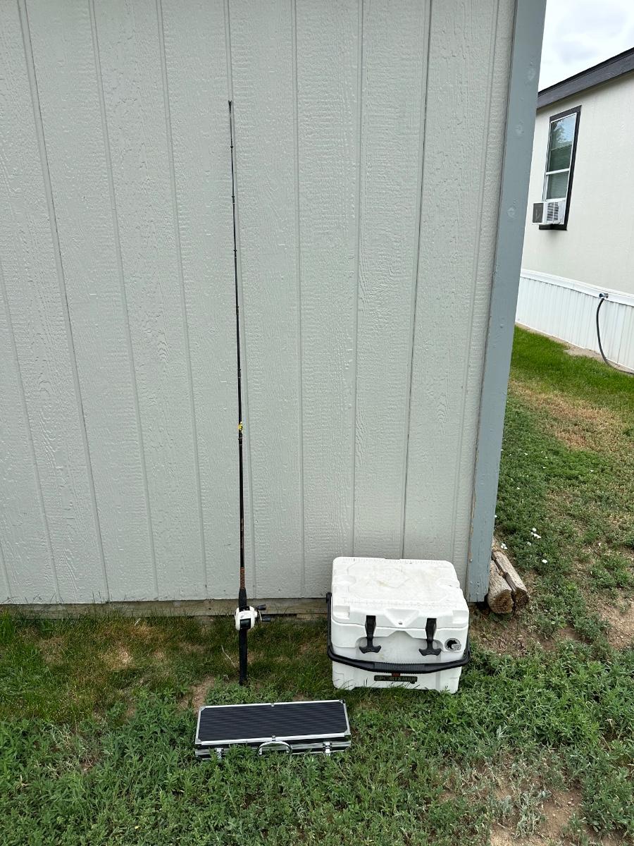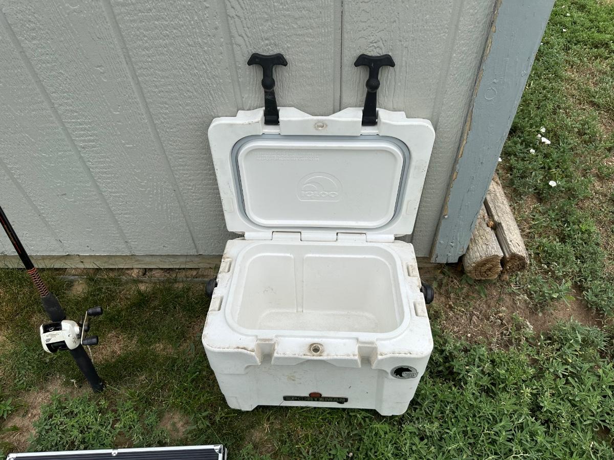 FISHING POLE WITH REEL, SPORTSMAN COOLER AND NEW BBQ UTENSILS
