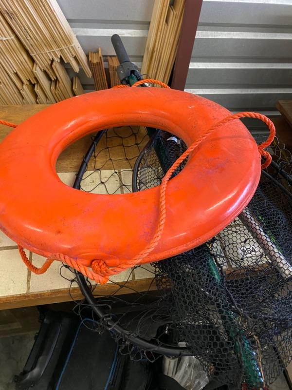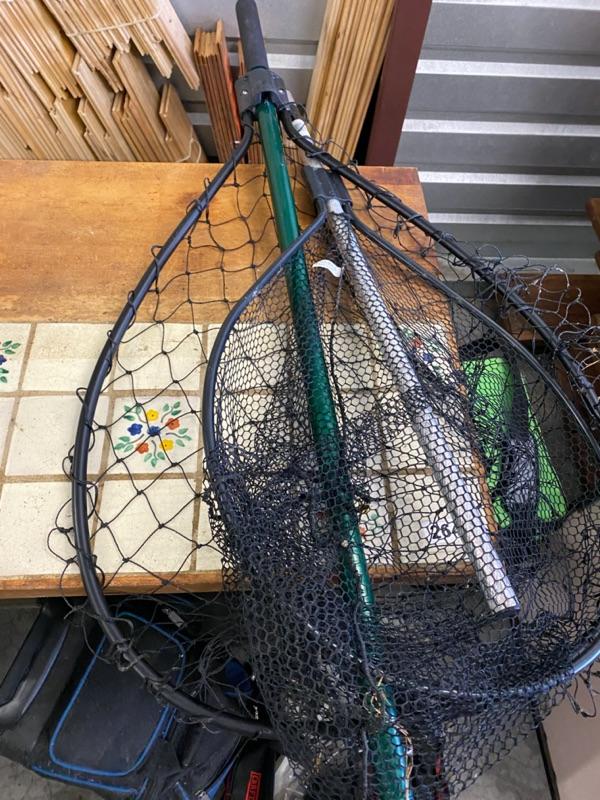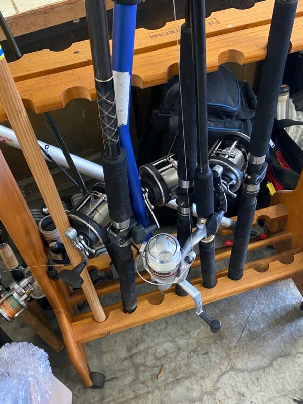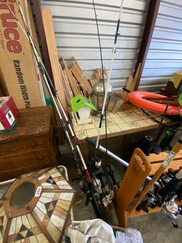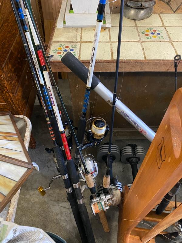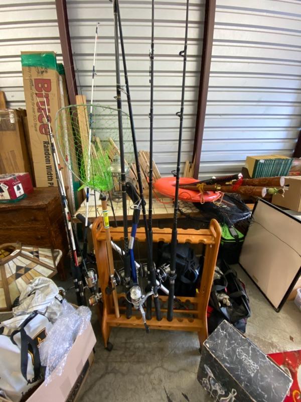 Fishing Poles (11) Wood Pole Holder, Nets, Hook, Life Ring, Large Nets Lot 293