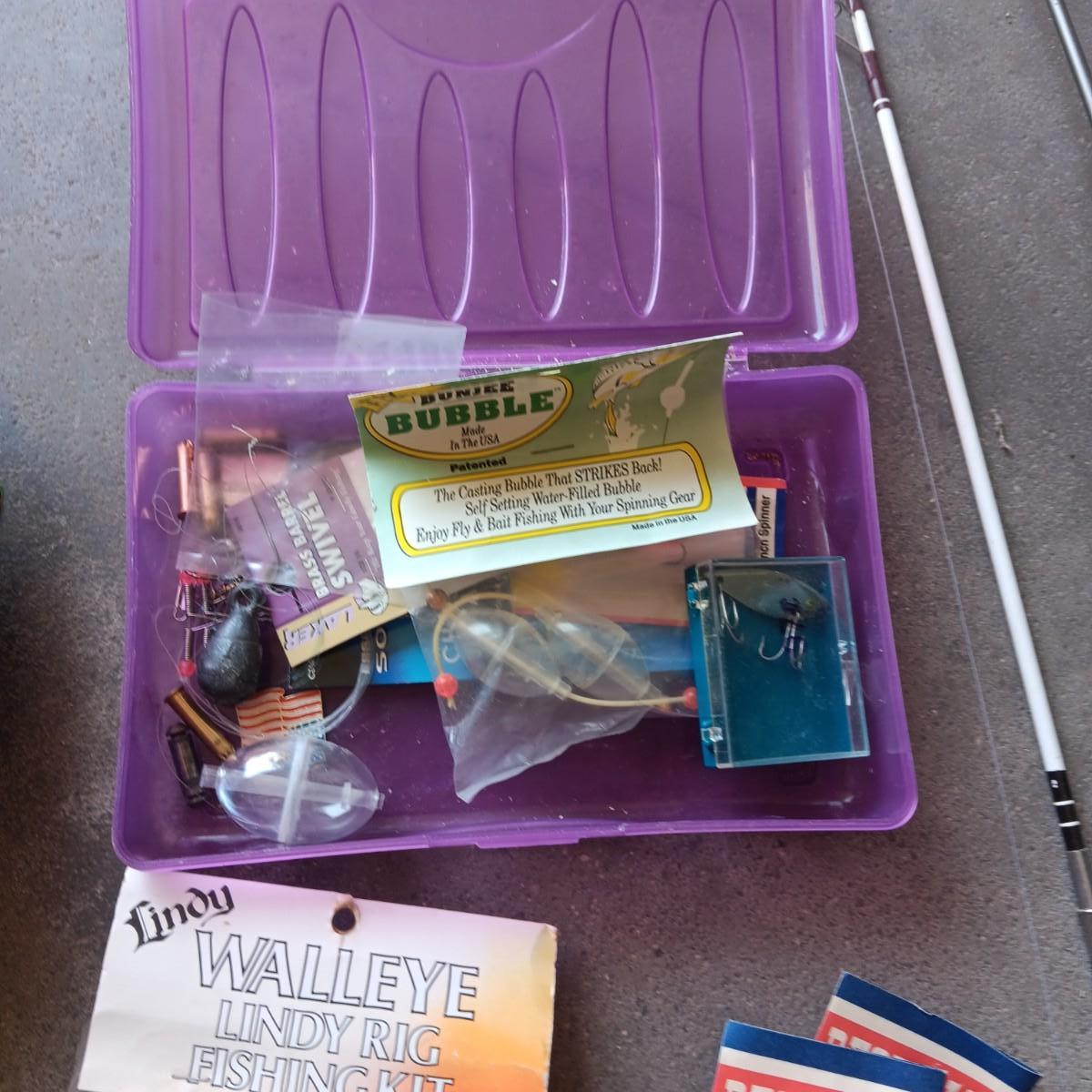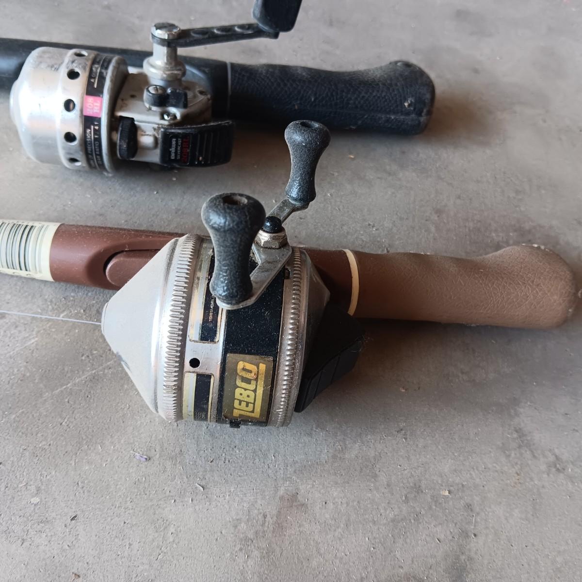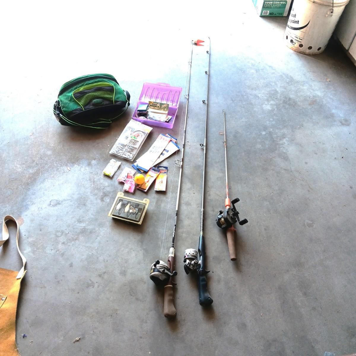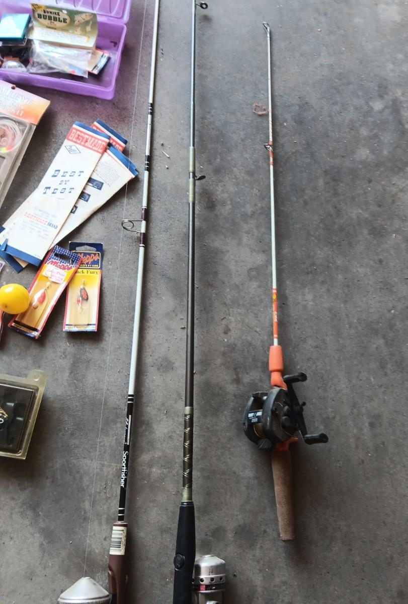 FISHING POLES W/REELS, TACKLE AND THERMOS COOLER