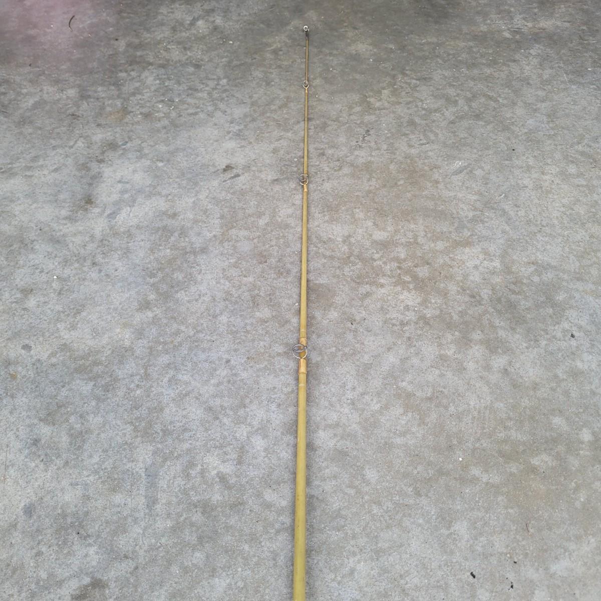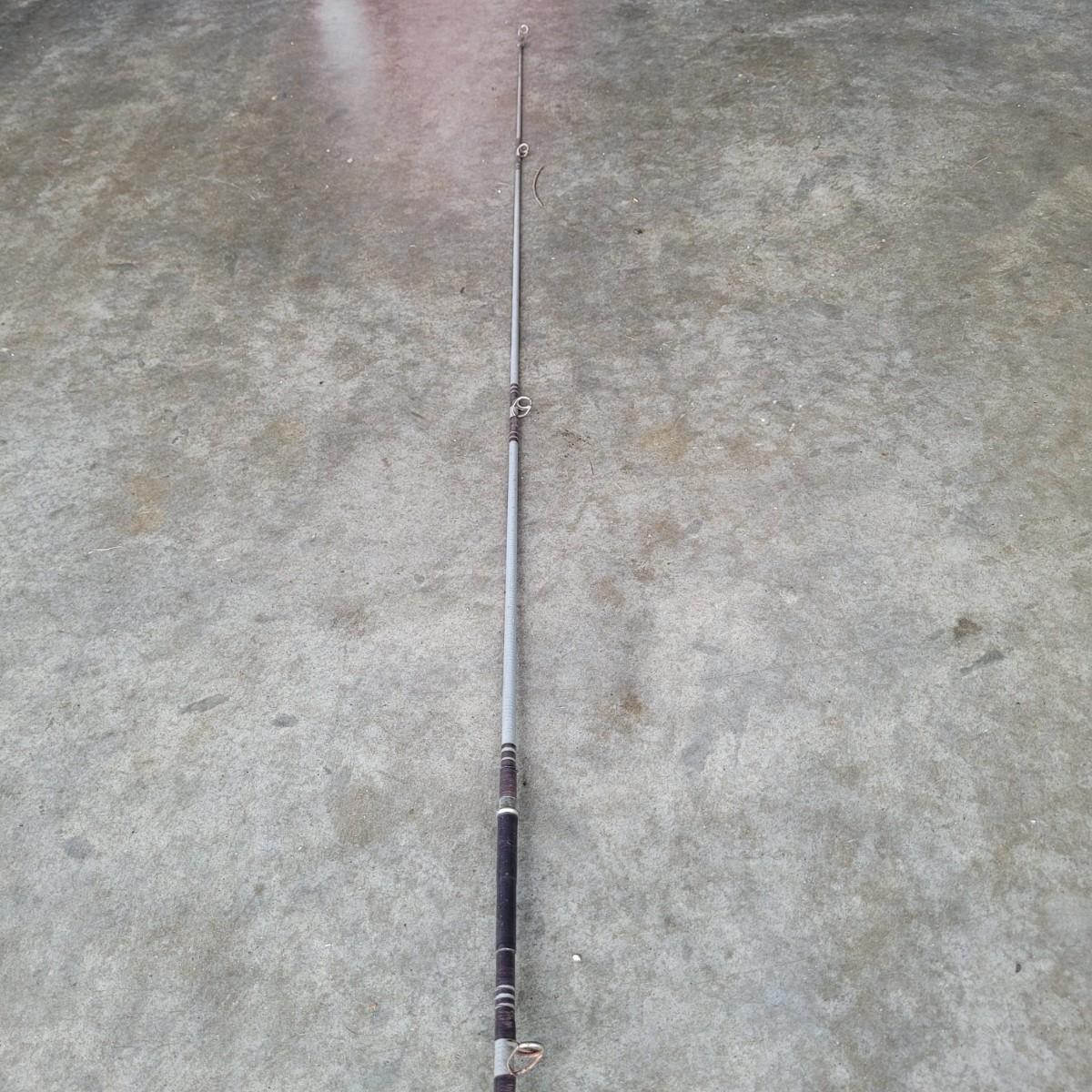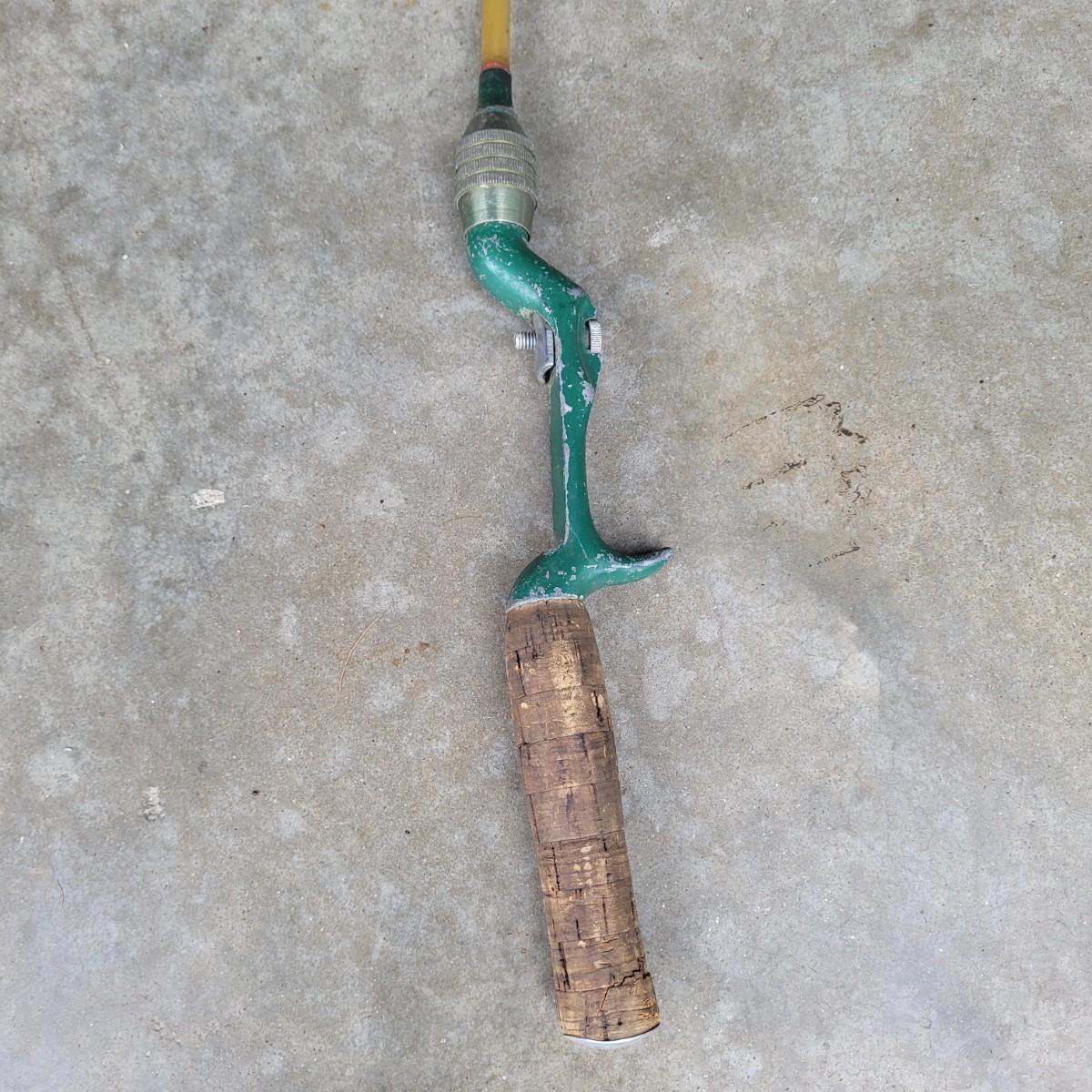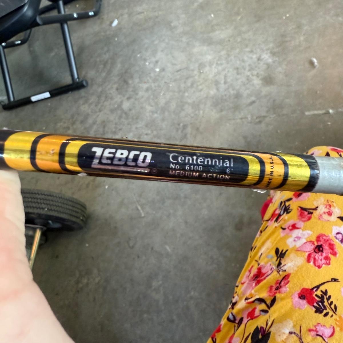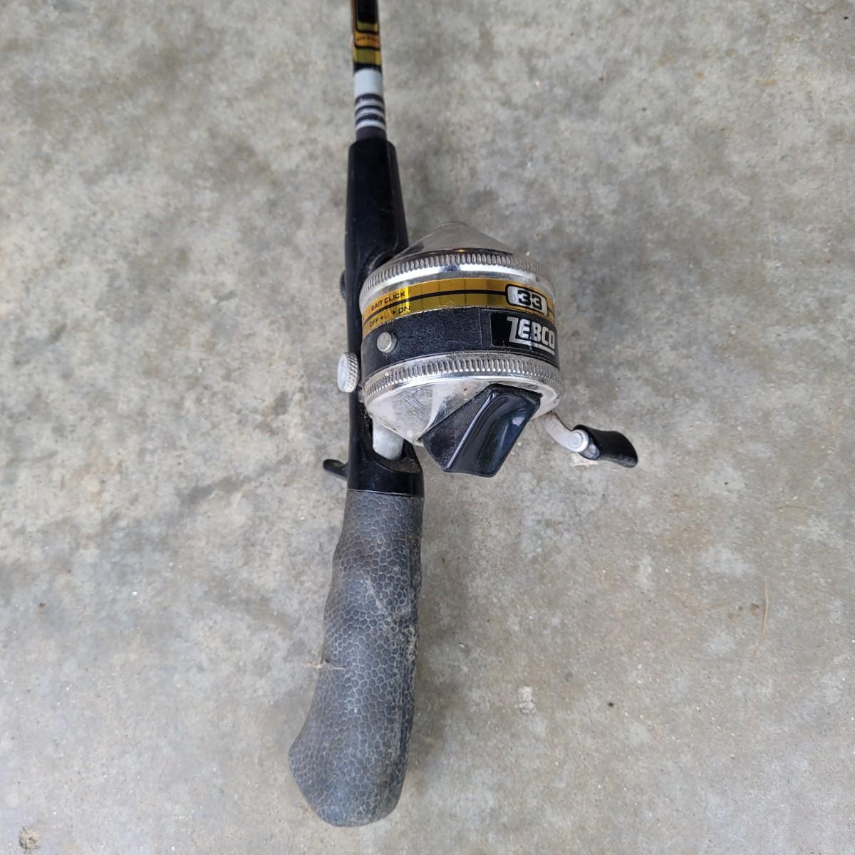 This lot includes three fishing rods. The first rod and reel is a Zebco 33 and this one measures 66”. It does not include fishing line and has not been tested. The second rod and reel is a Zebco 202. It is strung and appears to be in working order. The third rod (rod only) is a vintage looking rod that has lost some of its identifying tag. It is shorter and made from steel, fiberglass, and cork.