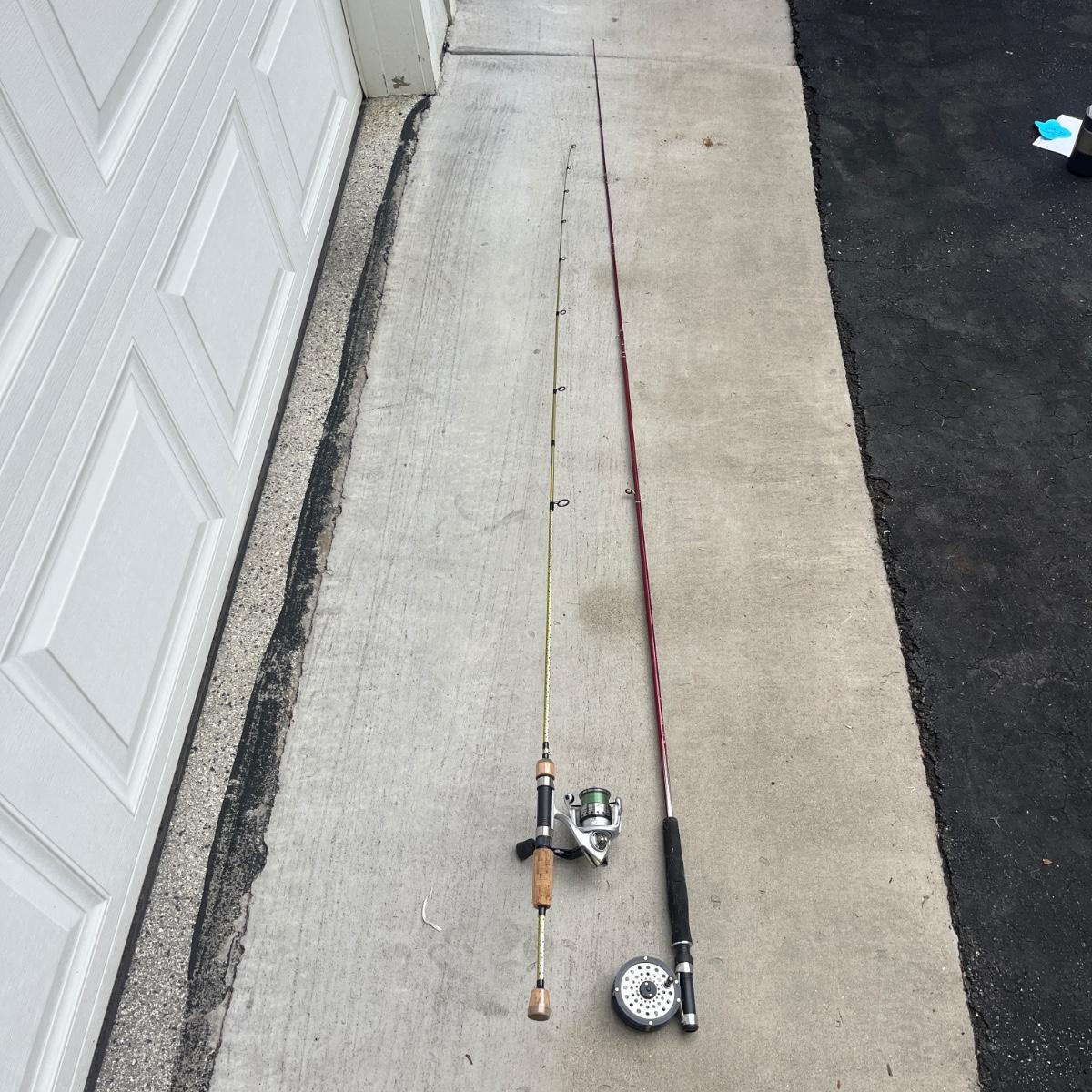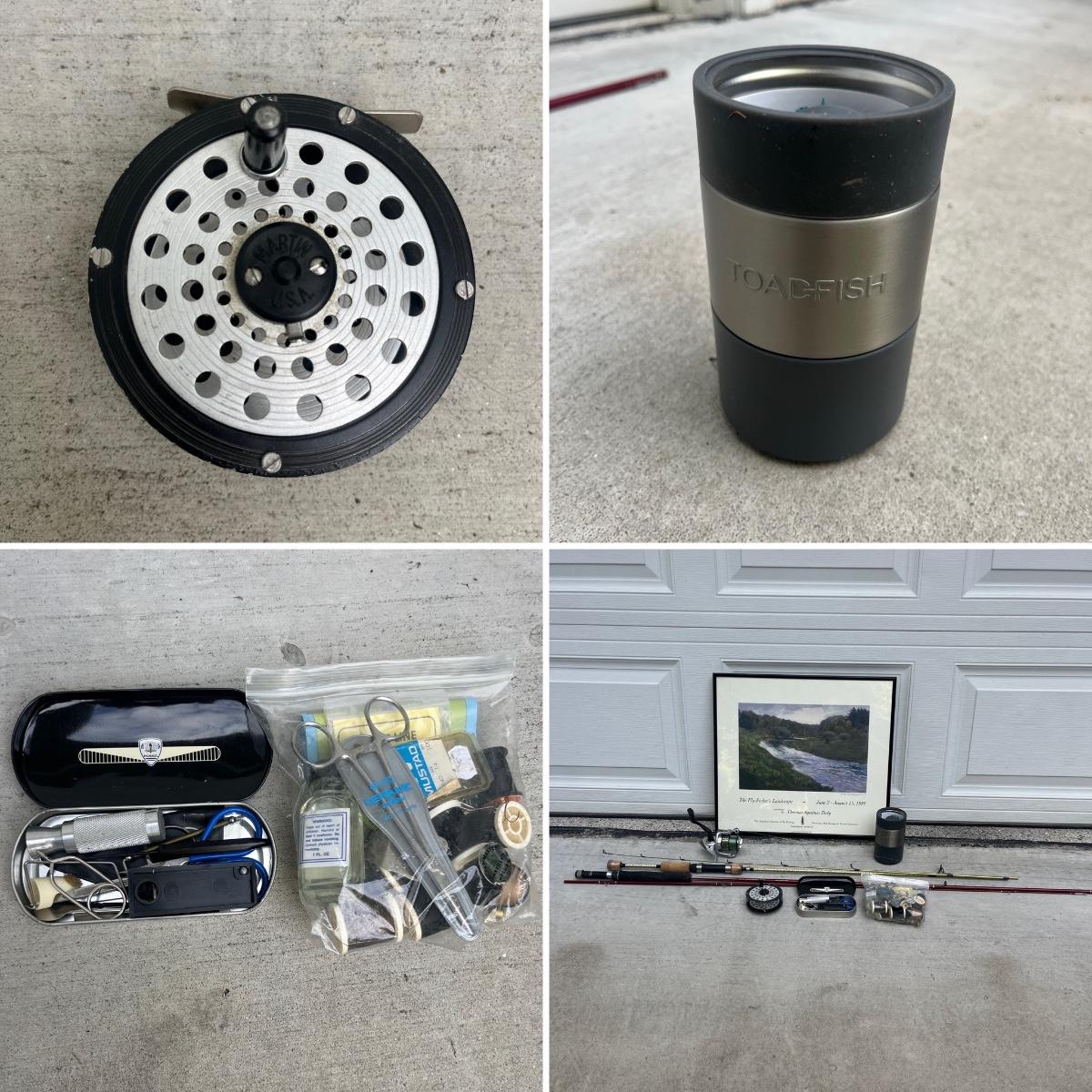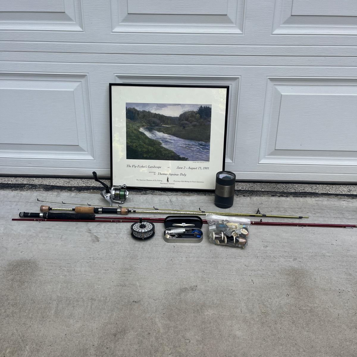 Lot includes fly rod with reel, lightweight rod and reel, metal framed print under glass, fly tying gear and a Toadfish non tipping can cooler. Frame measures 19” x 17”H and longest rod measures 96”long.