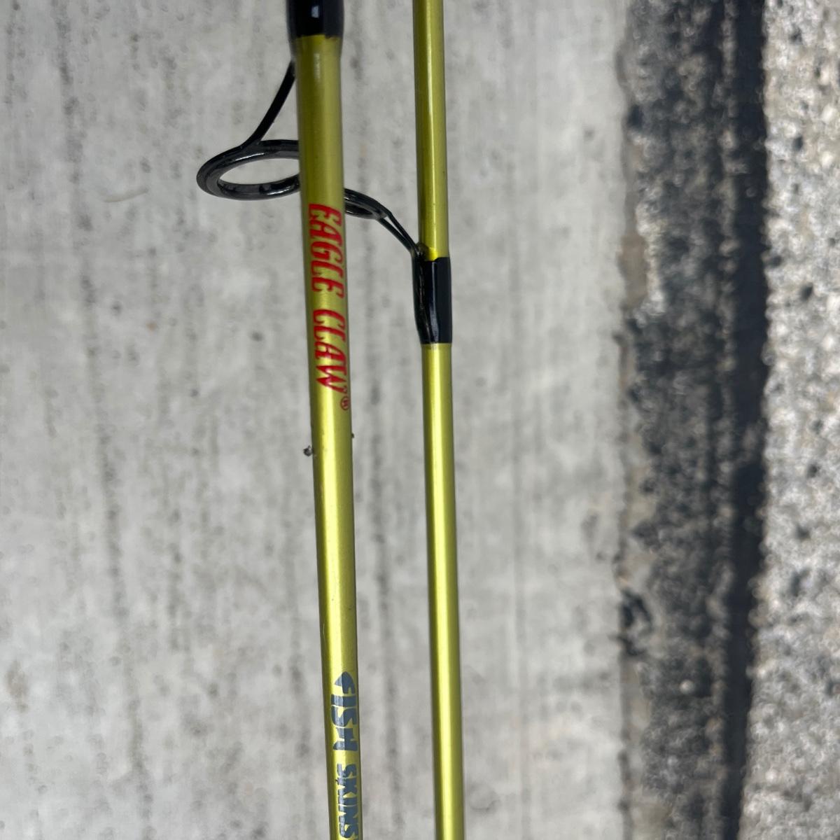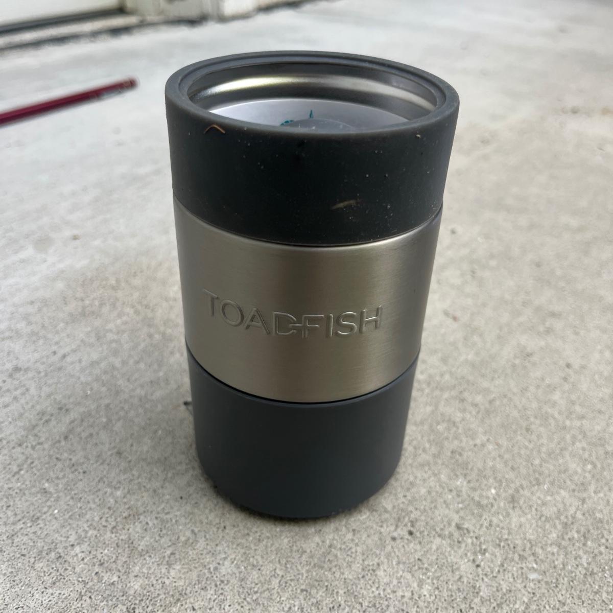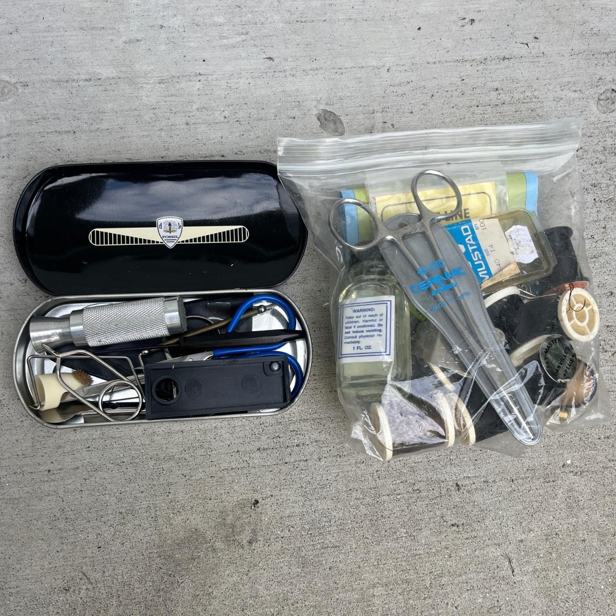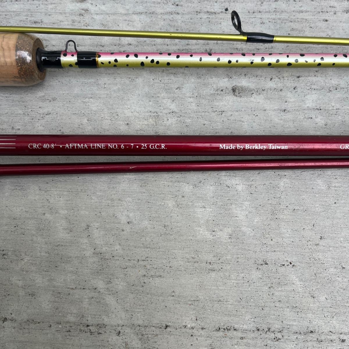 Lot includes fly rod with reel, lightweight rod and reel, metal framed print under glass, fly tying gear and a Toadfish non tipping can cooler. Frame measures 19” x 17”H and longest rod measures 96”long.