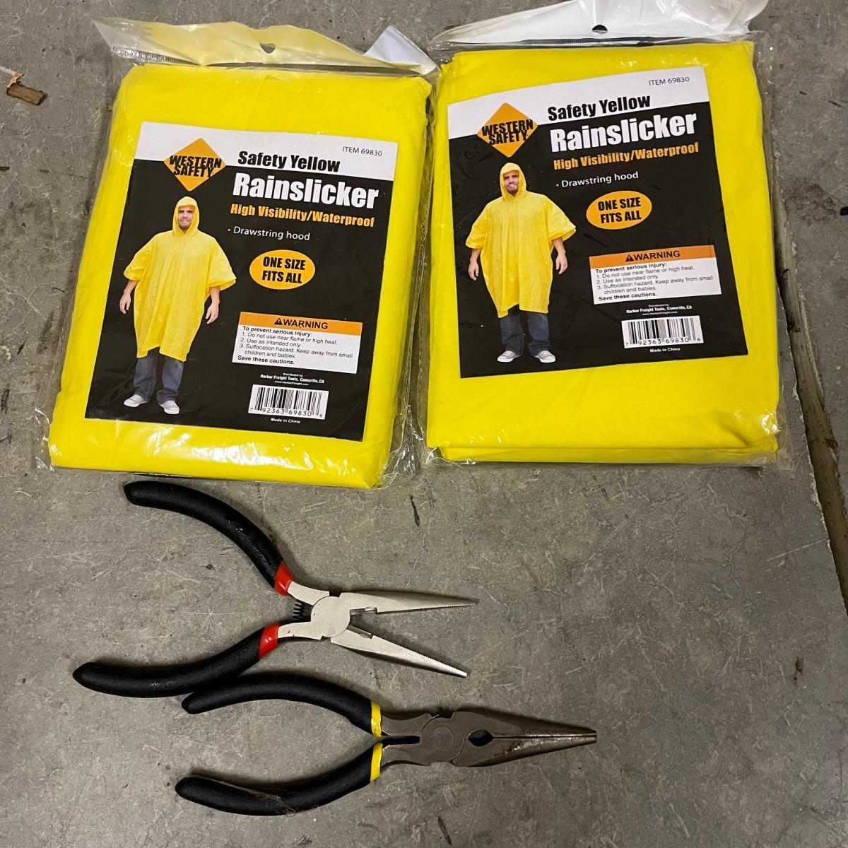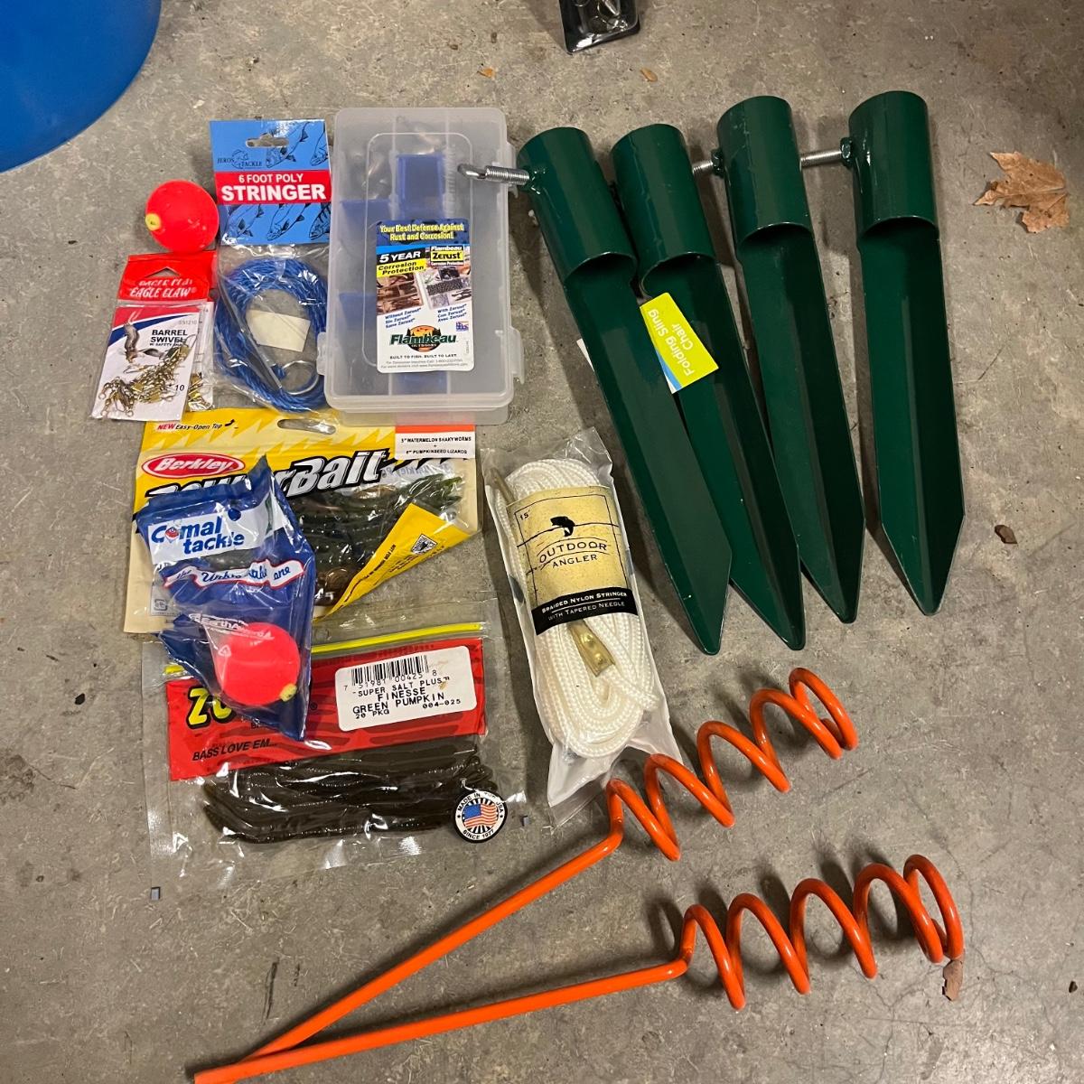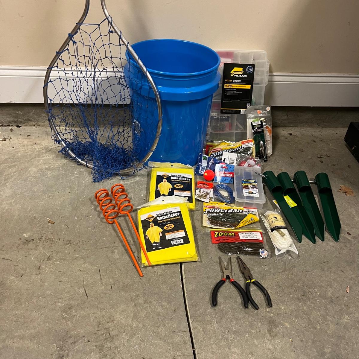 Lot contains a selection of fishing tackle that includes net, small Plano box with contents, rain slickers, pliers, plastic worms, bobbers, rod holders and more.
