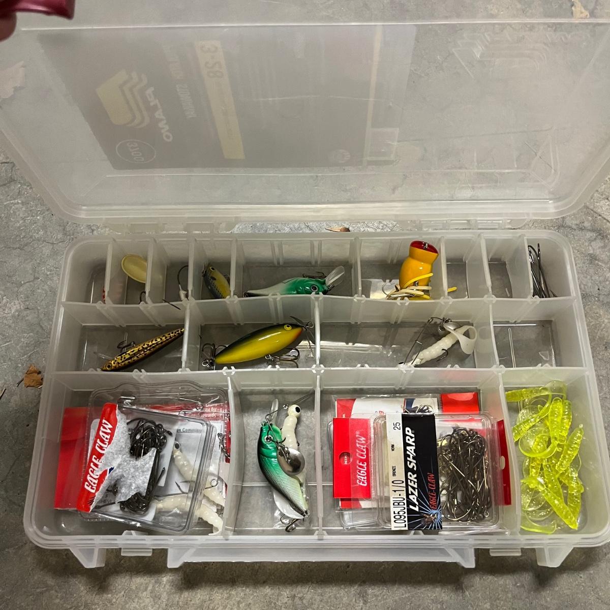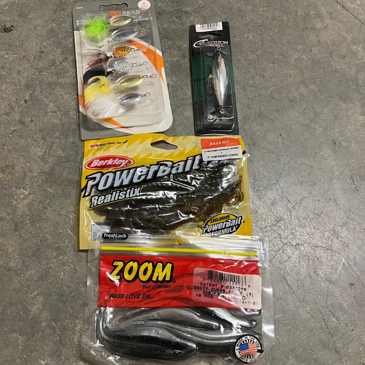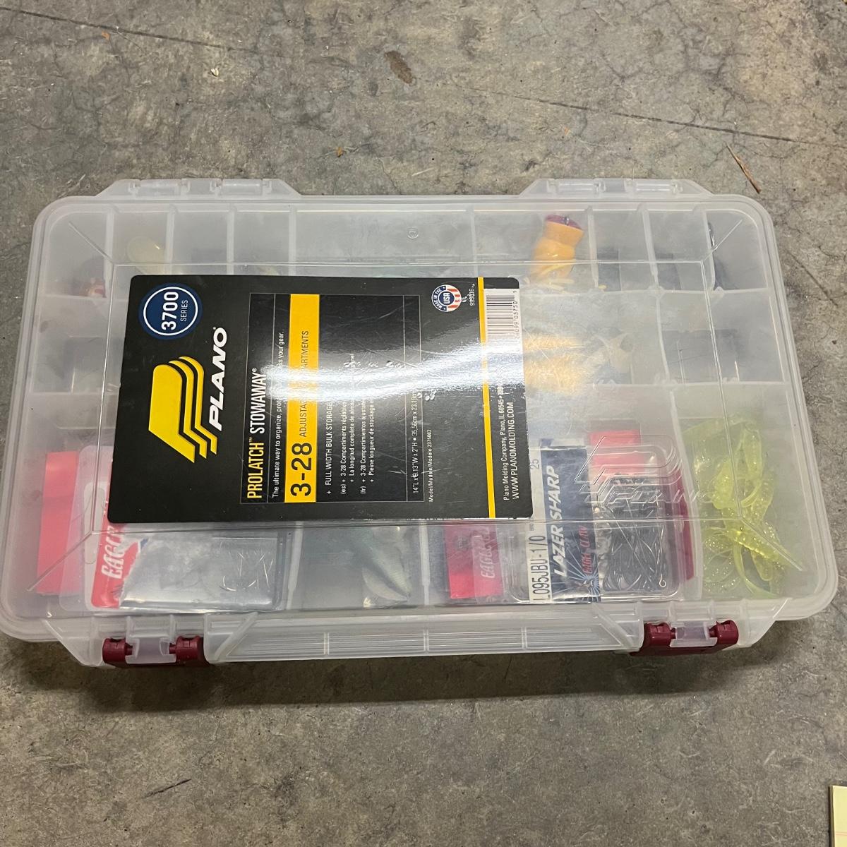 Lot contains a selection of fishing tackle that includes net, small Plano box with contents, rain slickers, pliers, plastic worms, bobbers, rod holders and more.