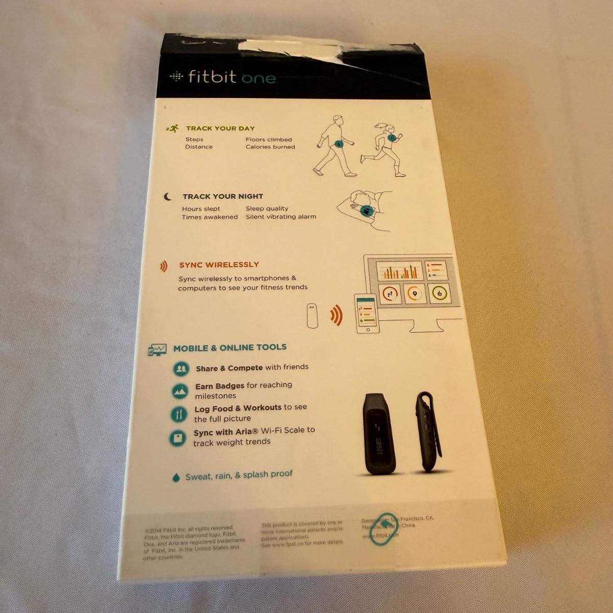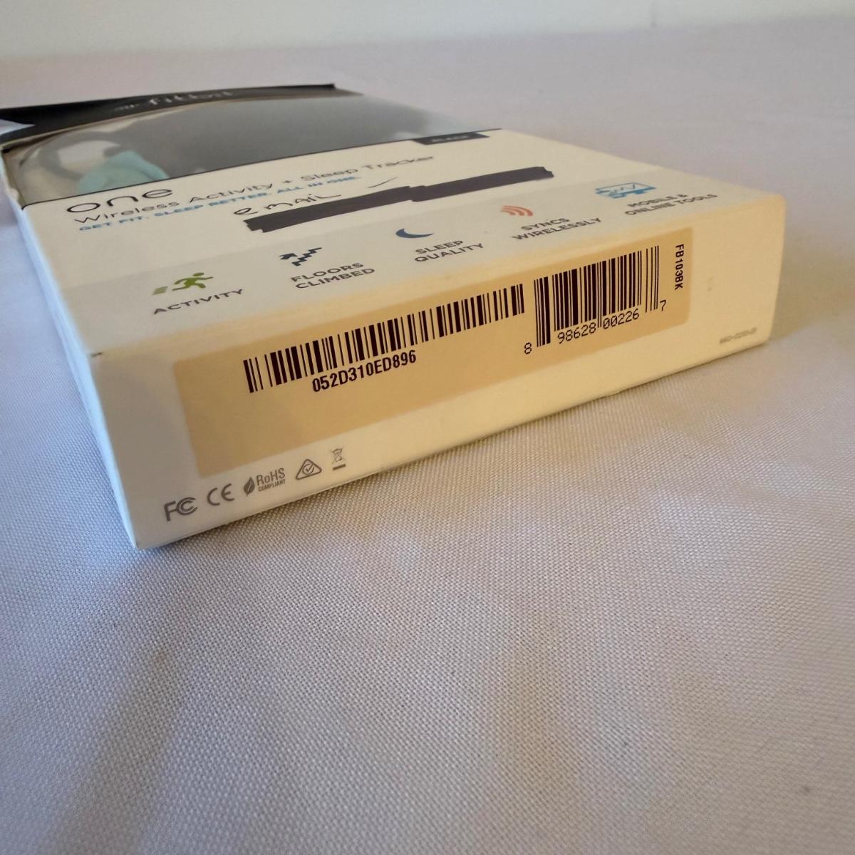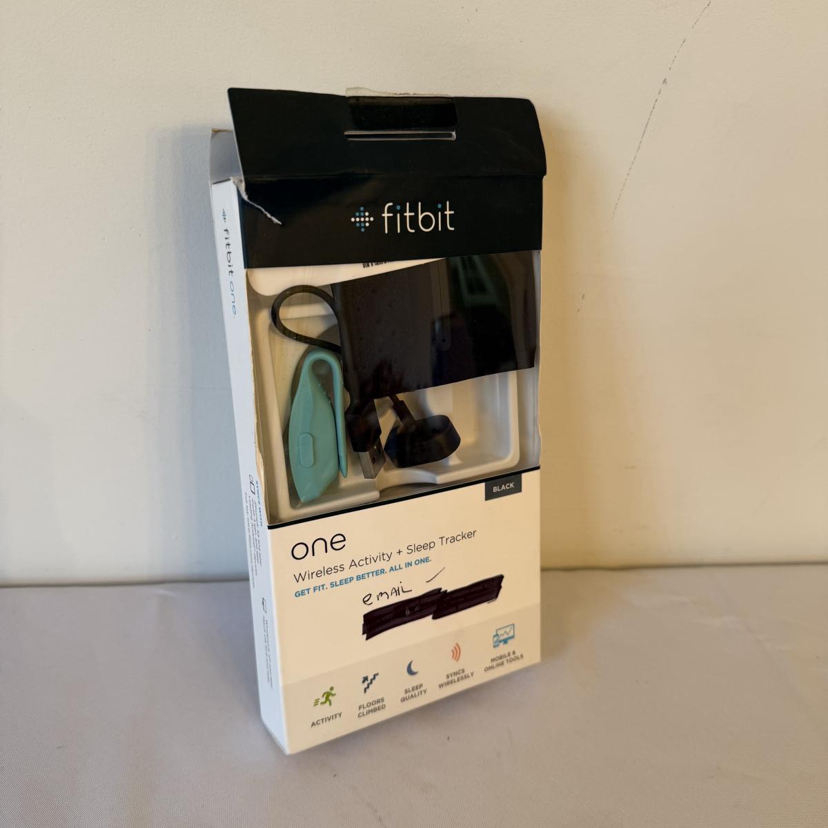 Black FitBit One comes in its original box. Included are its charge cord, clip, wristband, plus an extra unopened box with two clips and a watch band. Fitbit charged and powered on.