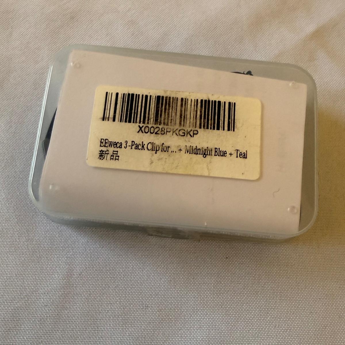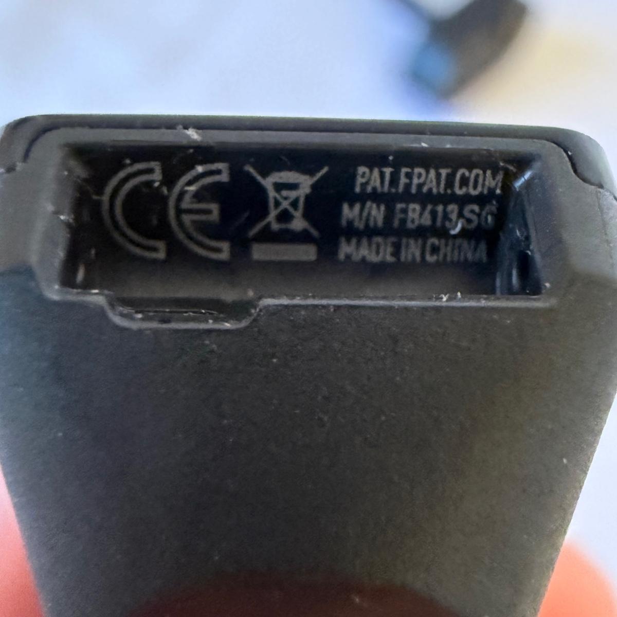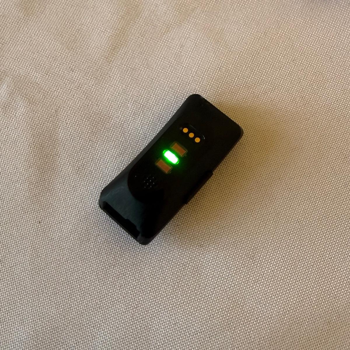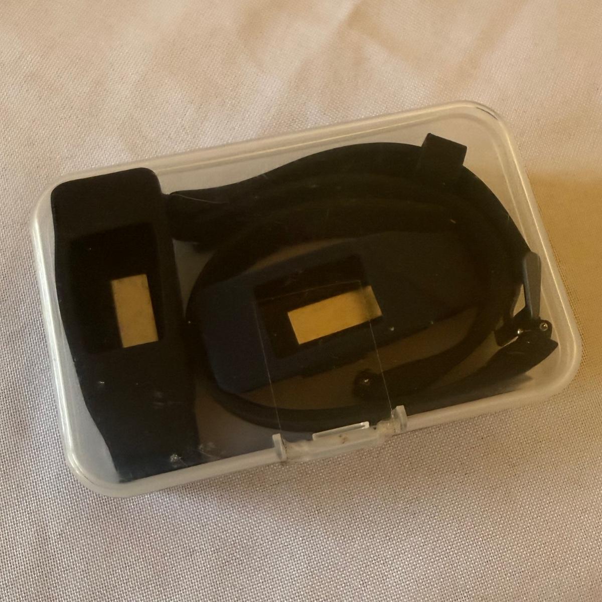 Black FitBit One comes in its original box. Included are its charge cord, clip, wristband, plus an extra unopened box with two clips and a watch band. Fitbit charged and powered on.