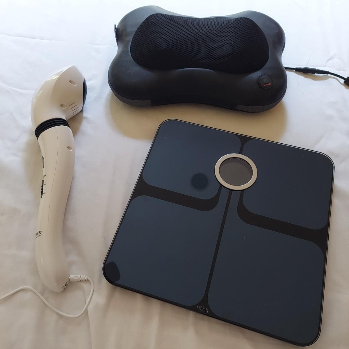 This Fitbit Smart Scale comes with two personal massagers. Scale is 12"sq. Zyllion neck massager plugged in and powered on. The Lumiere hot and cold cellulite massager also plugged in and powered on. Shipping available