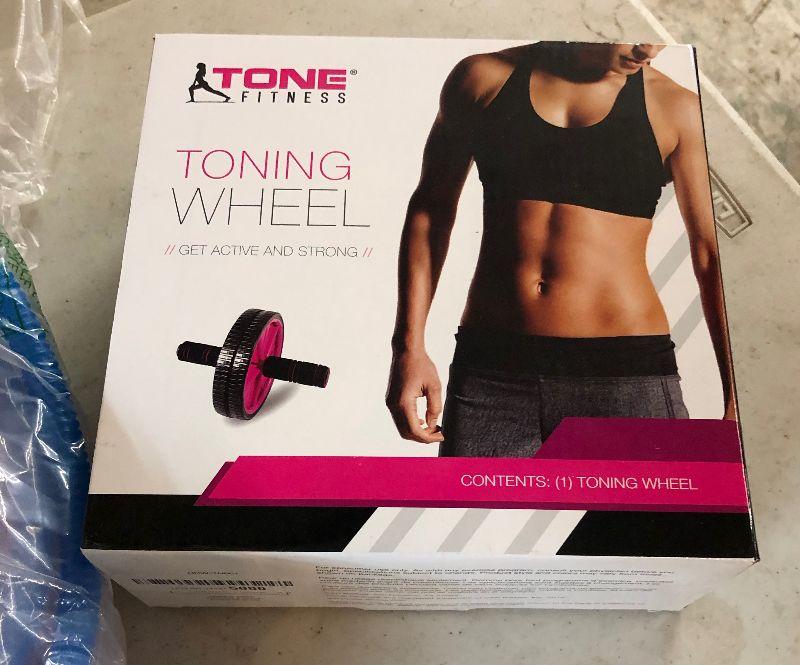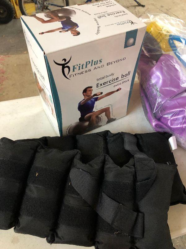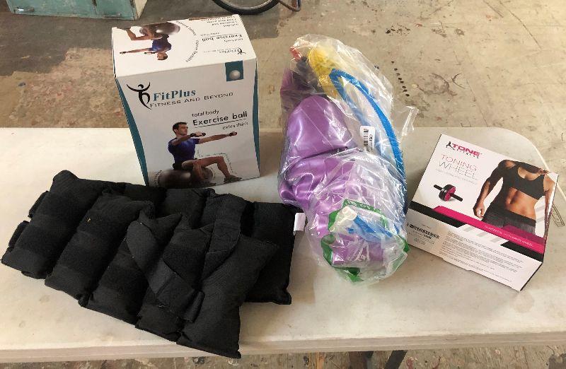 New condition on this exercise equipment lot with Fitness Toner Wheel..Yoga ball and Leg weights...