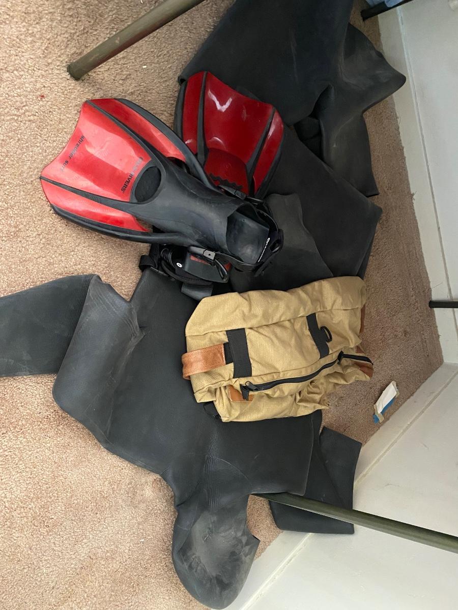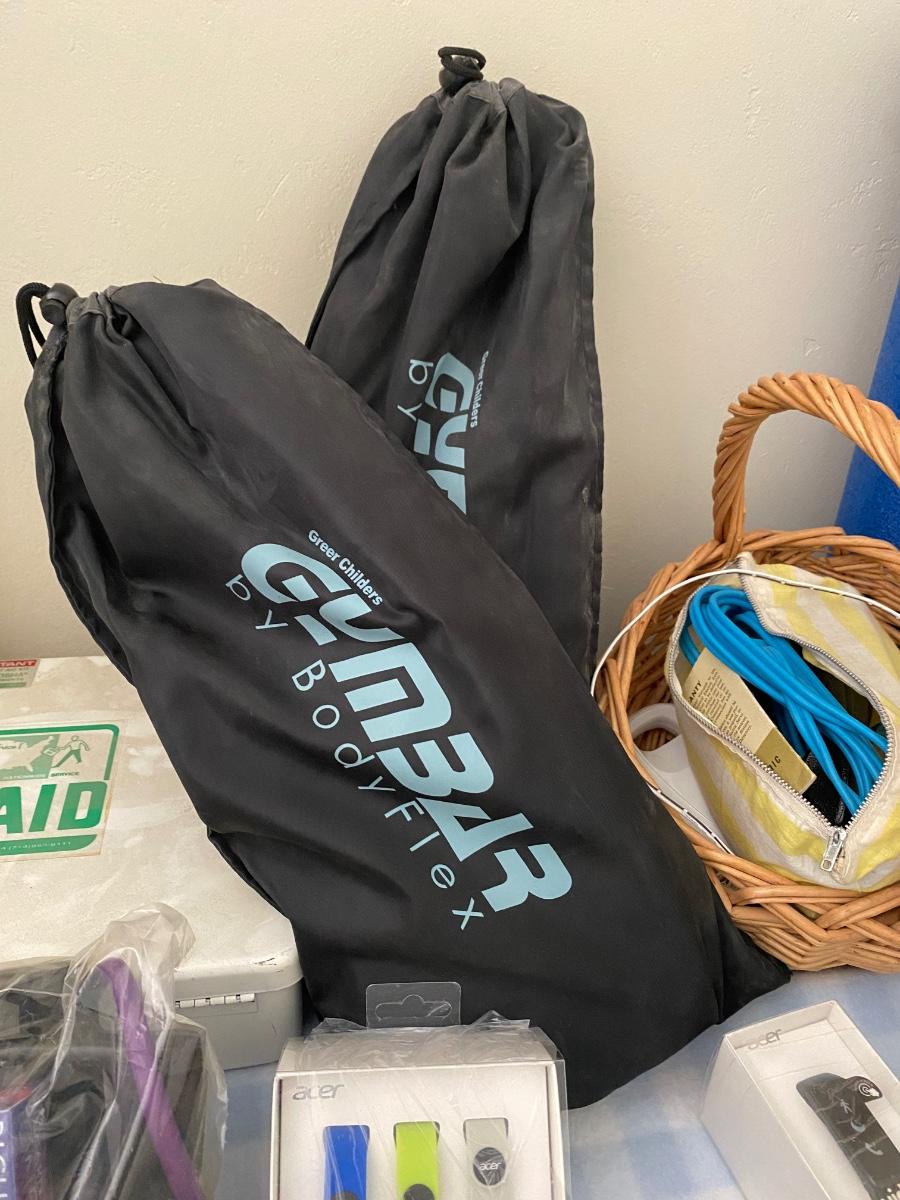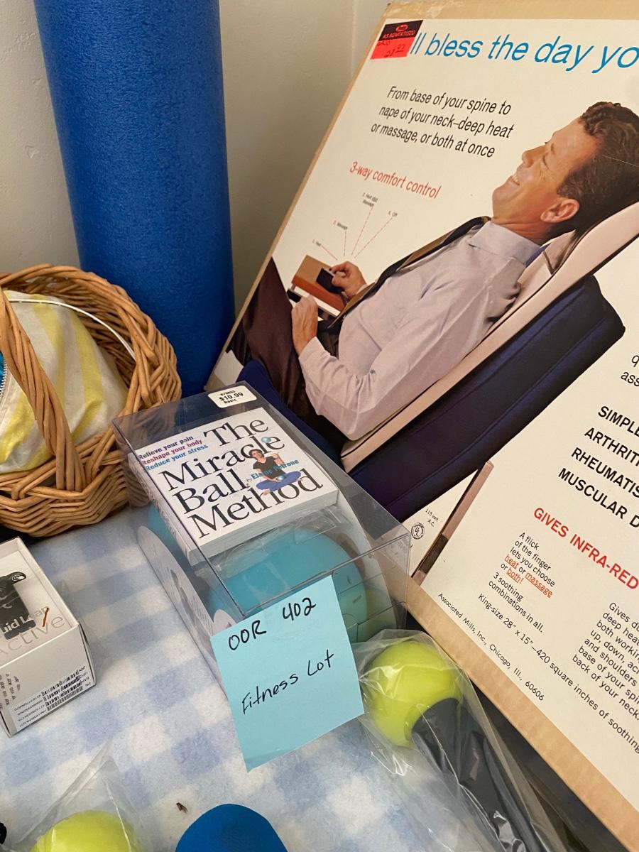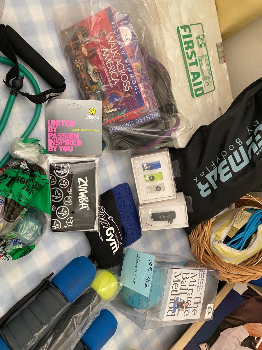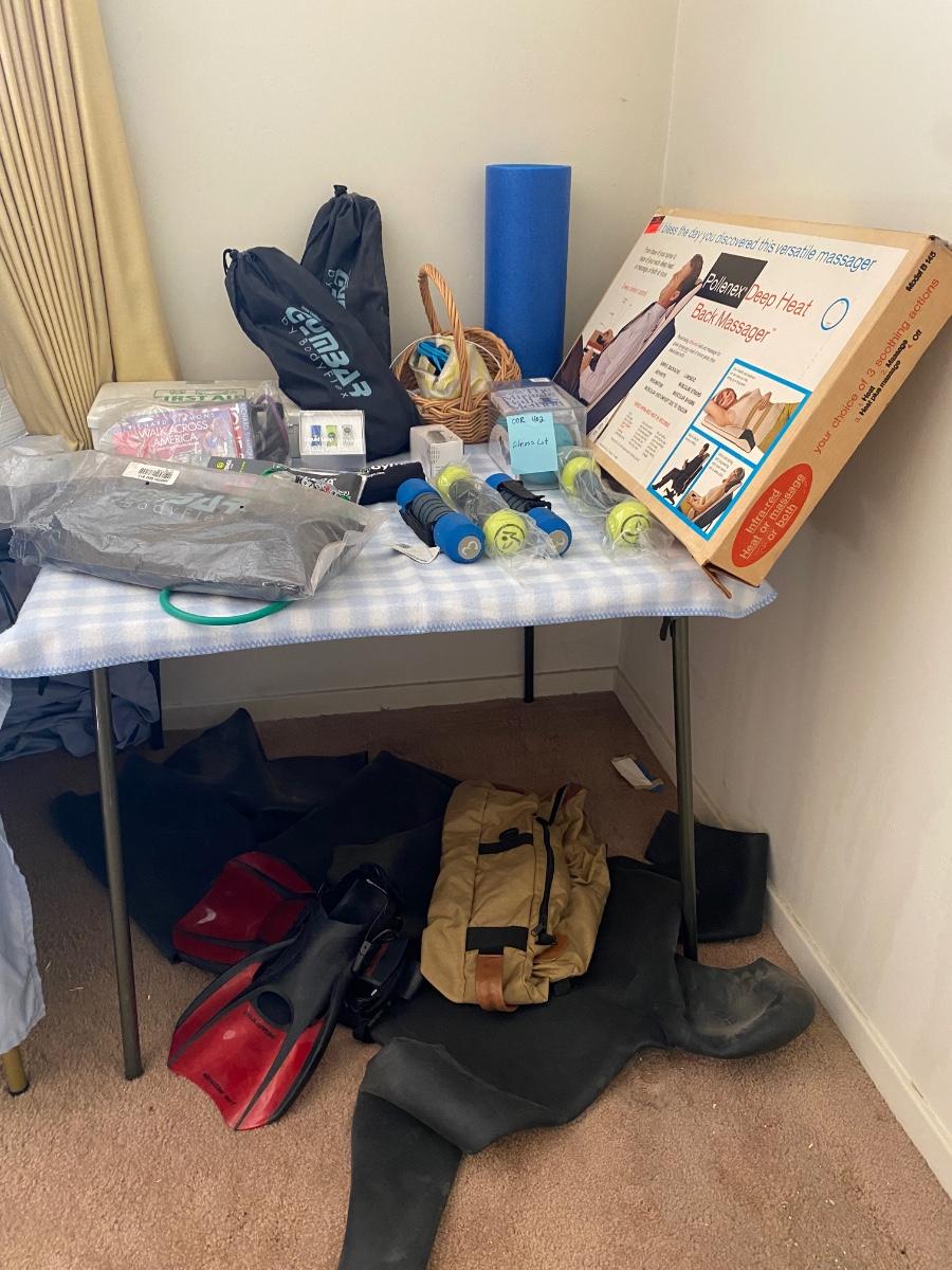 Gym bars, weights, Richard Simmons walking program, back massager, US divers fins and wet suit.