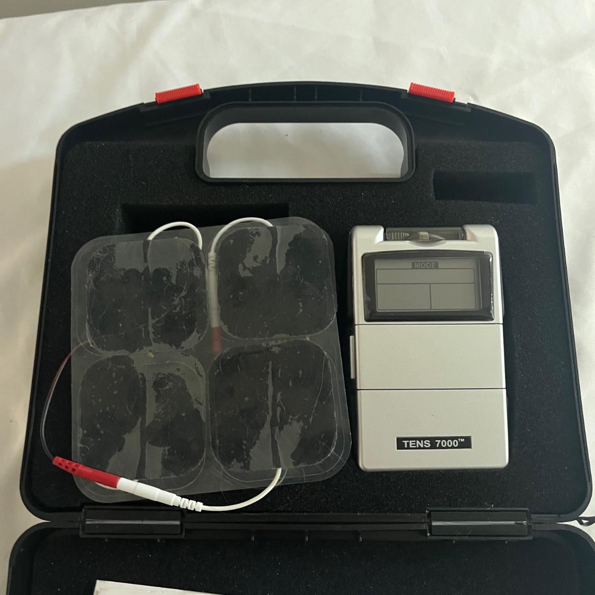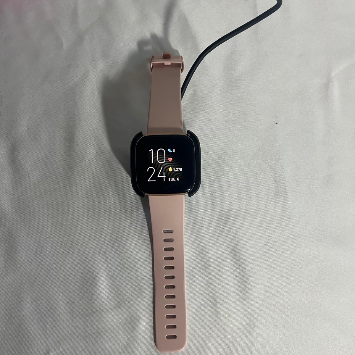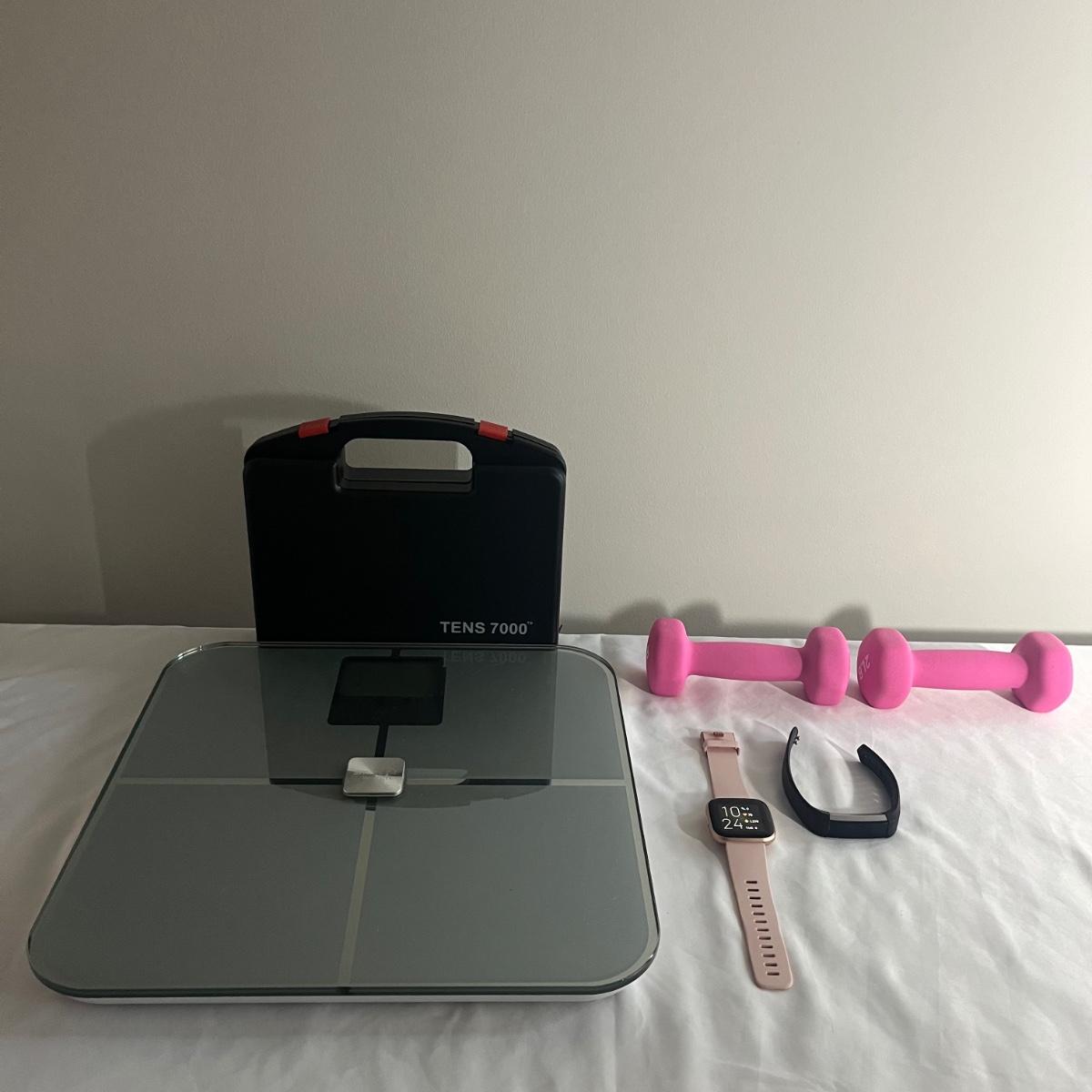 Lot includes a Smart Weigh scale, Tens 7000 unit, two 2 lb weights, Fitbit model # FB507 smartwatch and a Fitbit. All electronics powered on when tested.