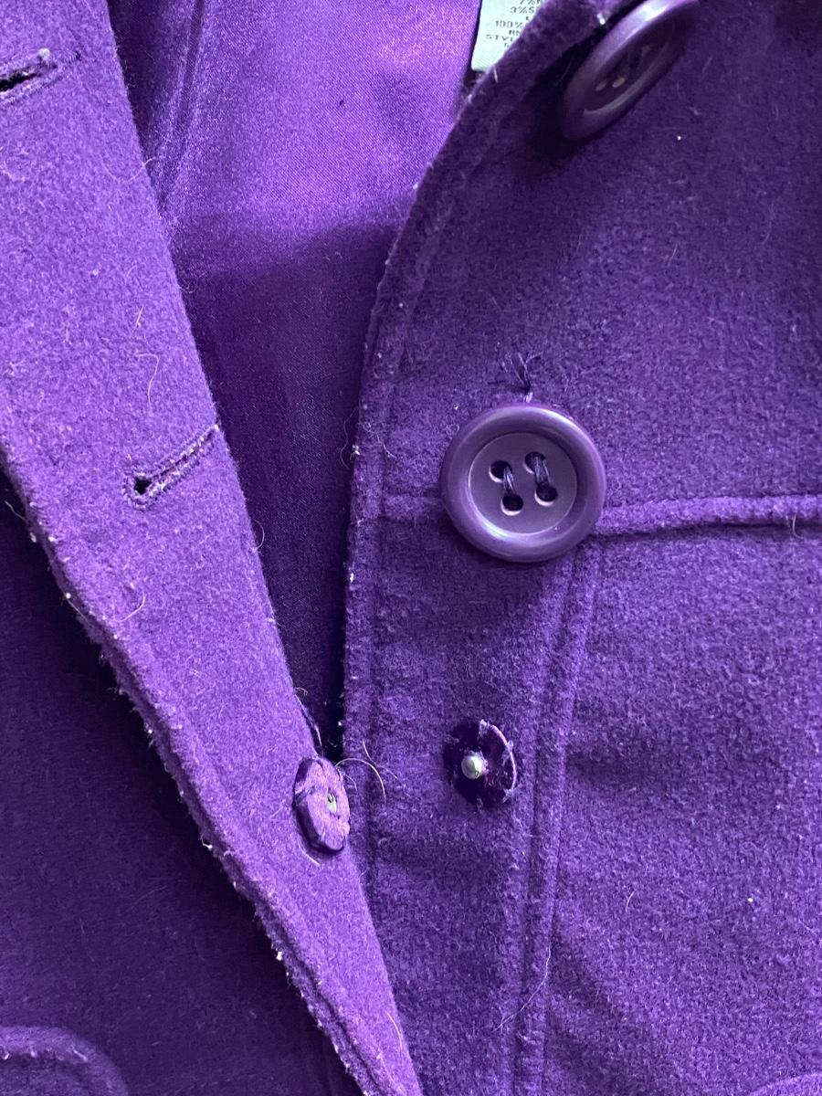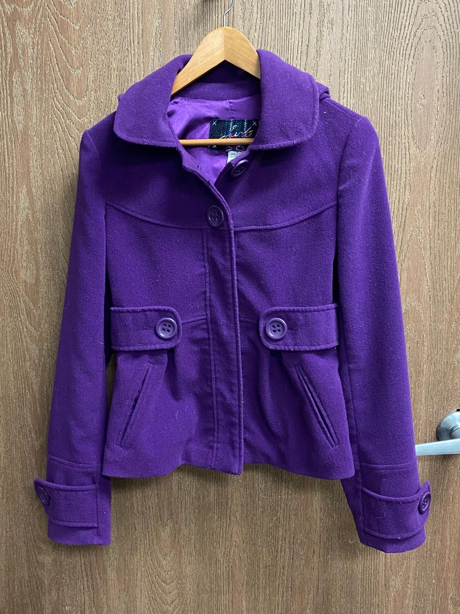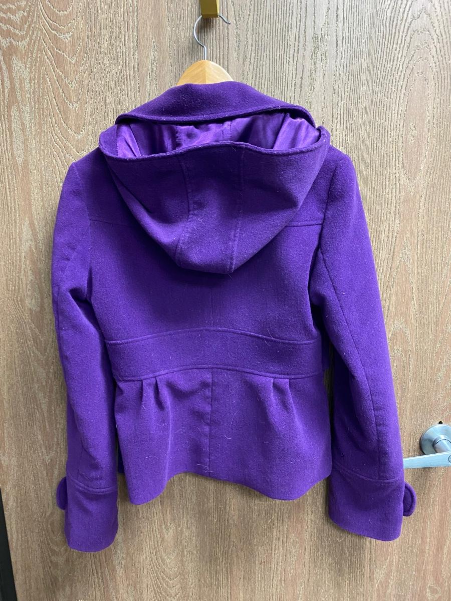 Fitted Purple Violet Jacket with Hood in Size Medium. Good worn condition. A few buttons need to be sewn on a little better, threads are coming loose that hold them in place. Hood is removeable. On the smaller side of medium.