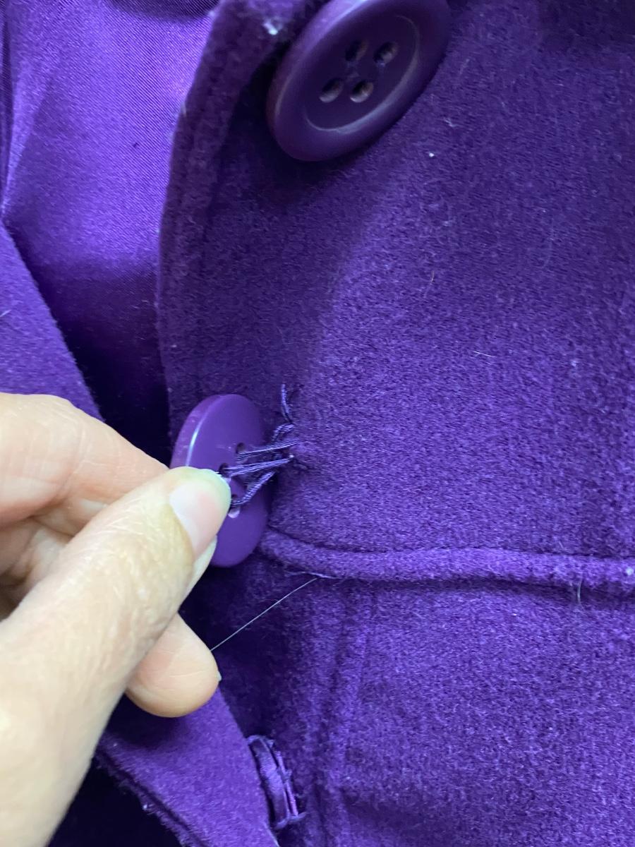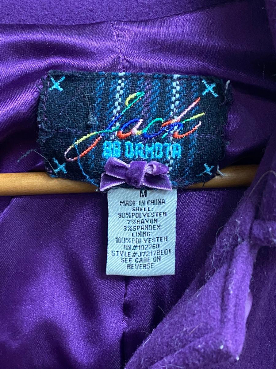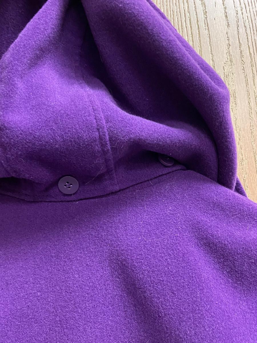 Fitted Purple Violet Jacket with Hood in Size Medium. Good worn condition. A few buttons need to be sewn on a little better, threads are coming loose that hold them in place. Hood is removeable. On the smaller side of medium.