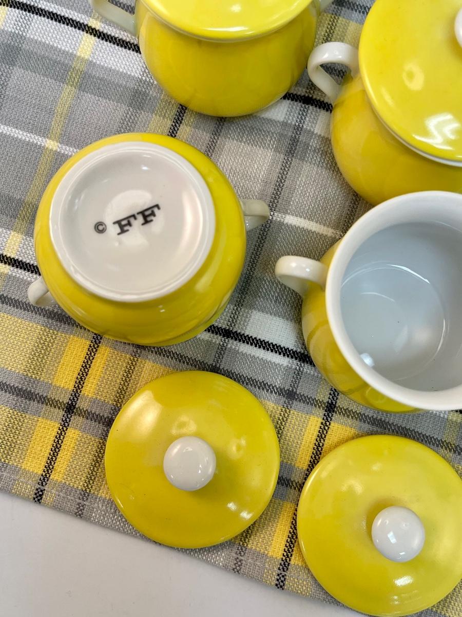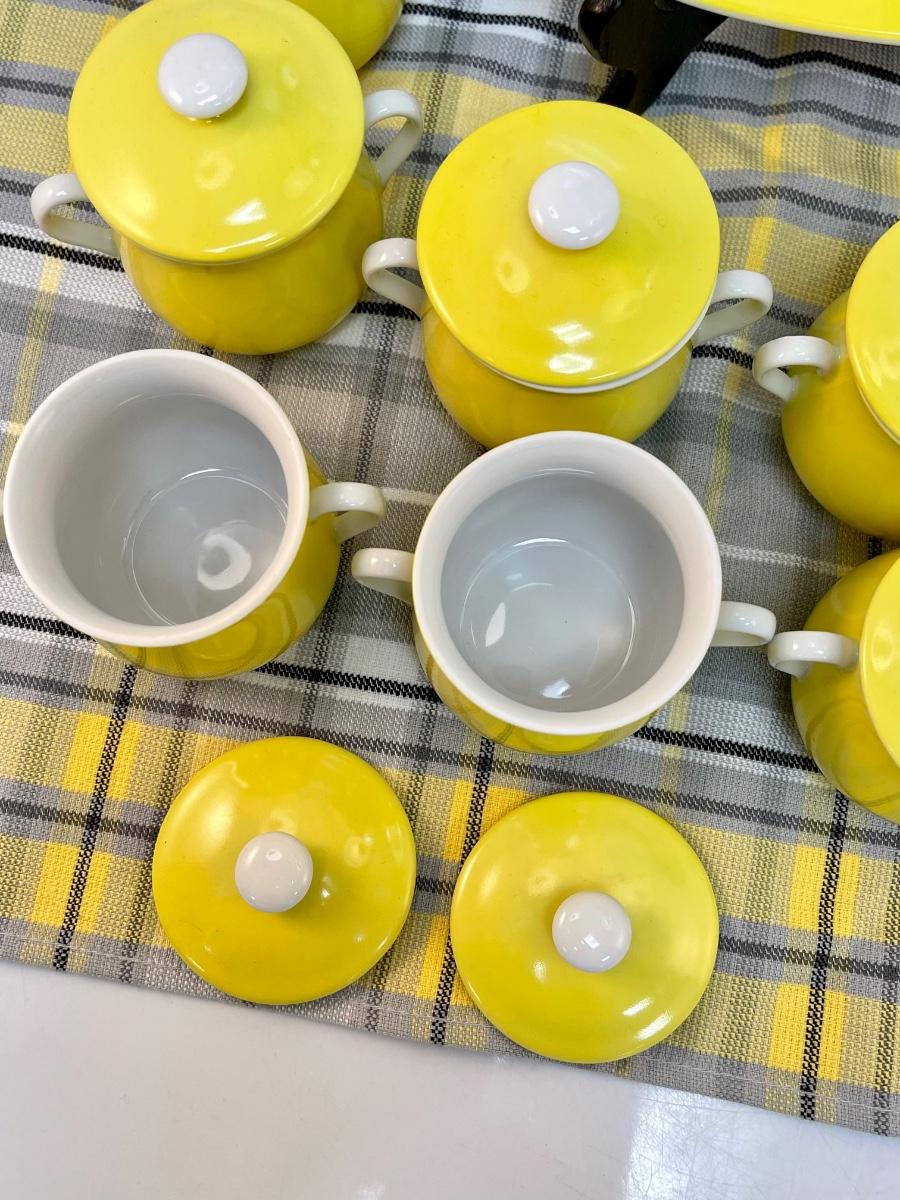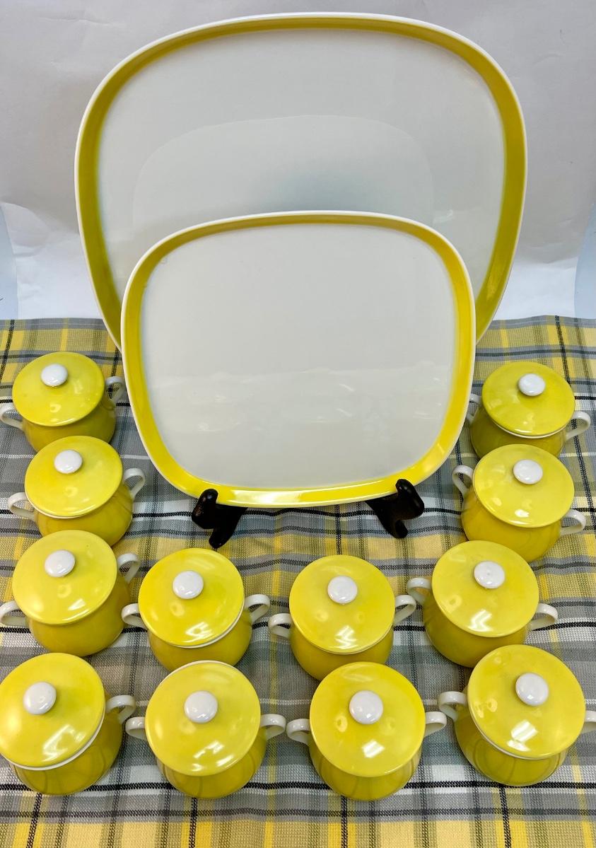 Vintage Pot de Creme Set by Fitz & Floyd "Spring Yellow". The Set consists of 14 pcs.: