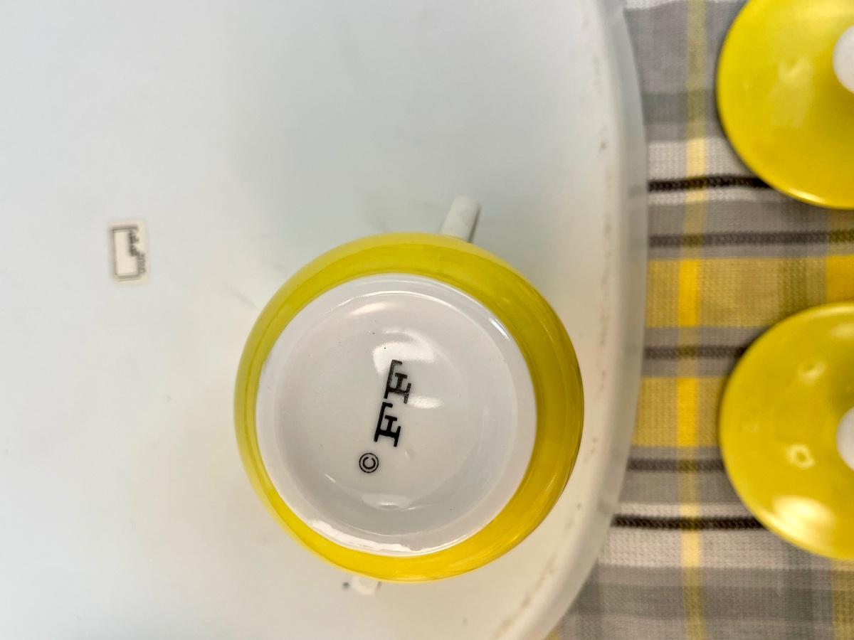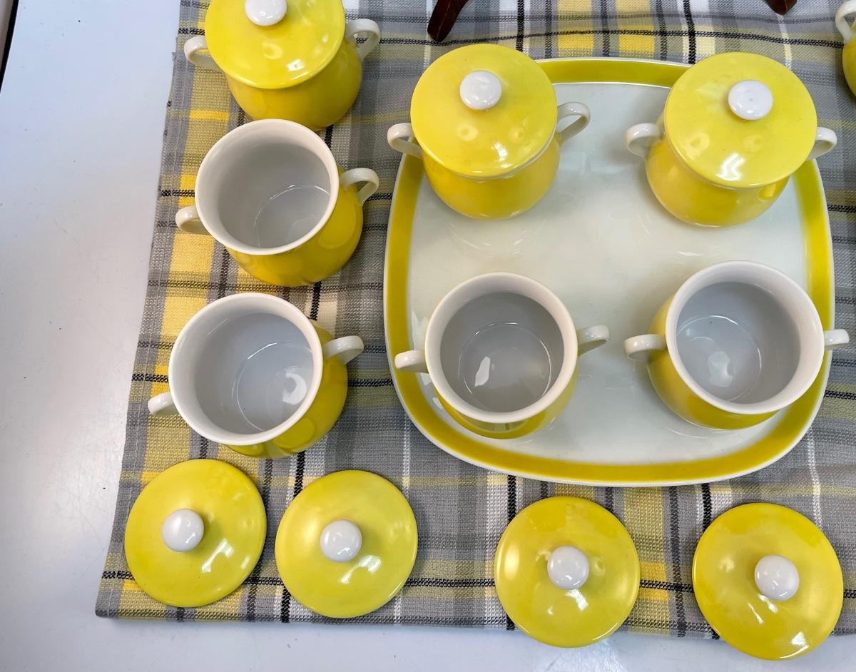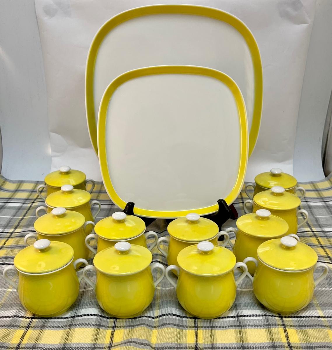Vintage Pot de Creme Set by Fitz & Floyd "Spring Yellow". The Set consists of 14 pcs.: