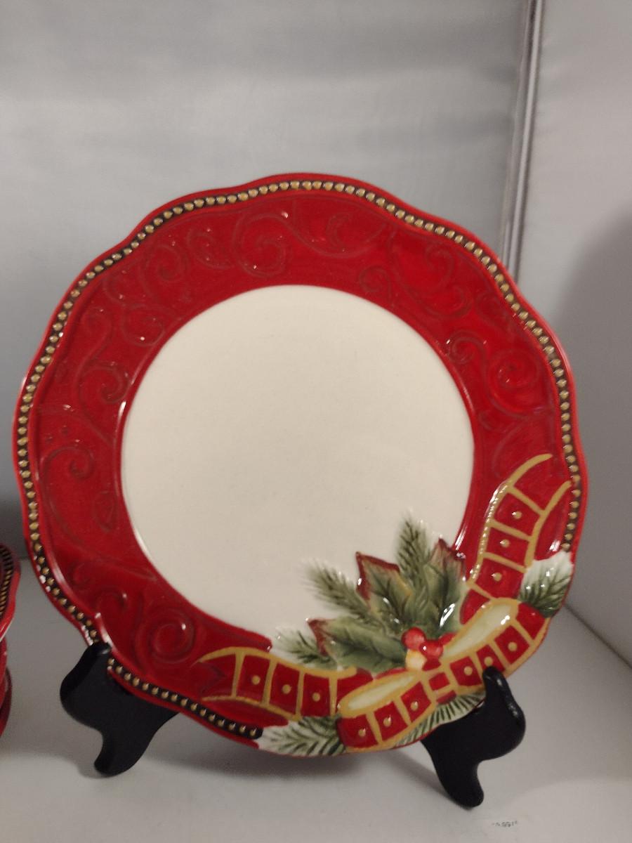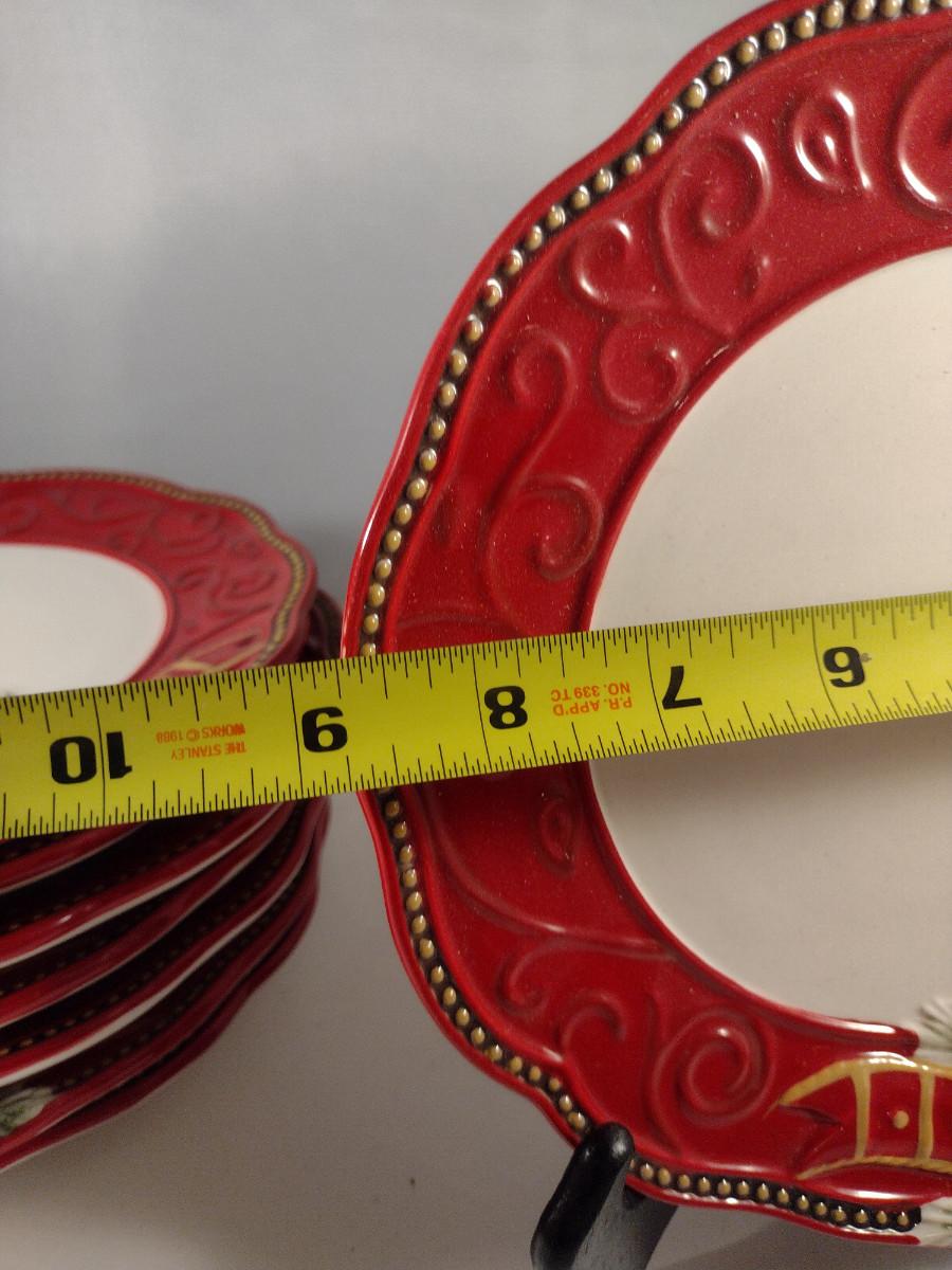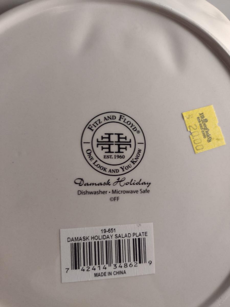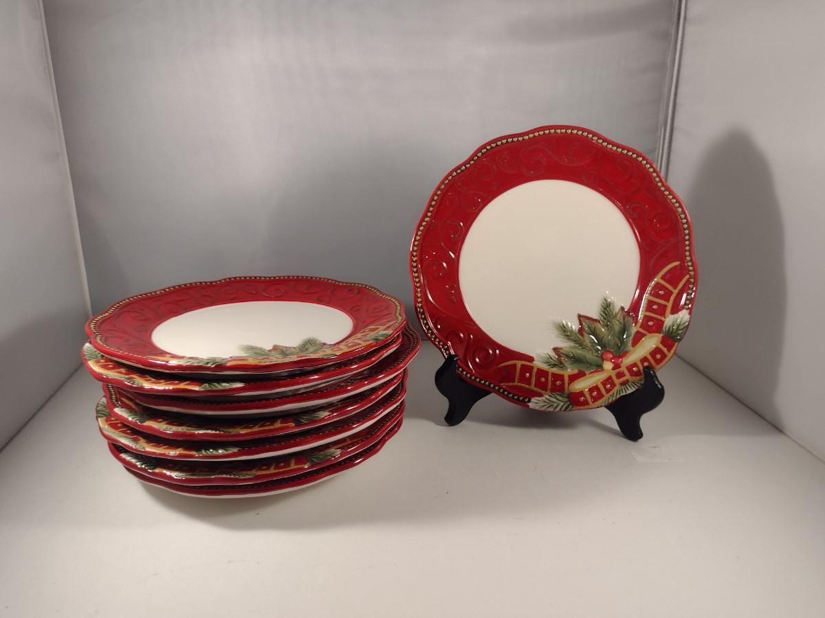 Fitz and Floyd 'Damask Holiday' Salad Plates- Eight Pieces. Items appear to be in good condition.
