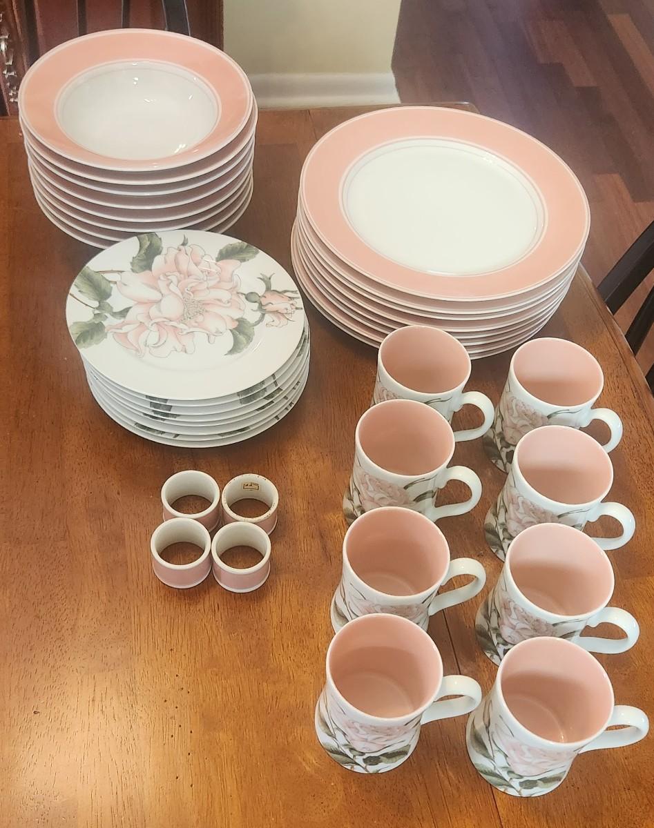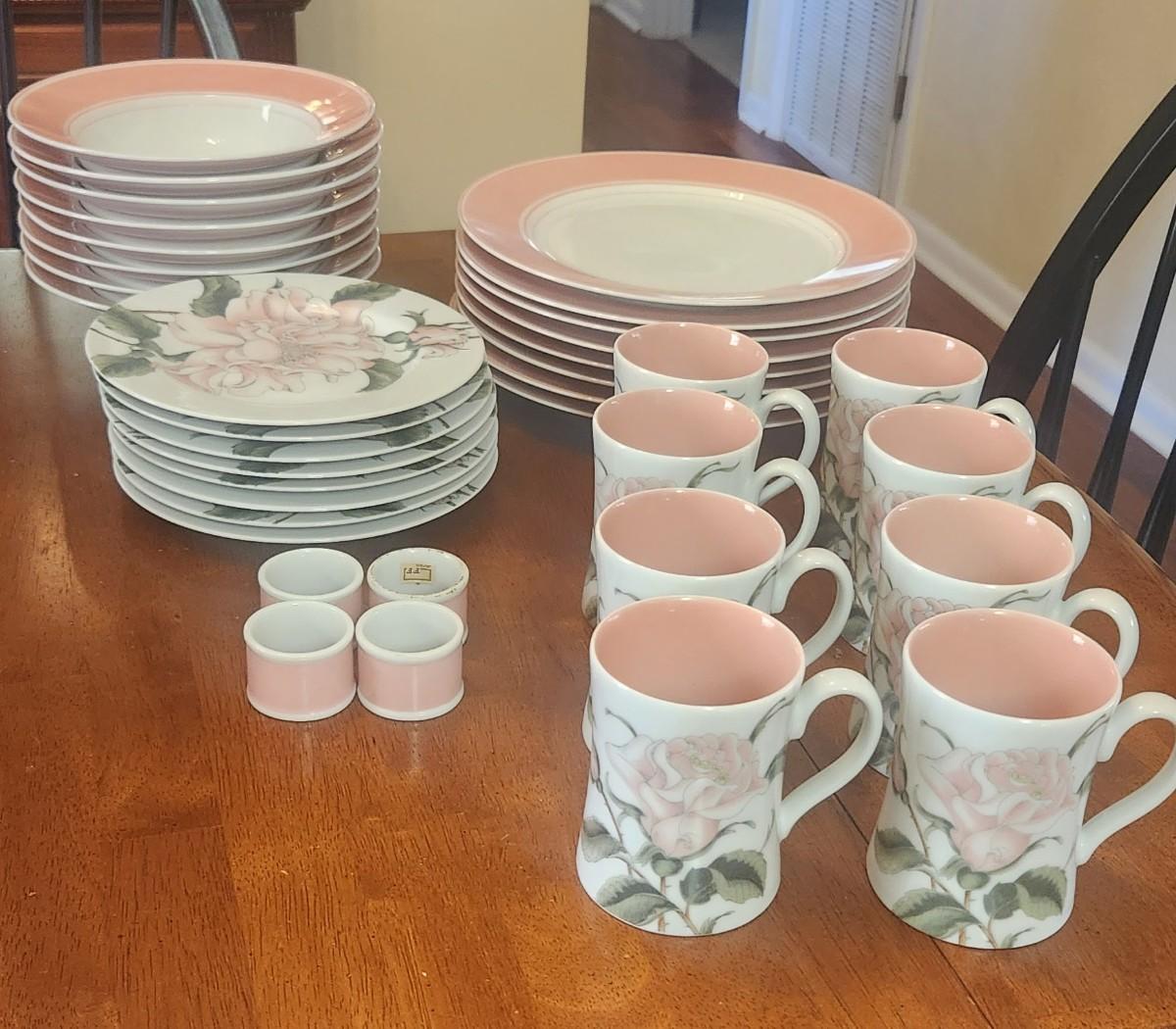 Great condition. Lovely complete set of eight pink and white dish set. Included are eight large plates, eight smaller plates, eight bowls, eight cups, and eight napkin rings (only four are shown in the photo but there are eight).