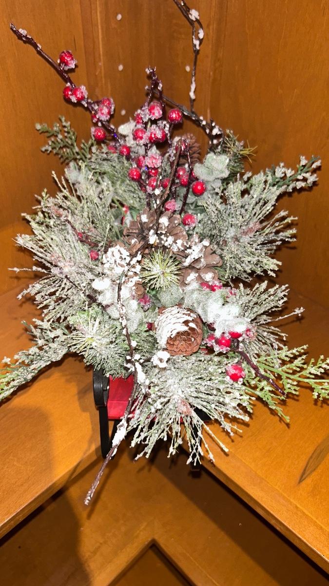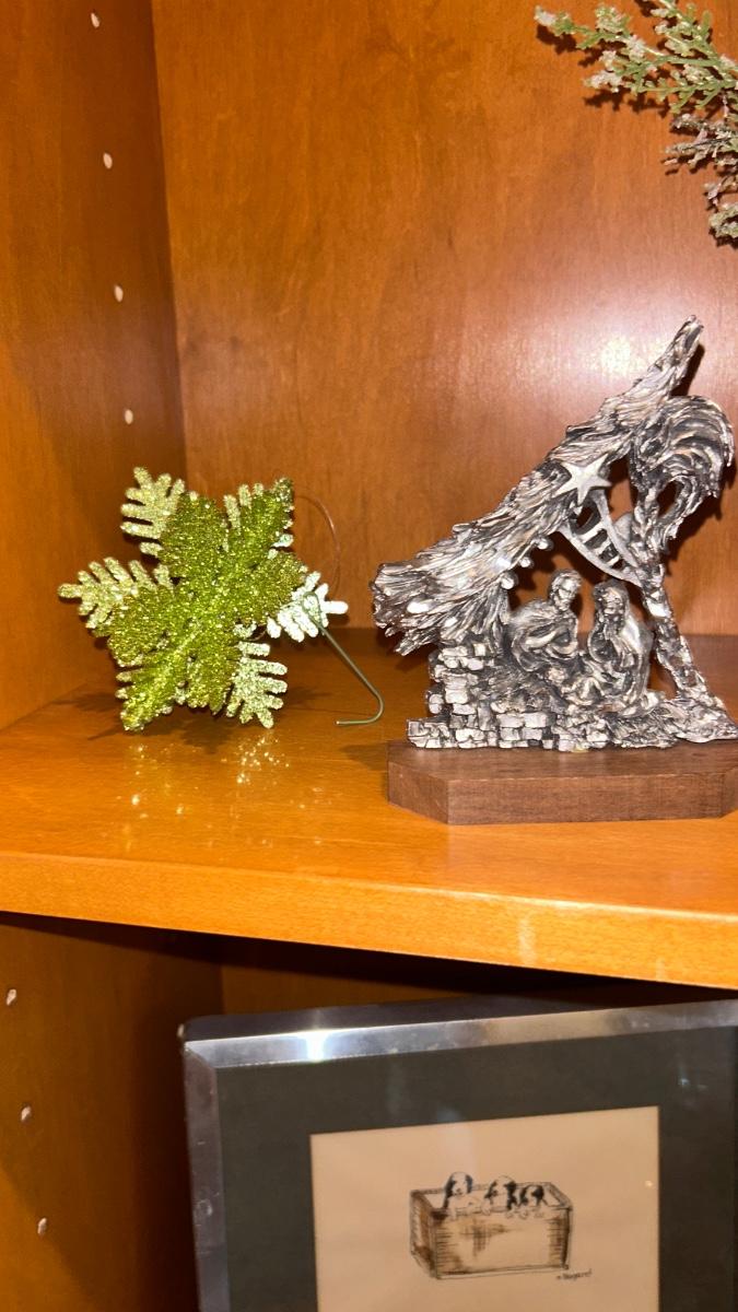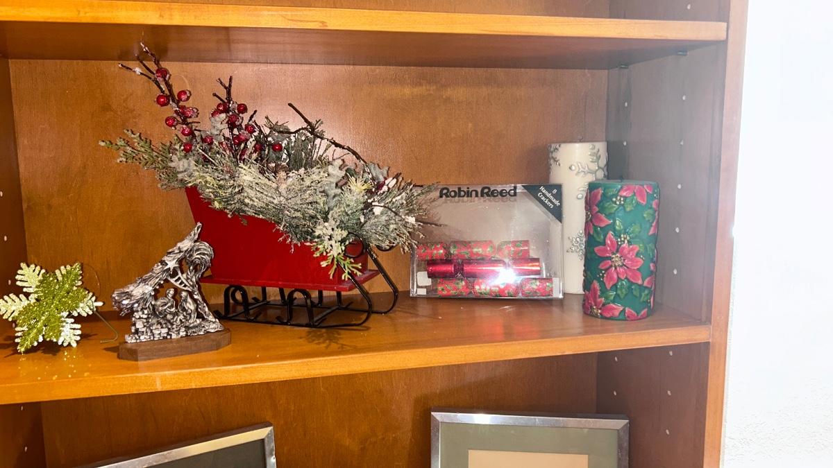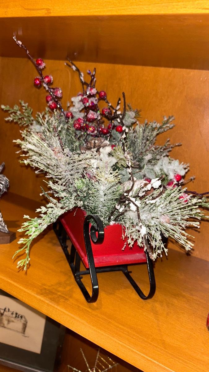 FITZ & FLOYD CANDLES, PEWTER SCULPTURE AND SLEIGH CENTERPIECE