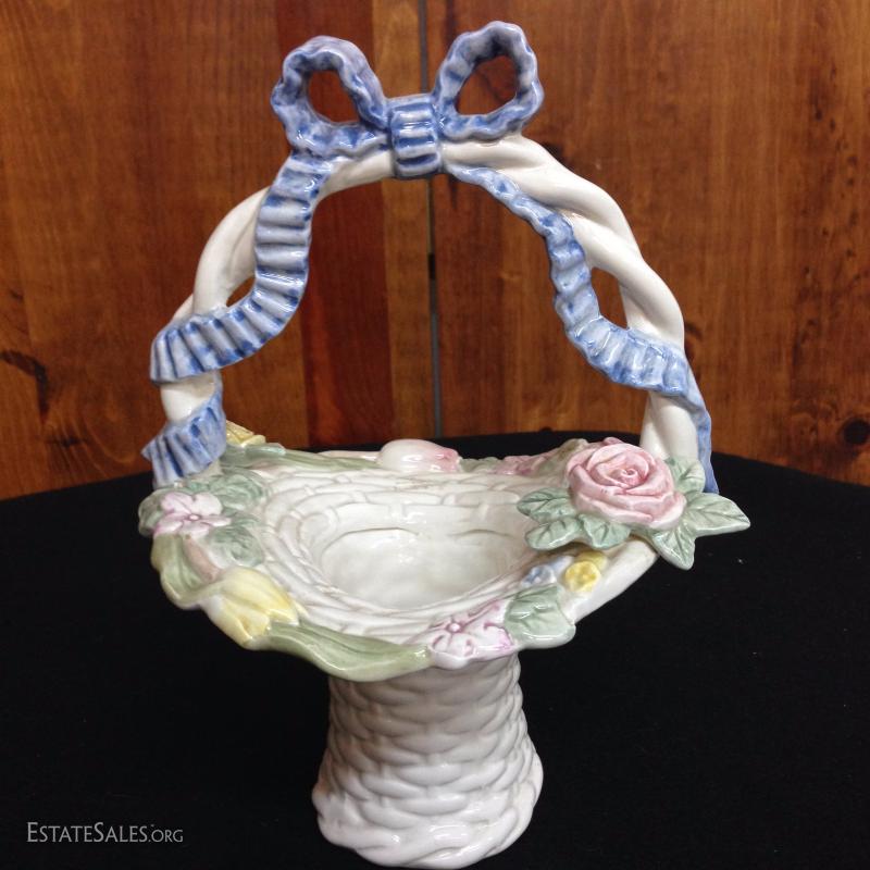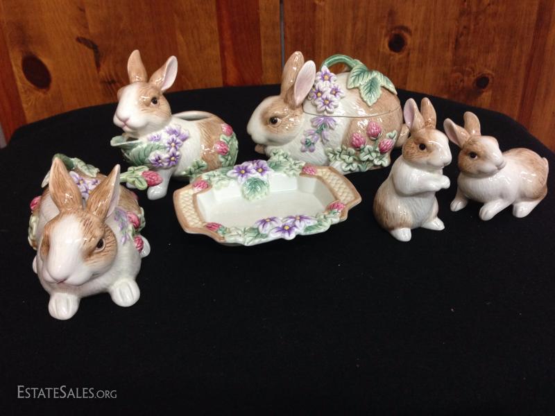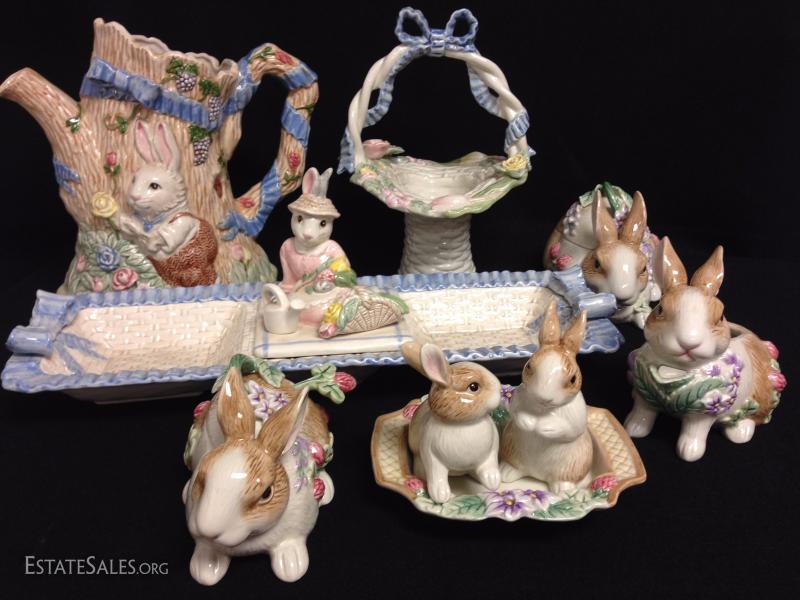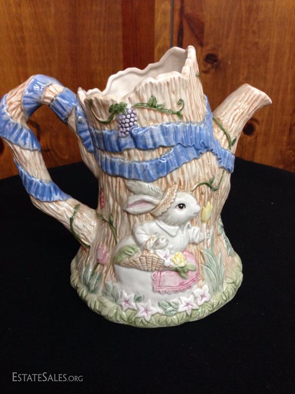 Awesome Set Includes: Fitz and Floyd 1989 Bunny Rabbit Woodland Spring 1 12 qt. Pitcher, The Woodland Spring Pitcher is 1 1/2 qt, Basket with Flowers and a Blue Ribbon Handle, Relish Tray movable Bunny cover, Cream & Sugar with spoon, Covered Candy/Trinket Dish and Salt & Pepper Shakers with matching Tray.