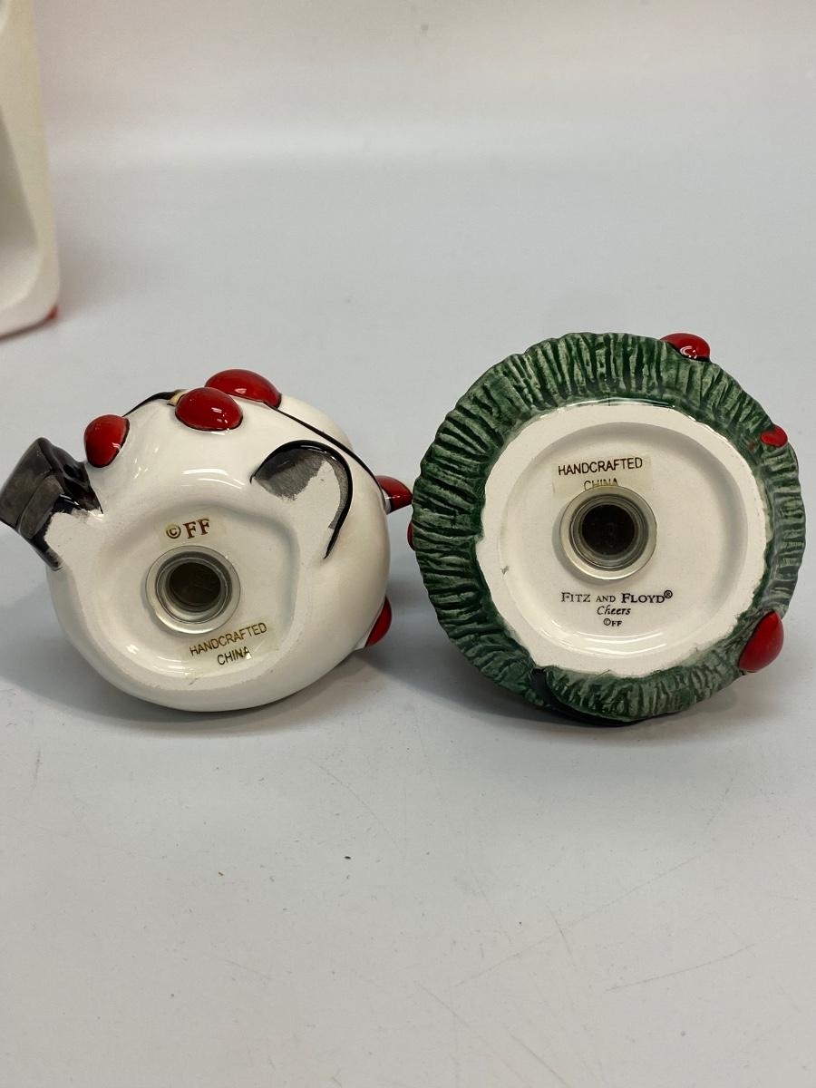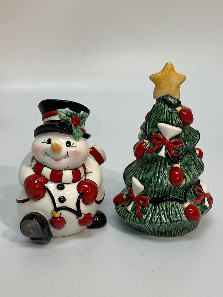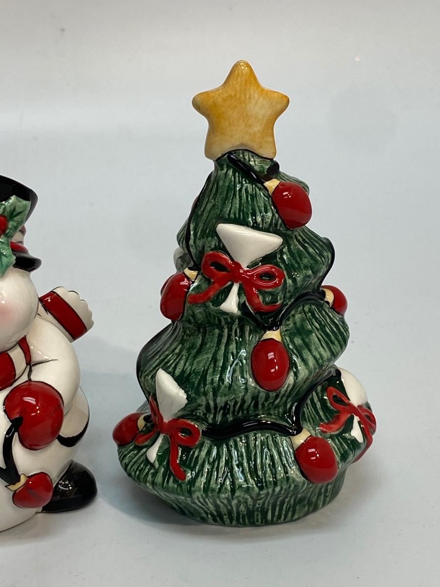 Fitz & Floyd Cheers Snowman with his Martini Christmas Tree Salt & Pepper Shaker Set