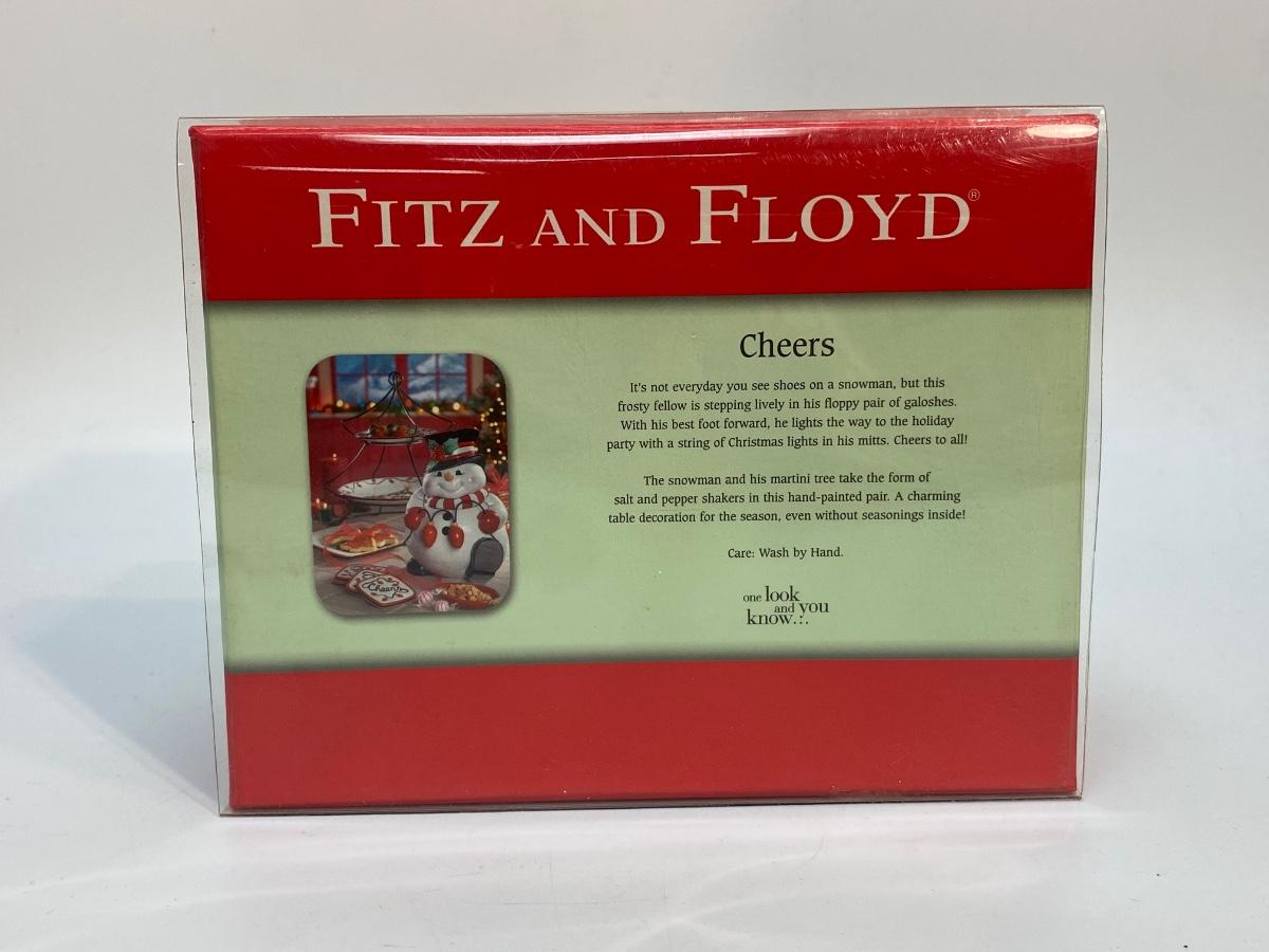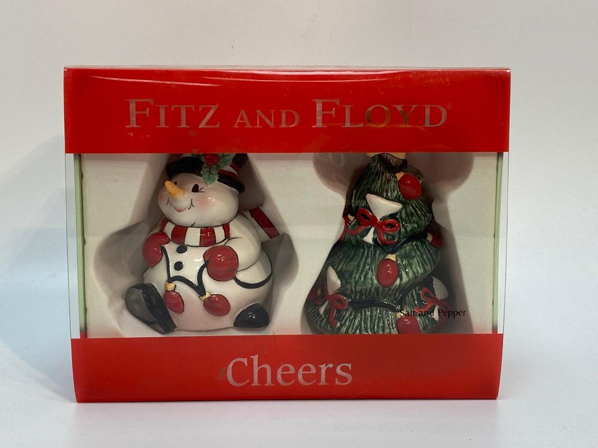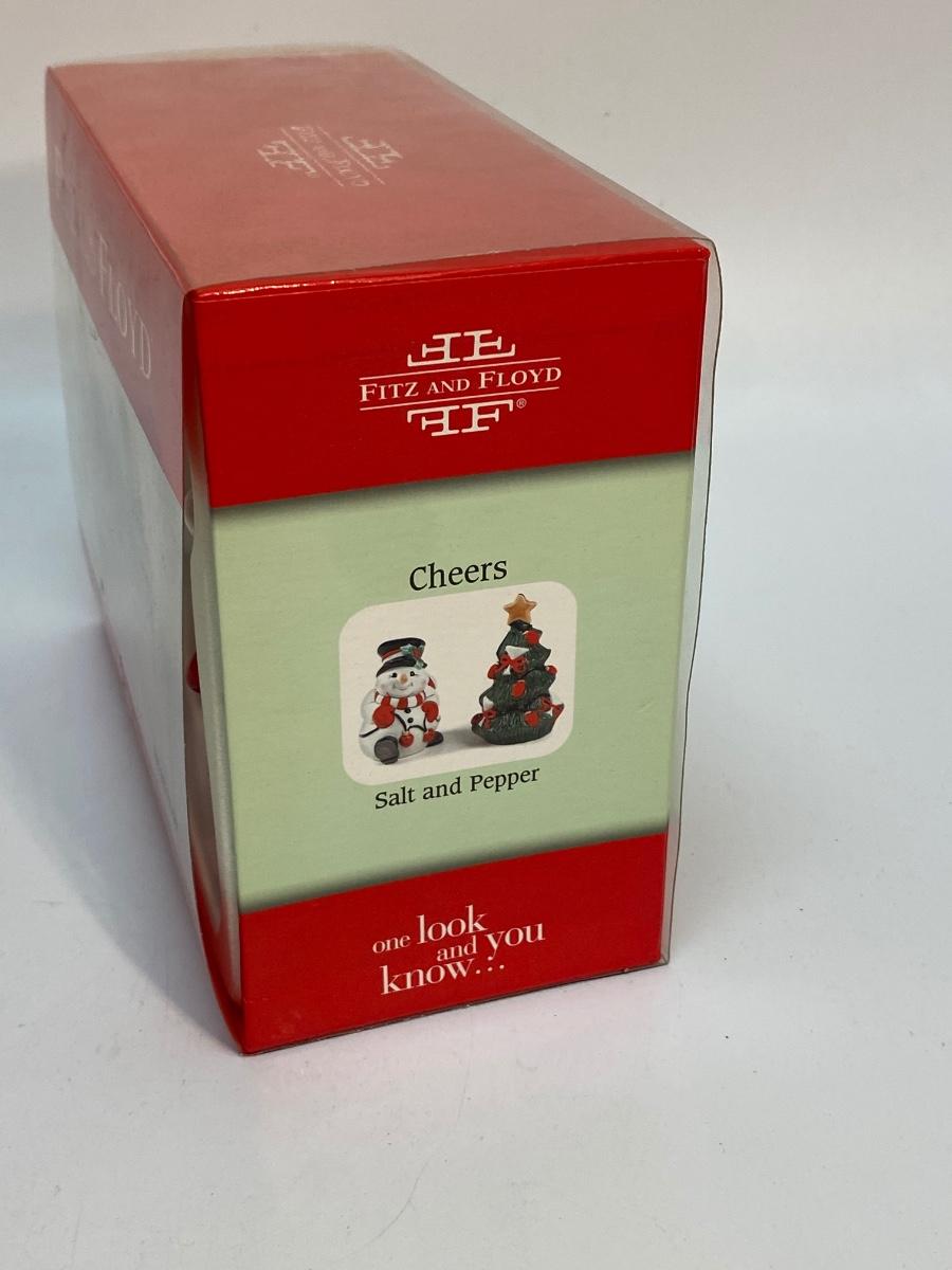 Fitz & Floyd Cheers Snowman with his Martini Christmas Tree Salt & Pepper Shaker Set. In good condition, comes in original box.