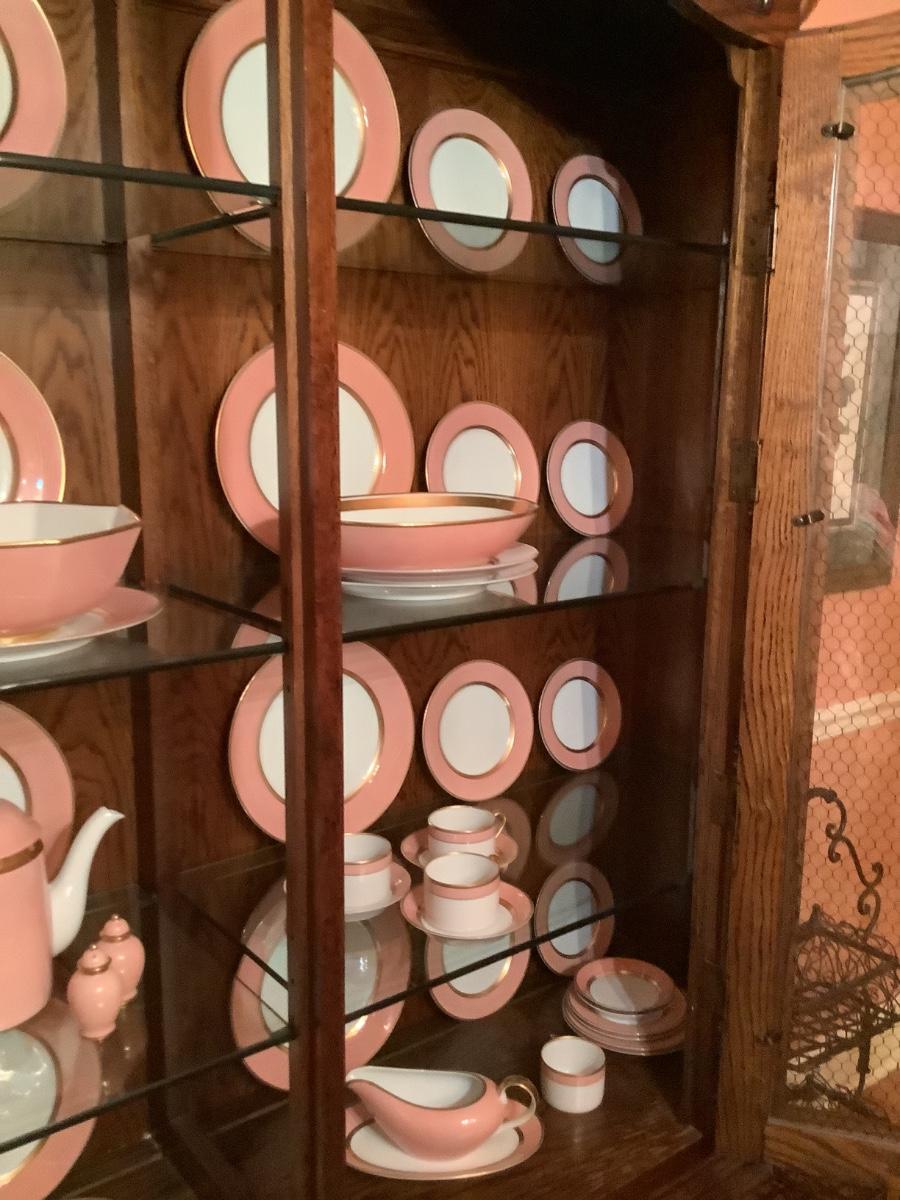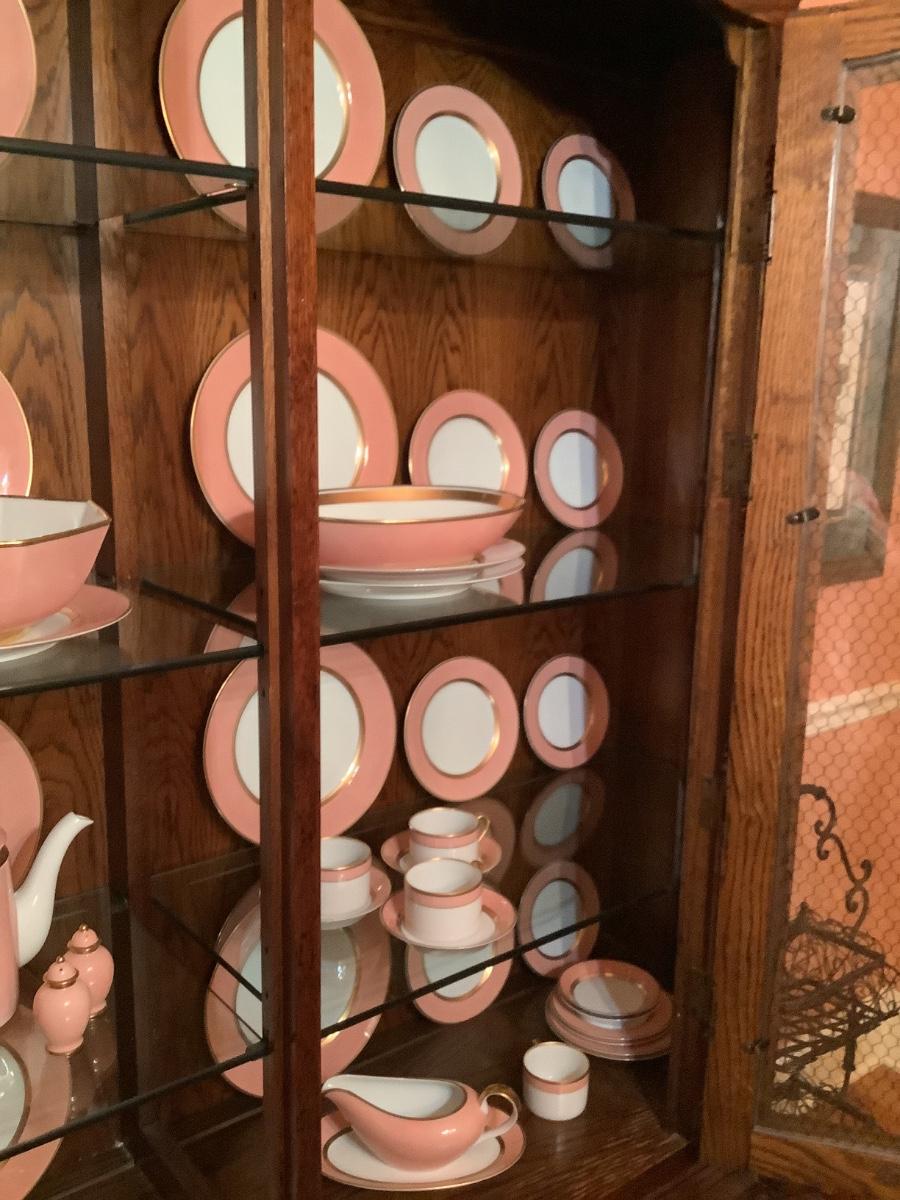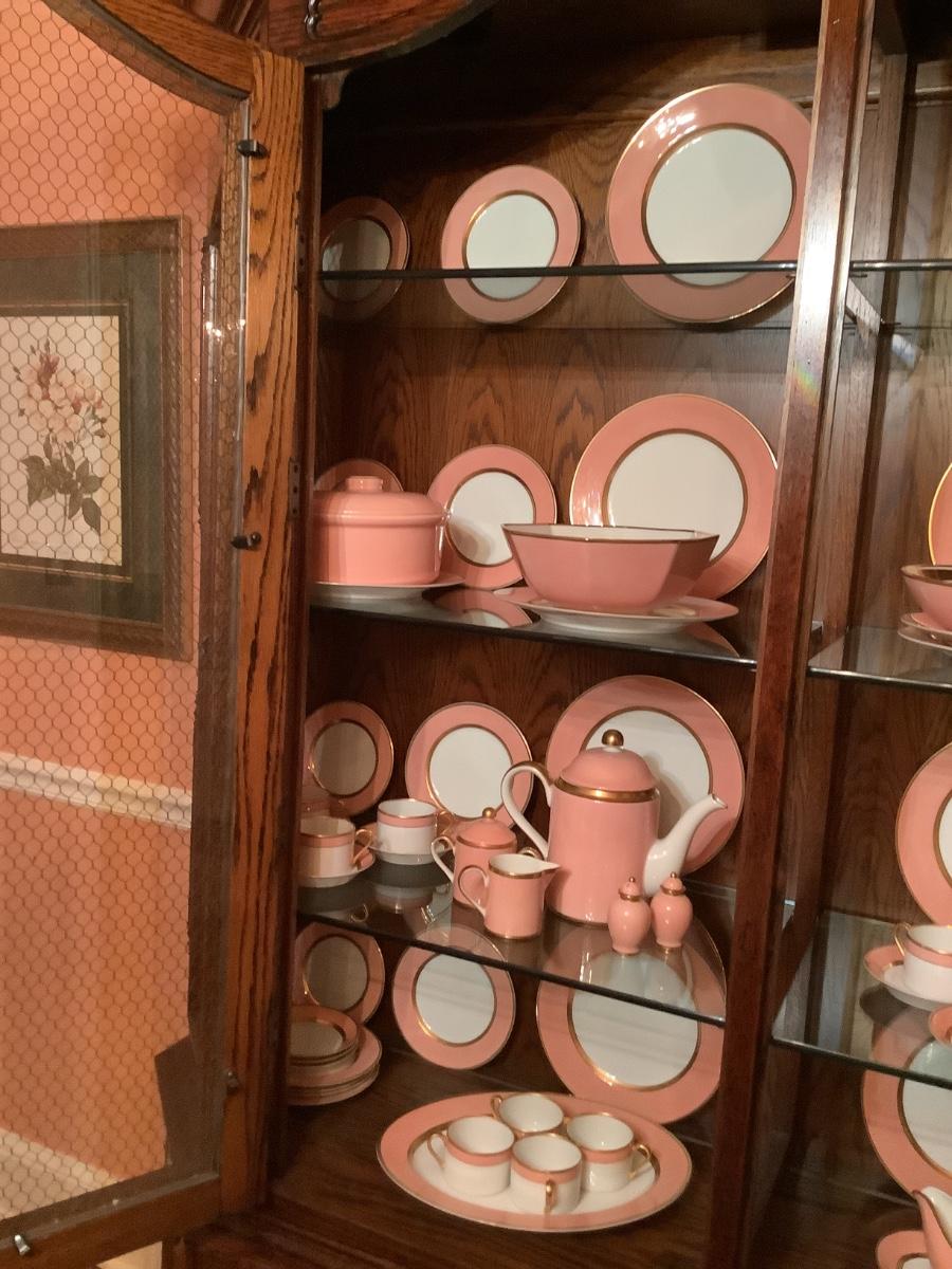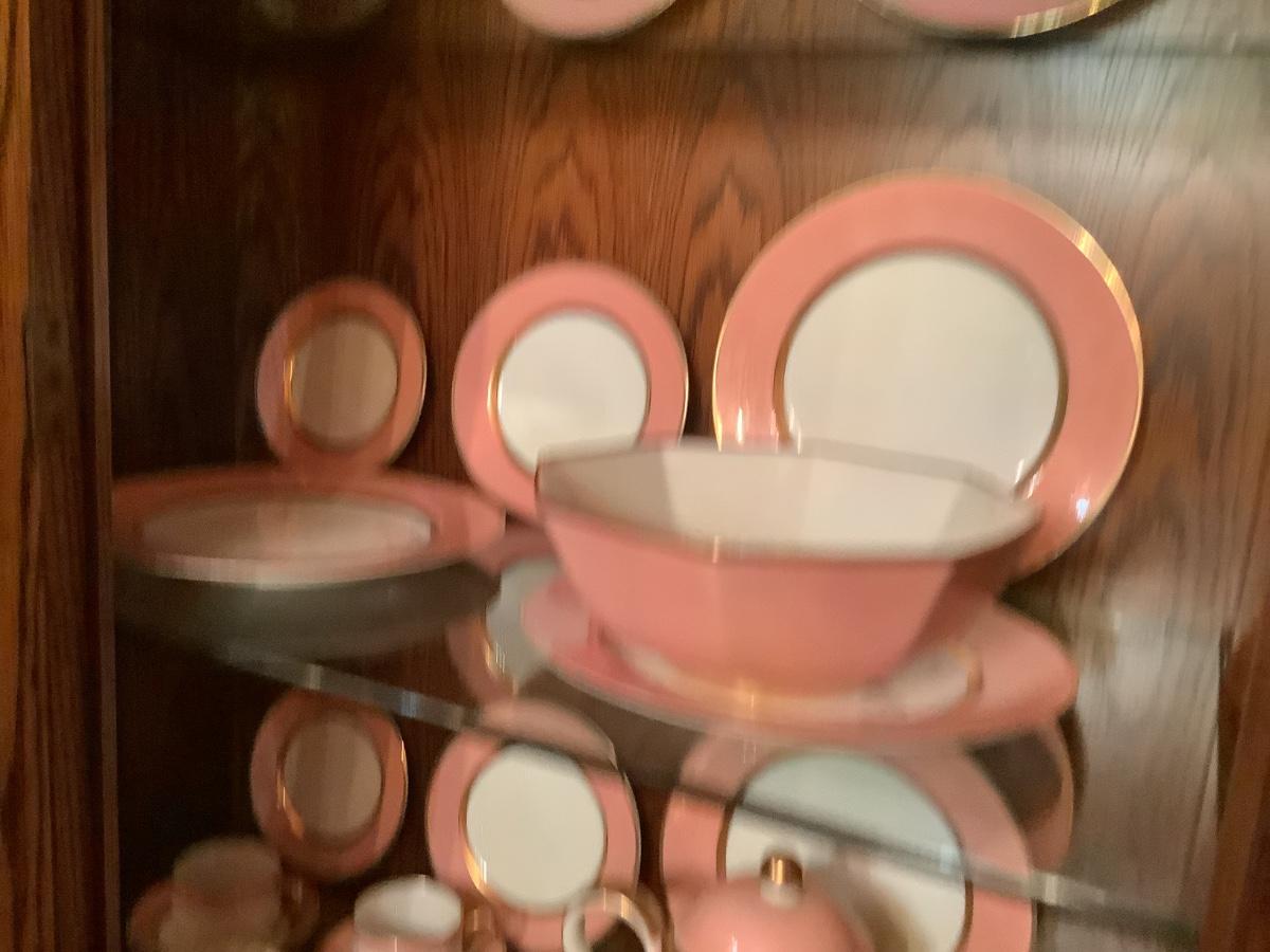 Fitz & Floyd China for 12 , salmon color, teapot, sugar, creamer, S&P, gravy boat, etc. view all the photos of the Fitz & Floyd in the China cabinet