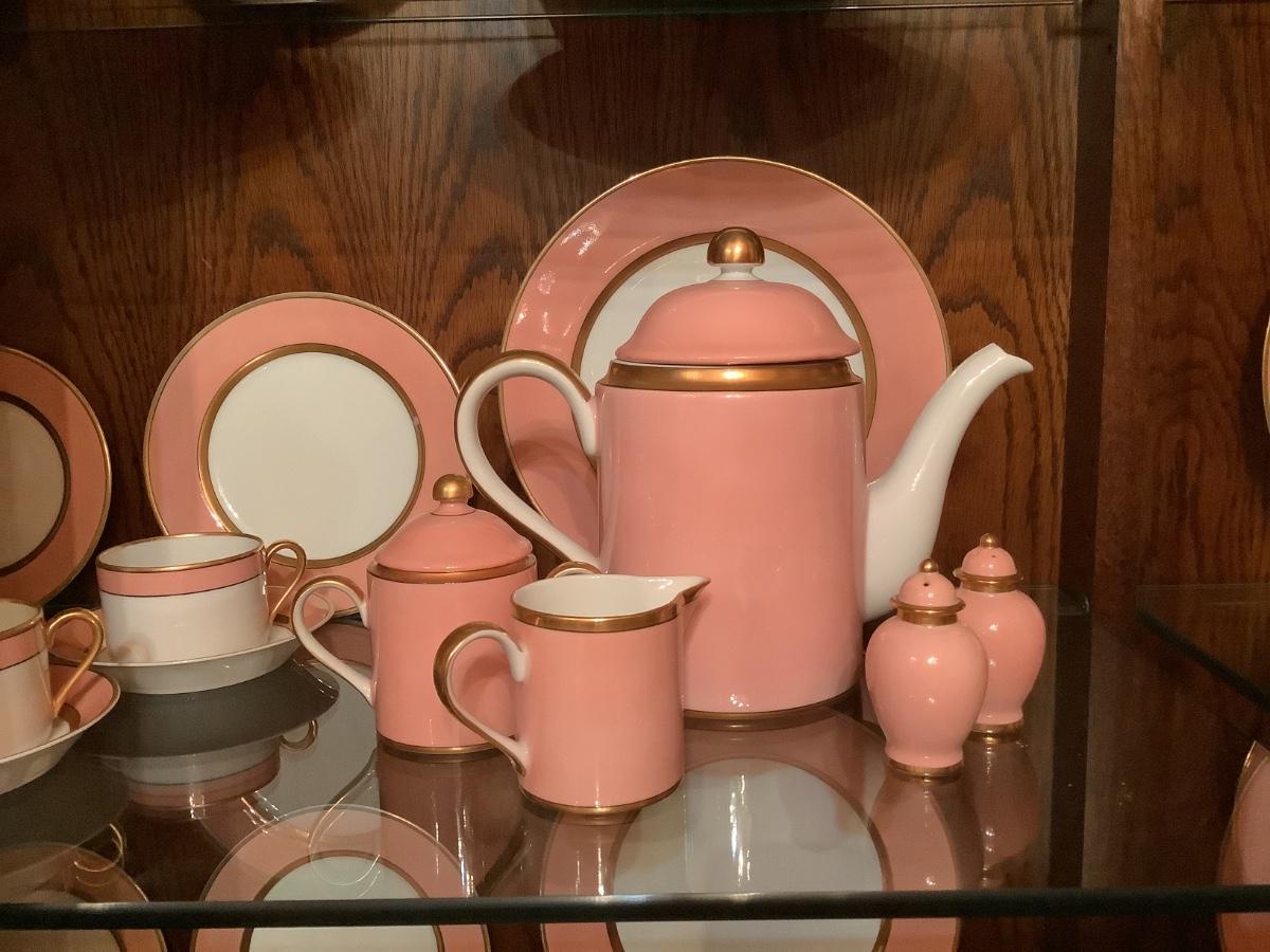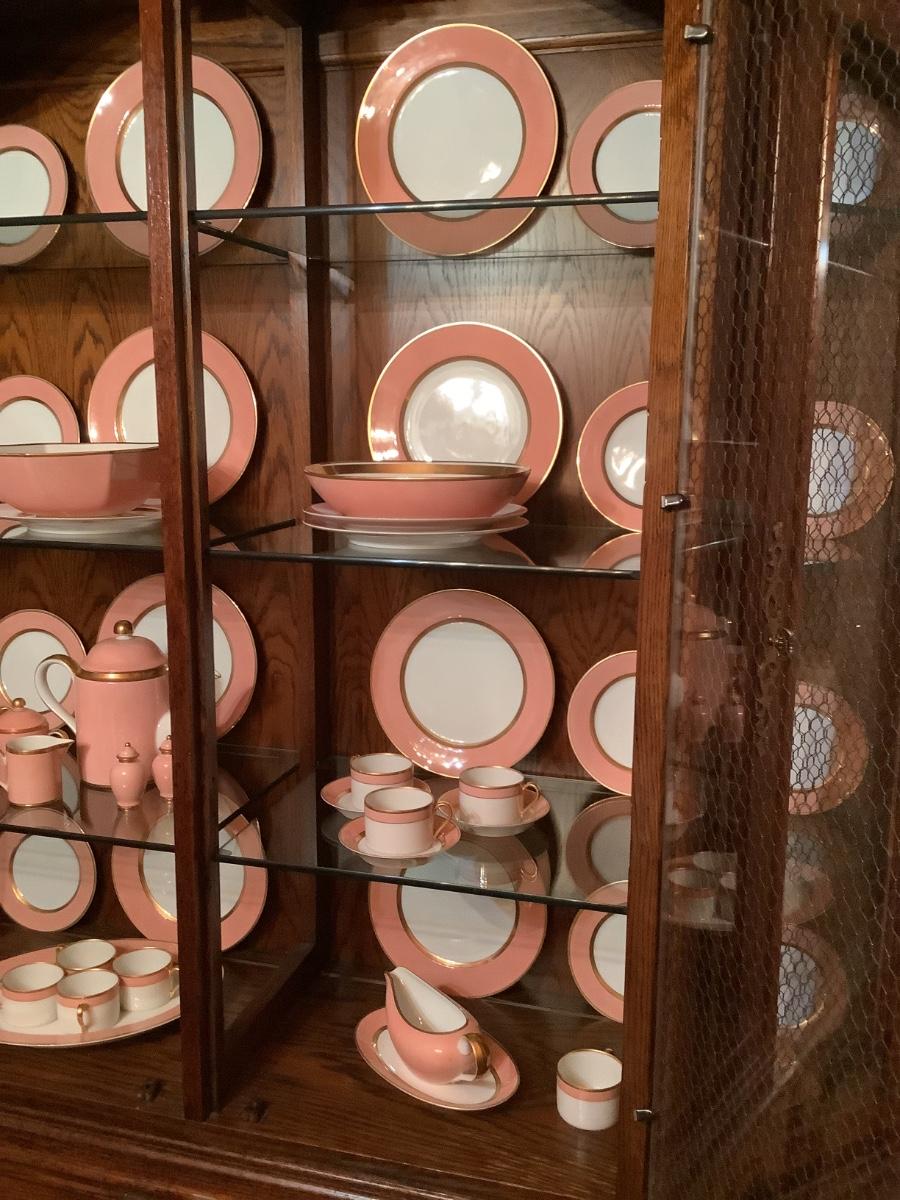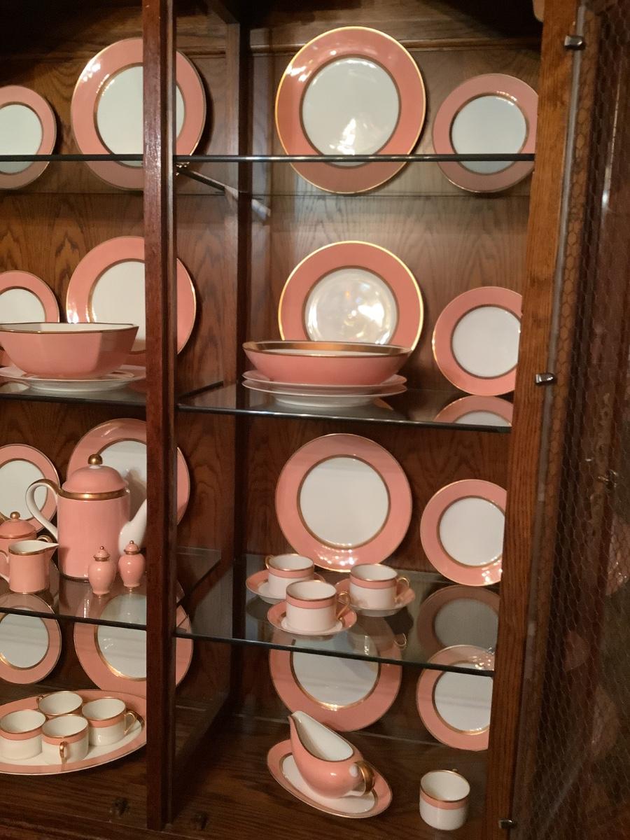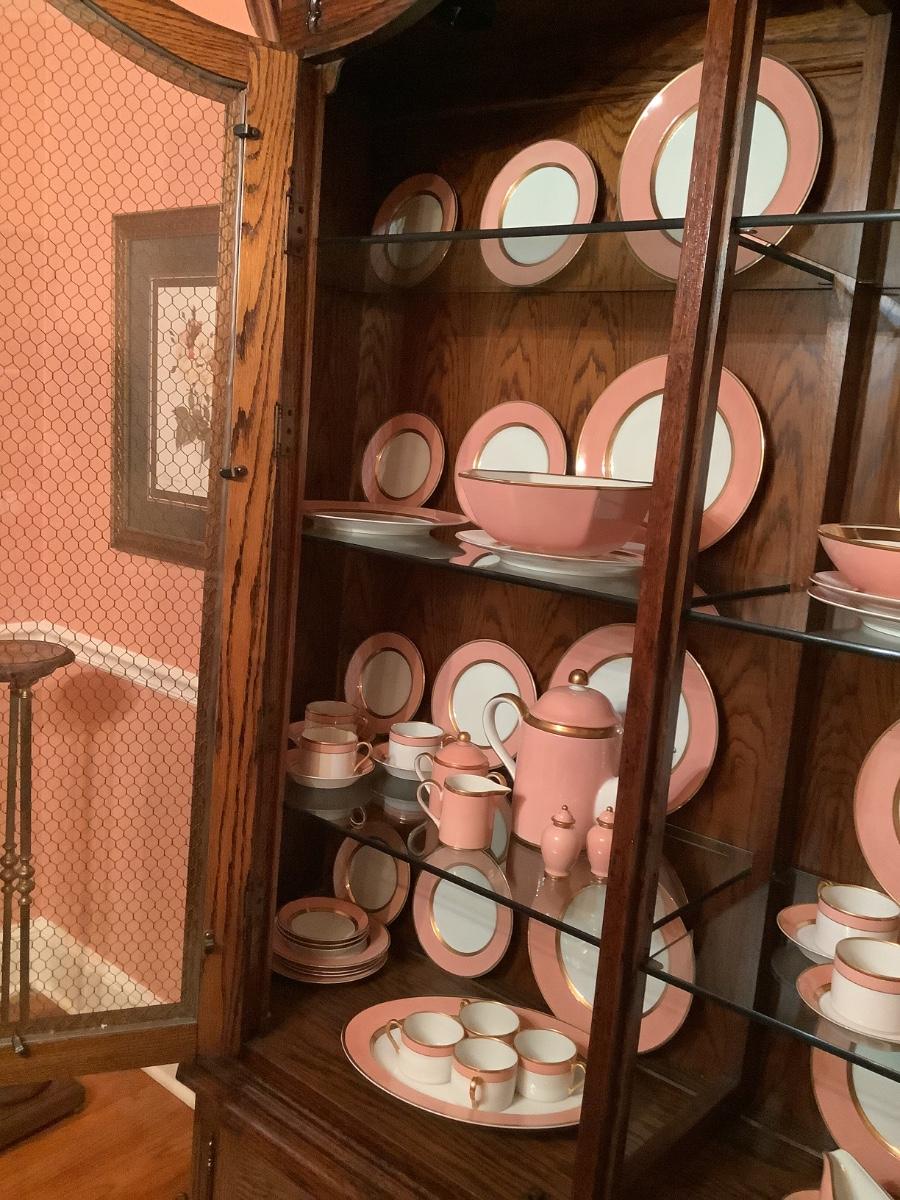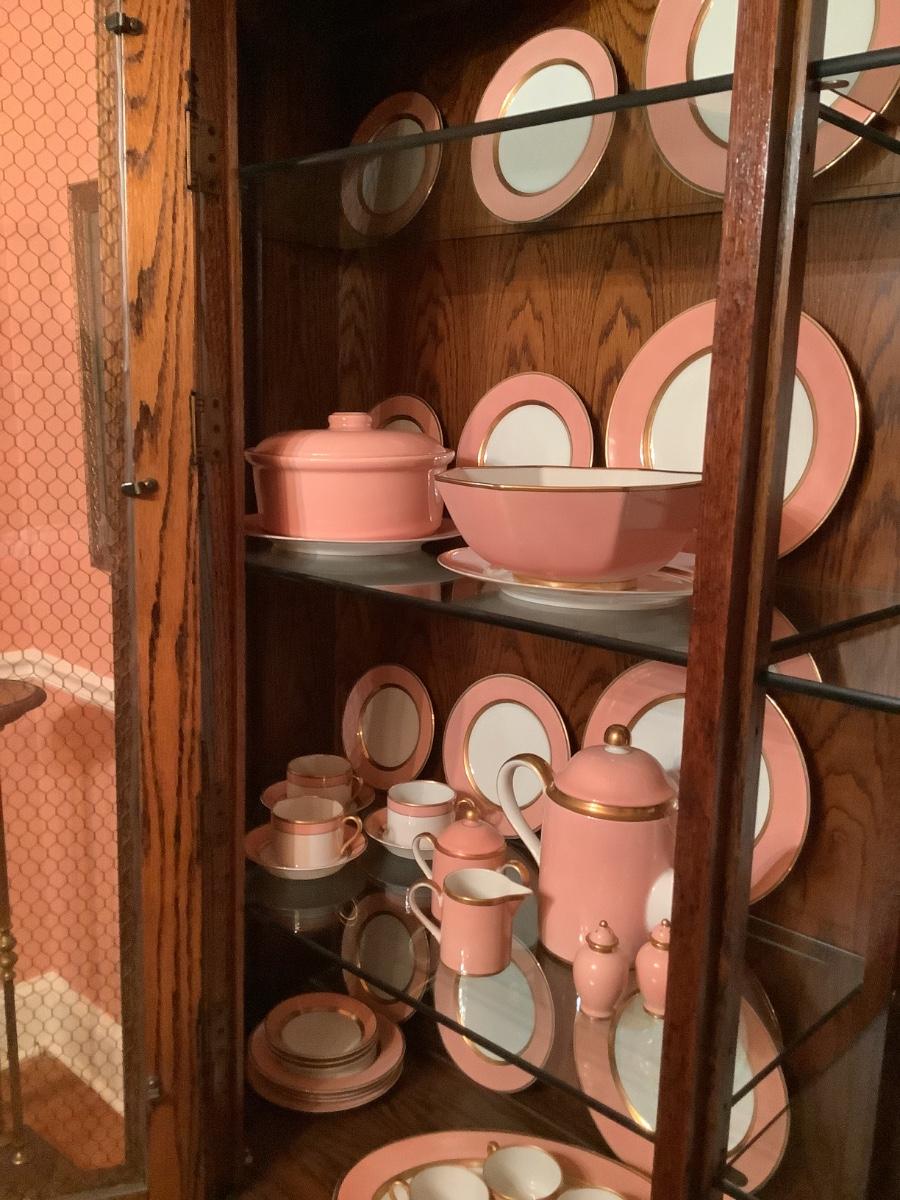 Fitz & Floyd China for 12 , salmon color, teapot, sugar, creamer, S&P, gravy boat, etc. view all the photos of the Fitz & Floyd in the China cabinet