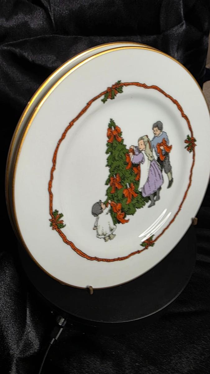 Some holiday pieces carry a warmth that feels like memory itself. This pair of Fitz & Floyd “Deck the Halls” salad plates captures one of the sweetest rituals of the season: children gathered around a towering evergreen, tying bright red bows into its branches with mittened hands and careful delight. Their faces glow with that unmistakable excitement that only Christmas brings—the kind made of snow-kissed air, wool scarves, and laughter that echoes across winter hills.