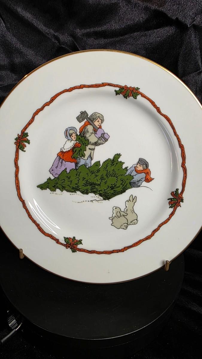 A quiet snowfall, the soft thump of boots, and the evergreen perfume of a freshly felled tree—this pair of Fitz & Floyd “Deck the Halls” salad plates captures a moment every old-fashioned Christmas promises. The scene shows a family hauling their holiday tree through fresh drifts, an axe resting on a shoulder, scarves trailing in the wind, while two curious winter rabbits watch from the path. A ribboned garland encircles the well like a storybook frame, finished with a warm glint of gold at the rim—classic Fitz & Floyd poetry in porcelain.