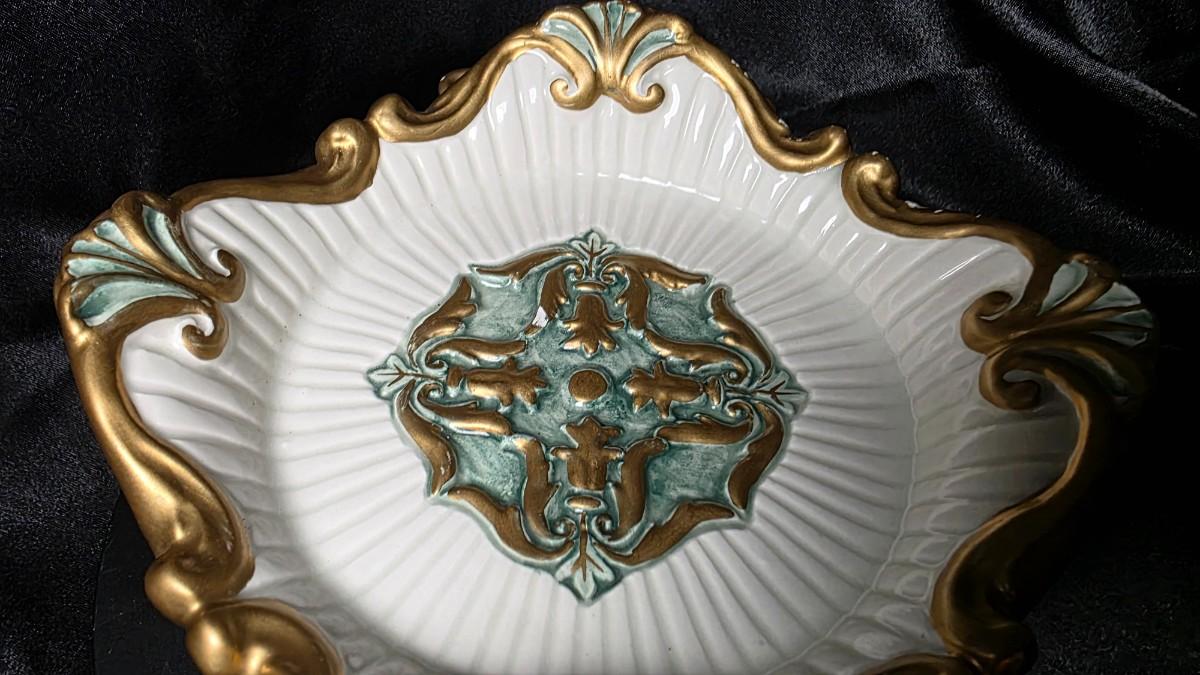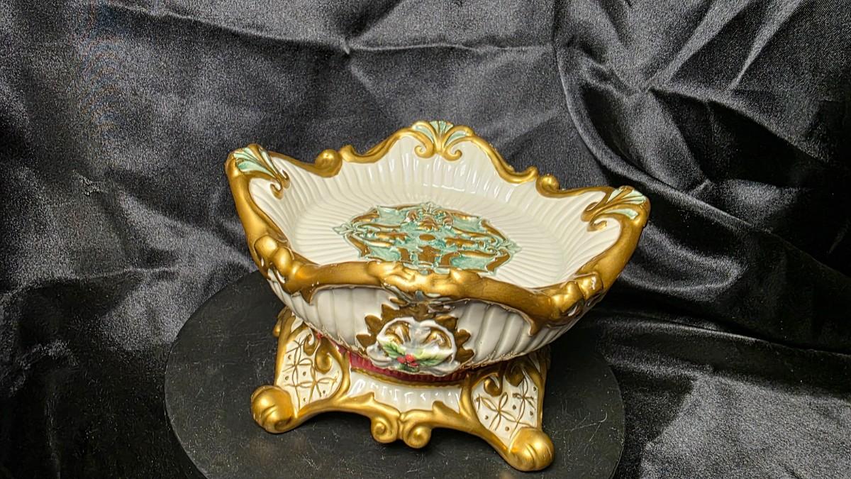 The candle holder is in excellent overall condition, showing no cracks and vibrant, intact colors with a clean glossy glaze. There is one very small chip located inside the bowl, beneath the area where a pillar candle would sit; it is minor and not visible when a candle is in place. Gold accents remain strong and the piece presents beautifully for display.