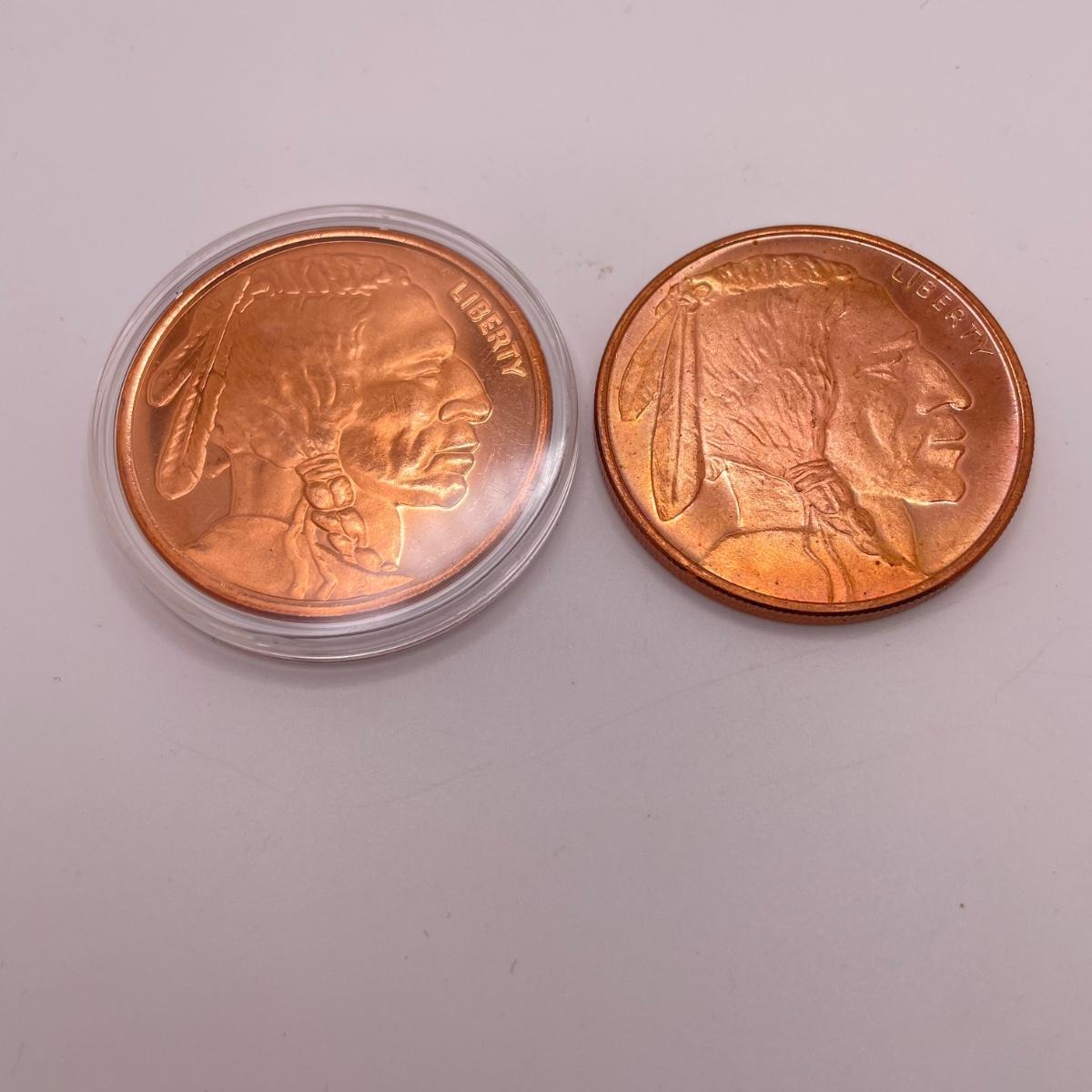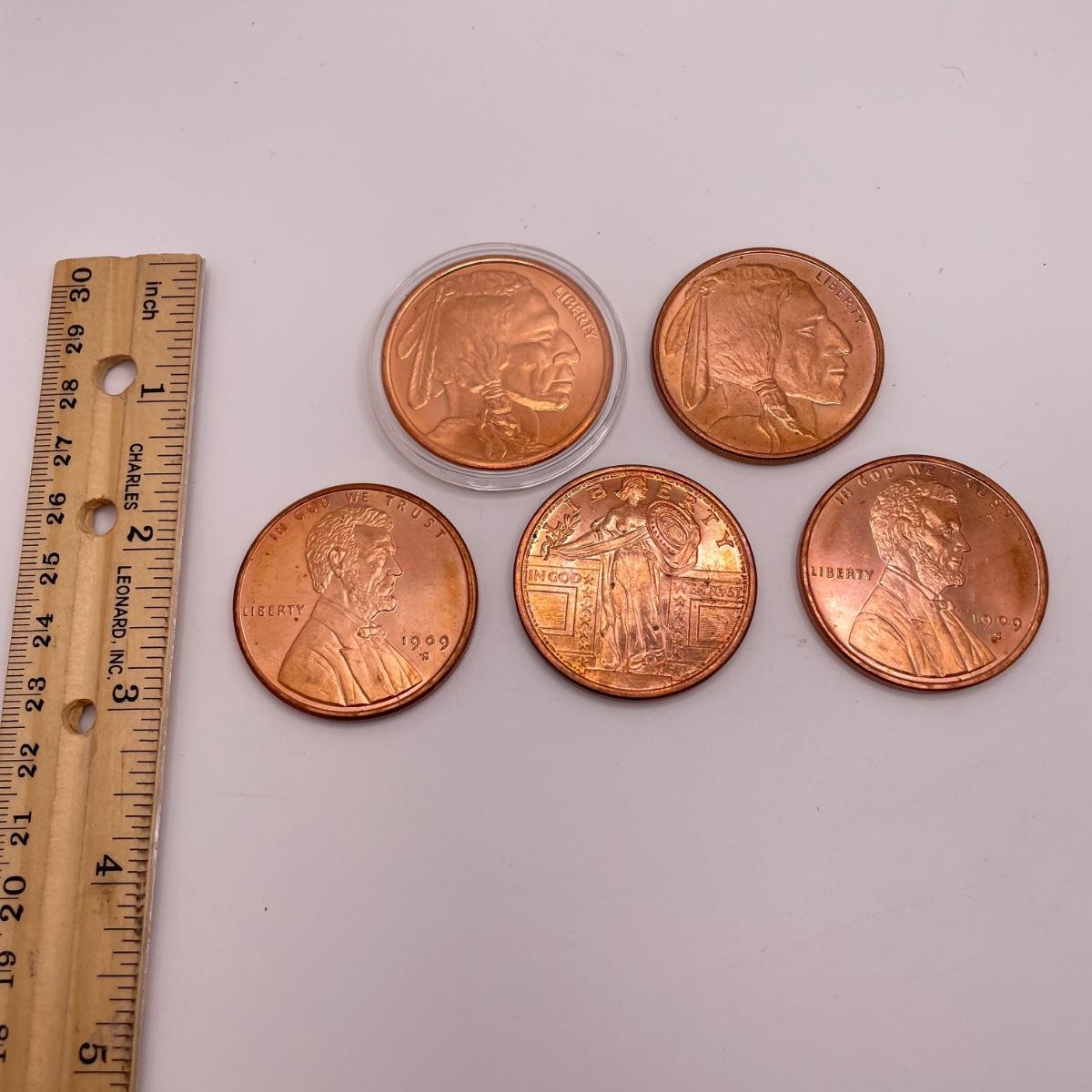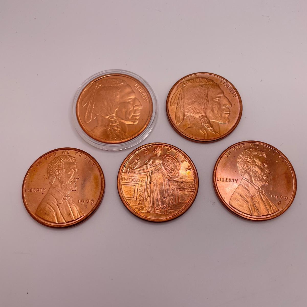 Five one-ounce .999 Fine Copper coins, all are about 1.5”D. Two Lincoln Pennies, two Buffalo Nickels and one Standing Liberty. All sales are final. No returns or refunds. Please bid accordingly. Shipping available.