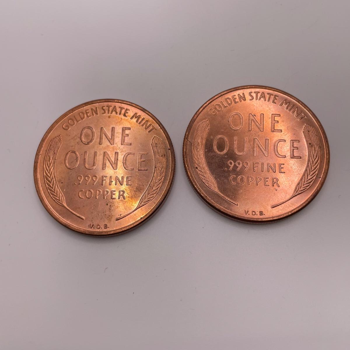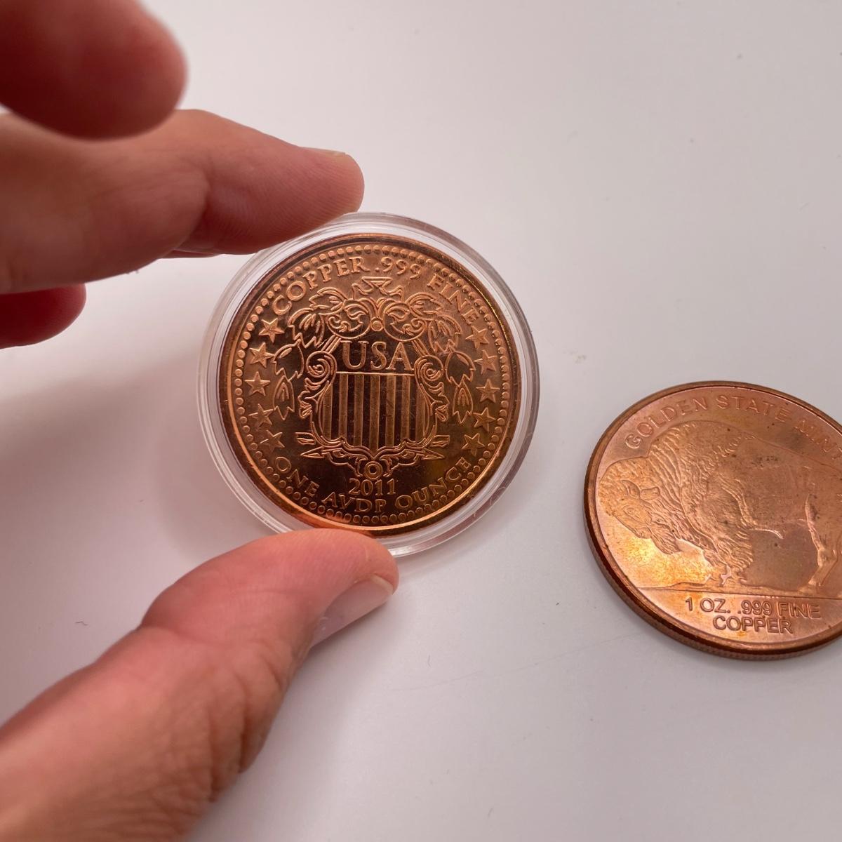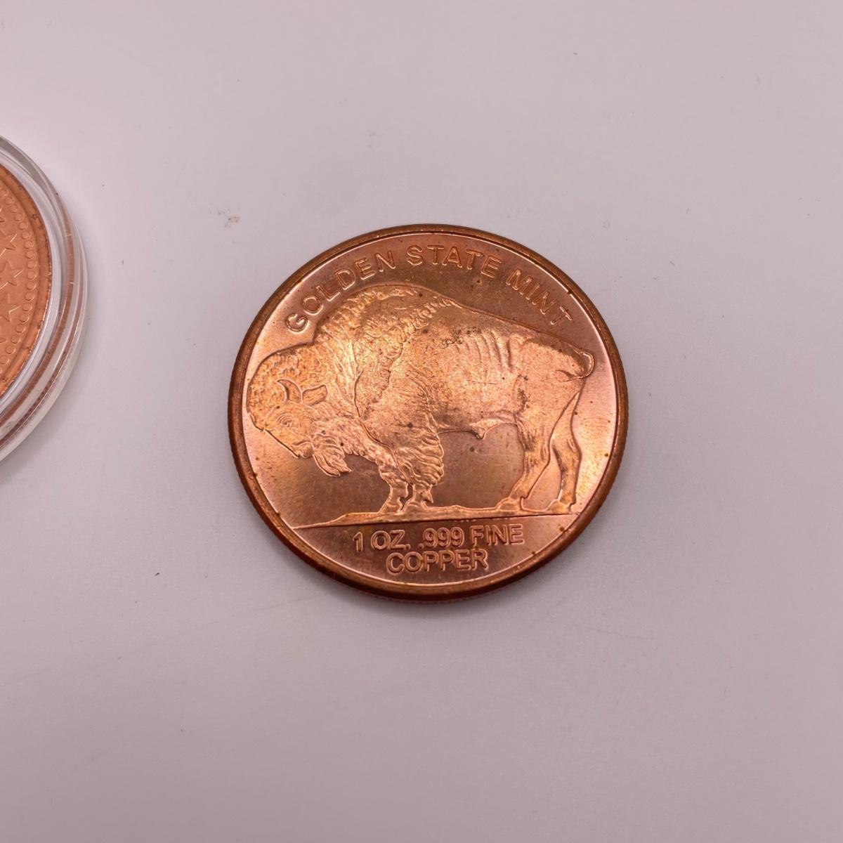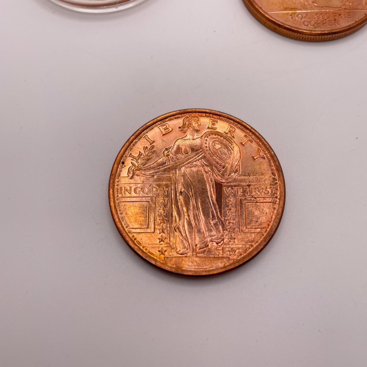 Five one-ounce .999 Fine Copper coins, all are about 1.5”D. Two Lincoln Pennies, two Buffalo Nickels and one Standing Liberty. All sales are final. No returns or refunds. Please bid accordingly. Shipping available.