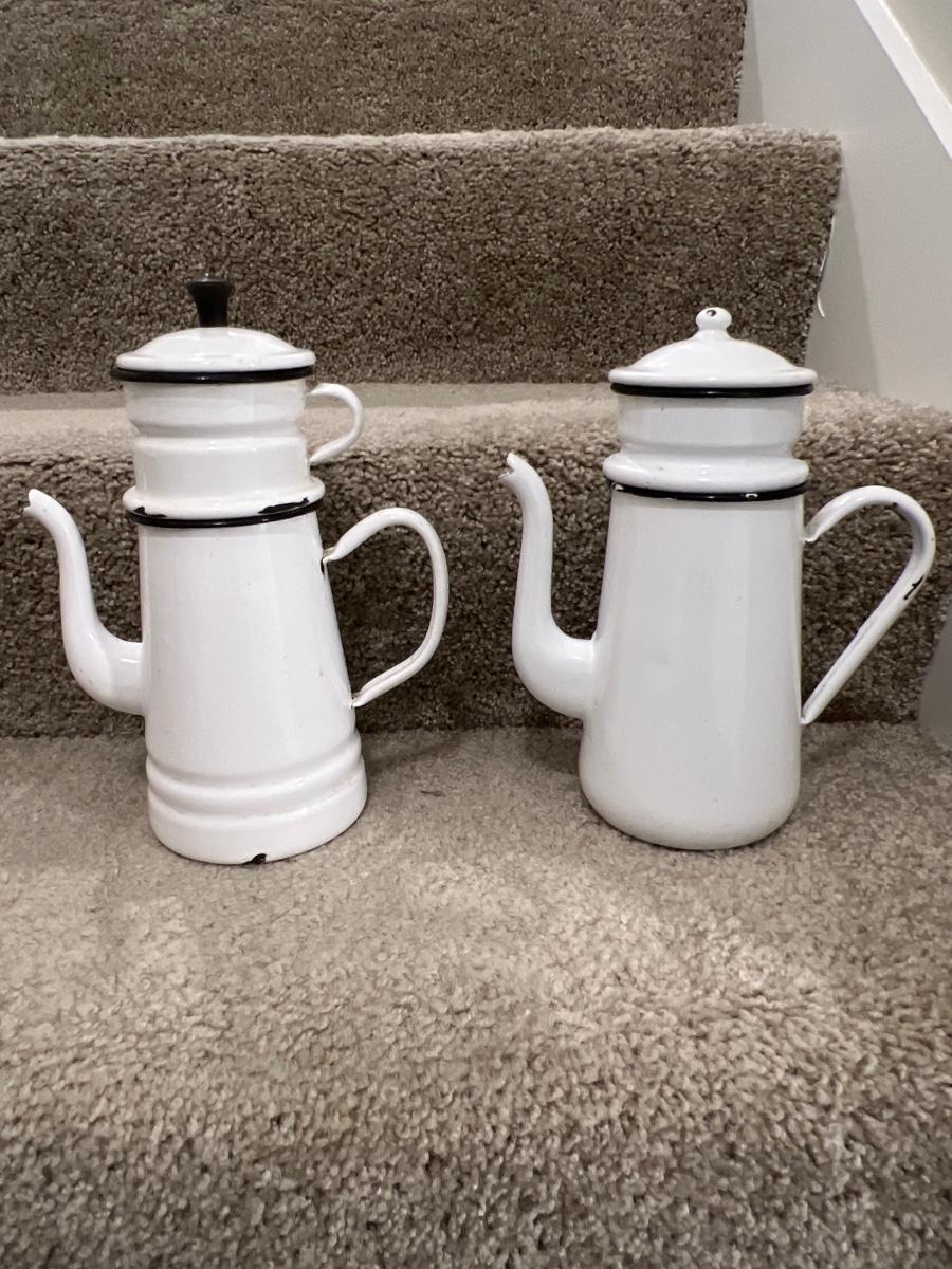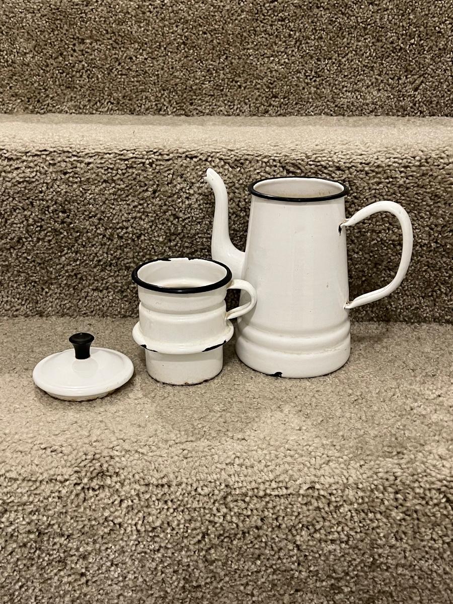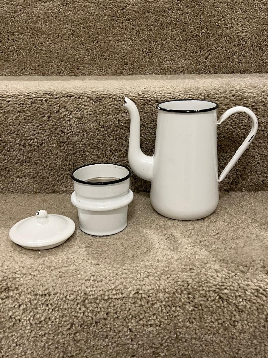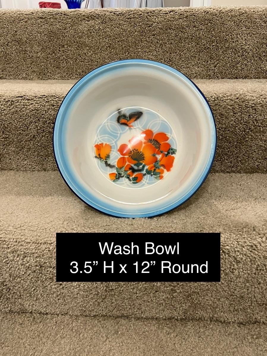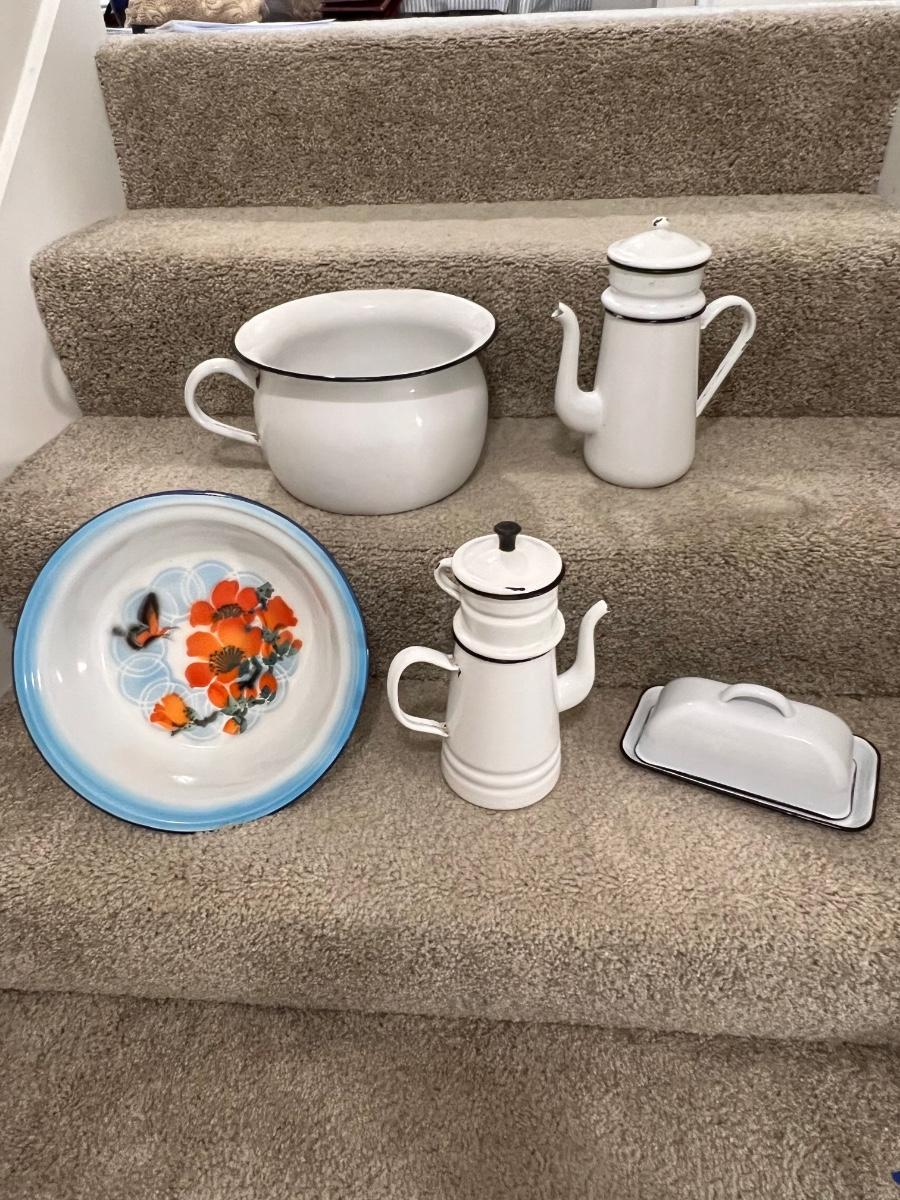 This set includes a coffee pot, tea pot, 2 wash bowls, and a covered butter tray. Only the pieces that have brands have photos of the brand.