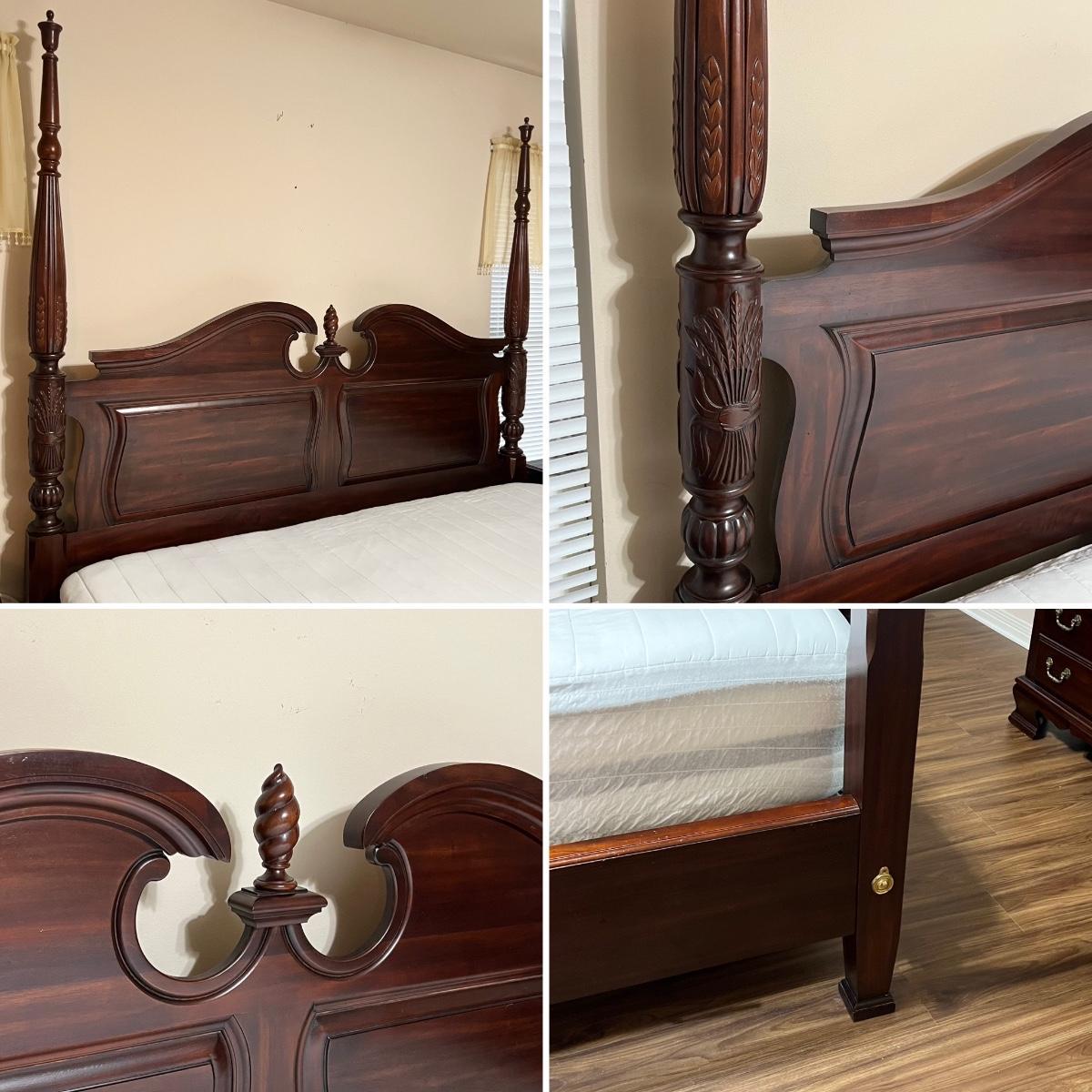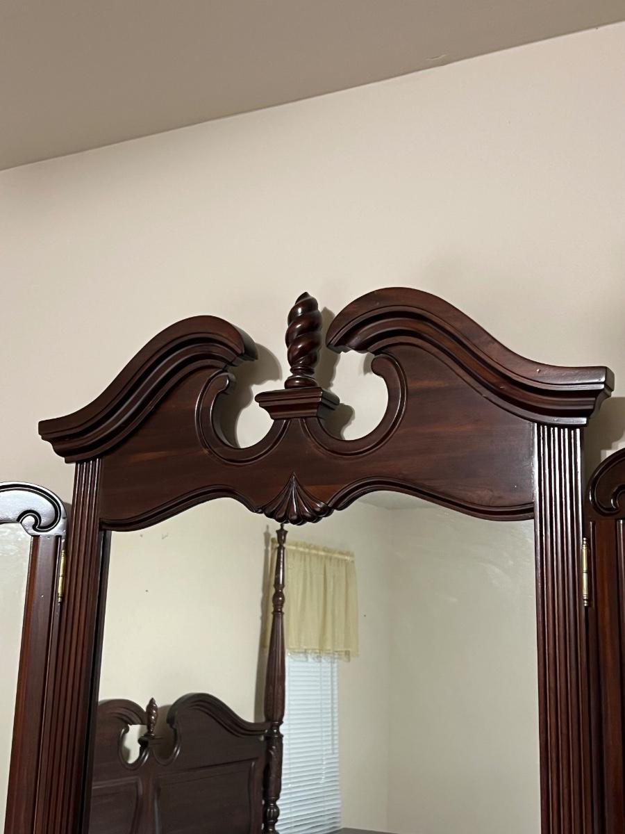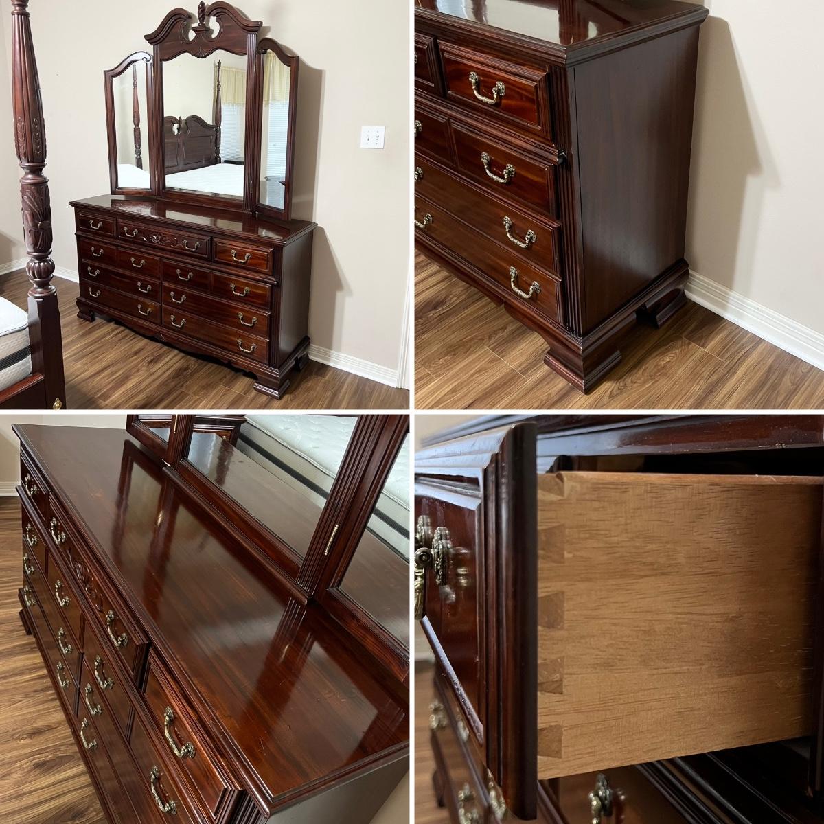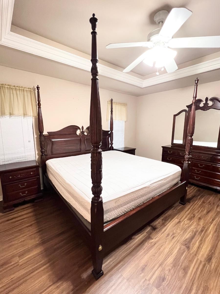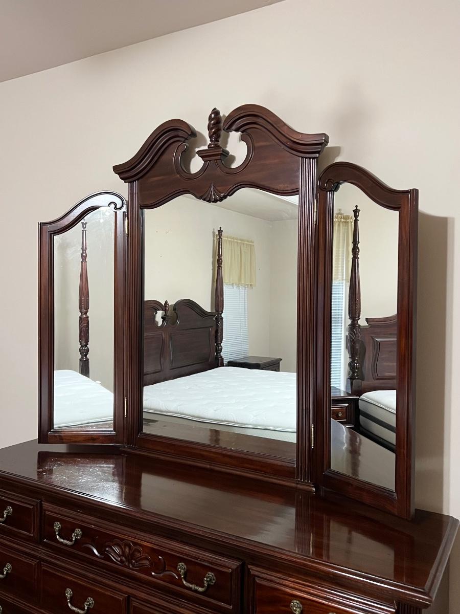 Includes: King 4 poster bed, (2) 2-drawer night stands, (1) 7-drawer mirrored dresser, (1) 5-drawer chest of drawers ~ Includes mattress & boxsprings ~ Mattress has been disinfected, deodorized, & sanitized ~ All drawers slide easy ~ Pieces do have some minor surface scratches due to use, see photos ~ No brand ~ Bed = 88” H ~ Nightstands = 29” H x 24” W x 17” D ~ Mirrored dresser = 35” H x 64” W x 17.25” D ~ Trifold mirror = 49” H ~ Chest of drawers = 56” H x 37” W x 18” D