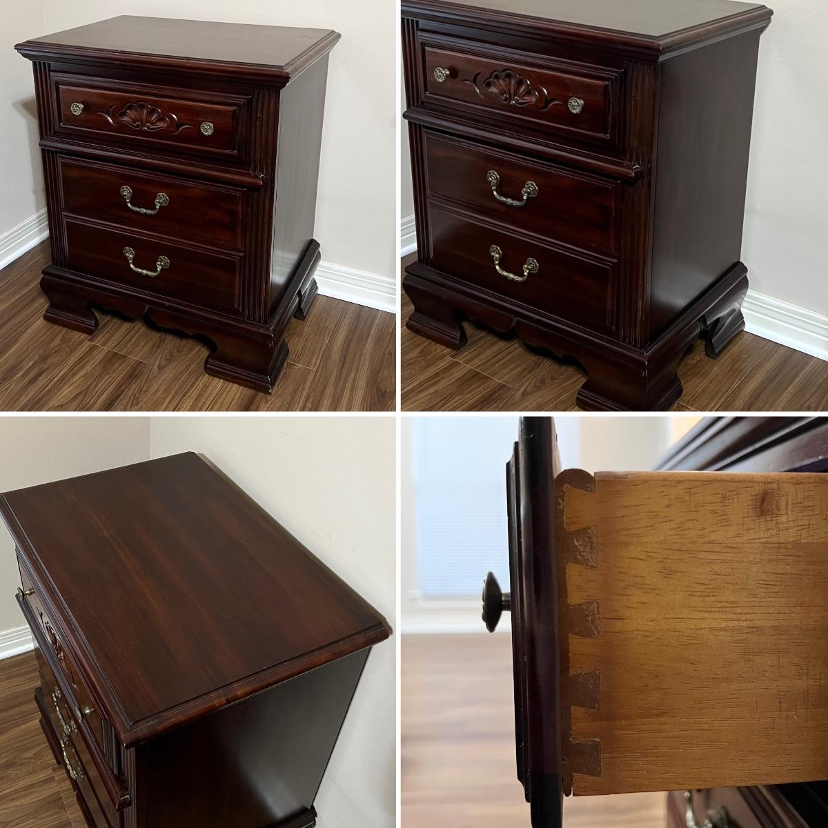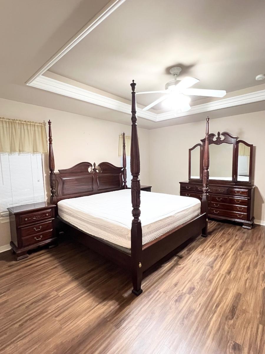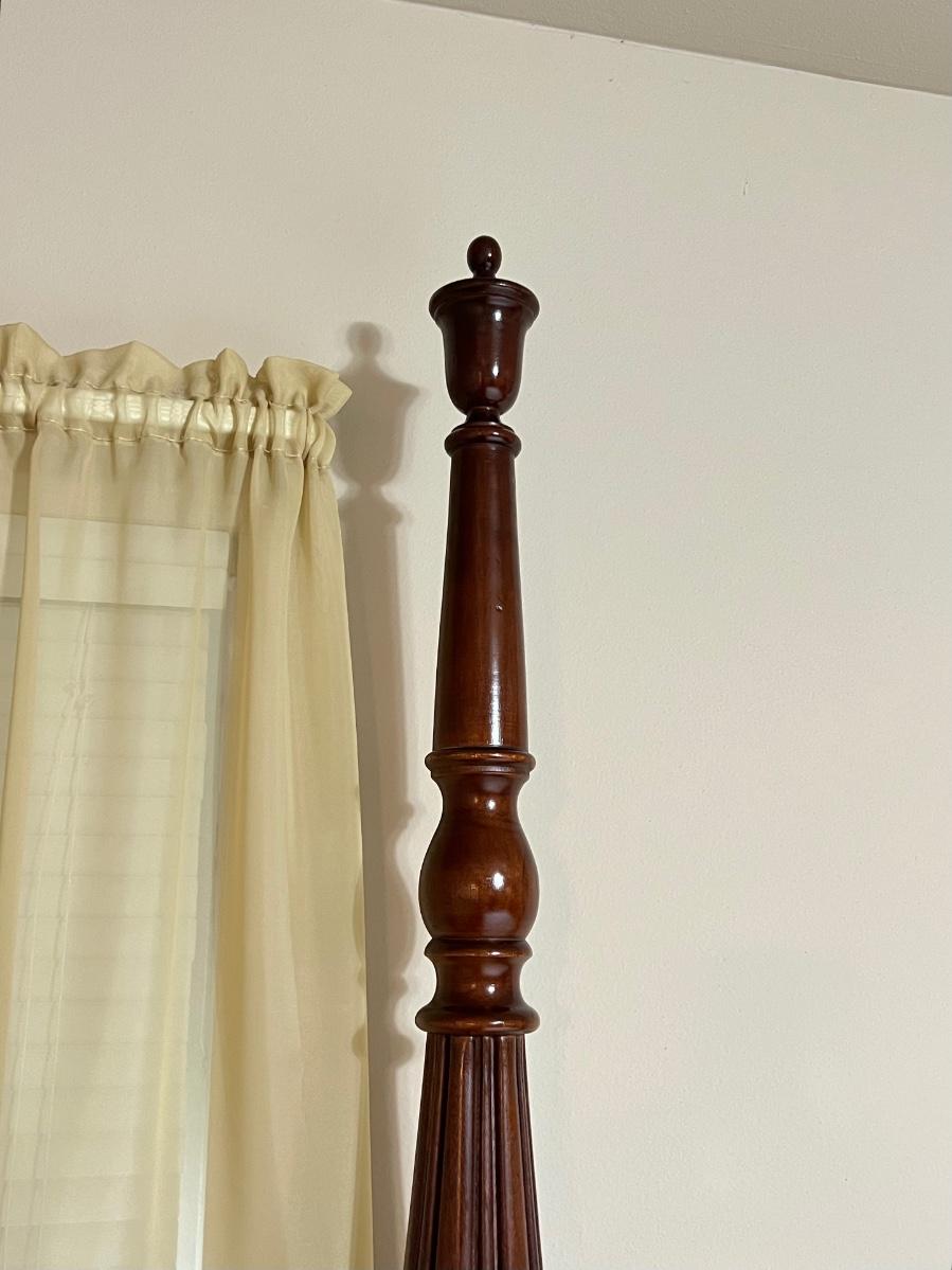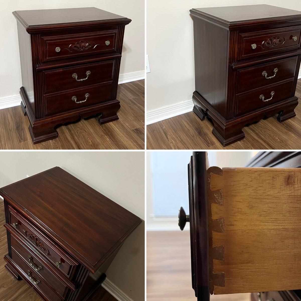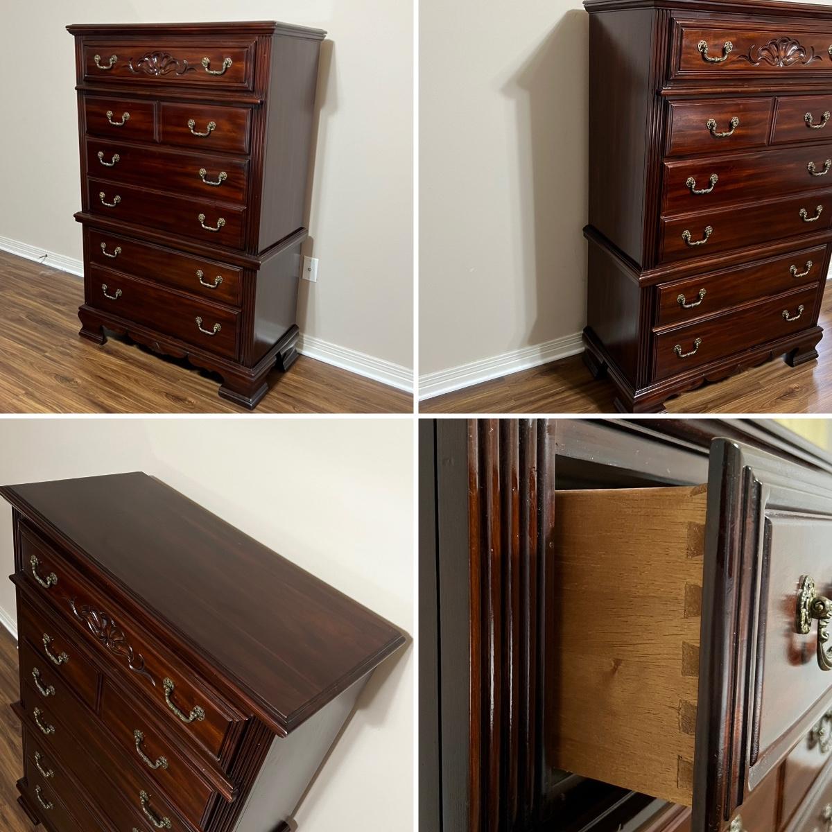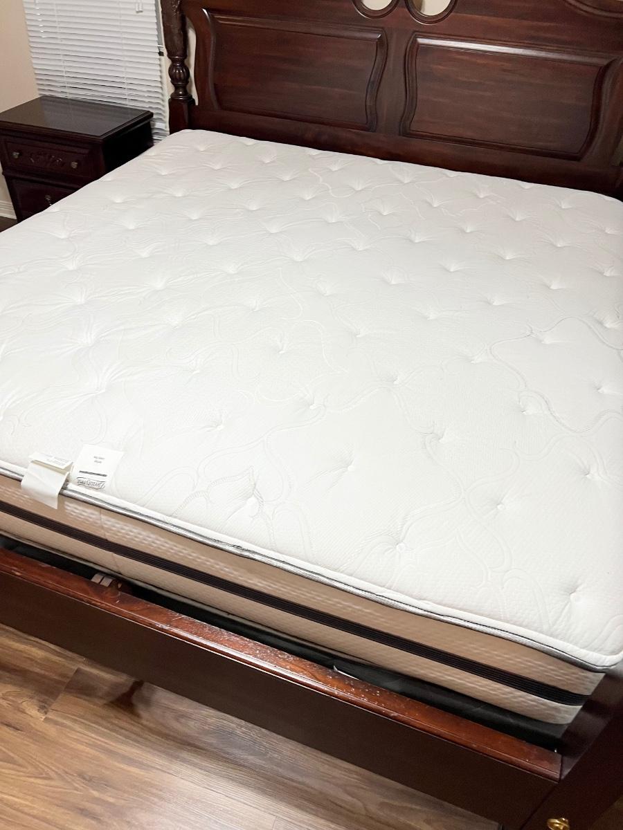 Includes: King 4 poster bed, (2) 2-drawer night stands, (1) 7-drawer mirrored dresser, (1) 5-drawer chest of drawers ~ Includes mattress & boxsprings ~ Mattress has been disinfected, deodorized, & sanitized ~ All drawers slide easy ~ Pieces do have some minor surface scratches due to use, see photos ~ No brand ~ Bed = 88” H ~ Nightstands = 29” H x 24” W x 17” D ~ Mirrored dresser = 35” H x 64” W x 17.25” D ~ Trifold mirror = 49” H ~ Chest of drawers = 56” H x 37” W x 18” D