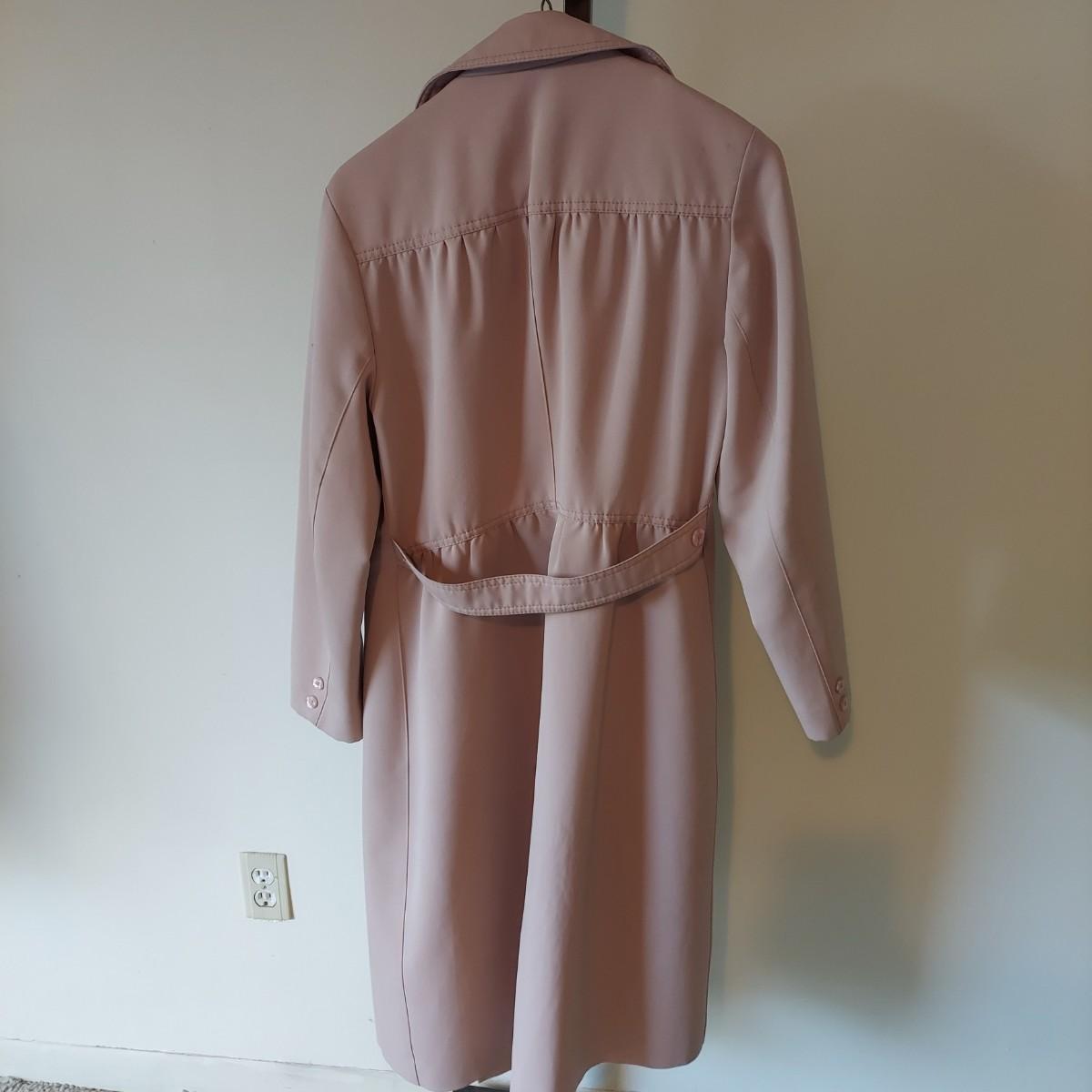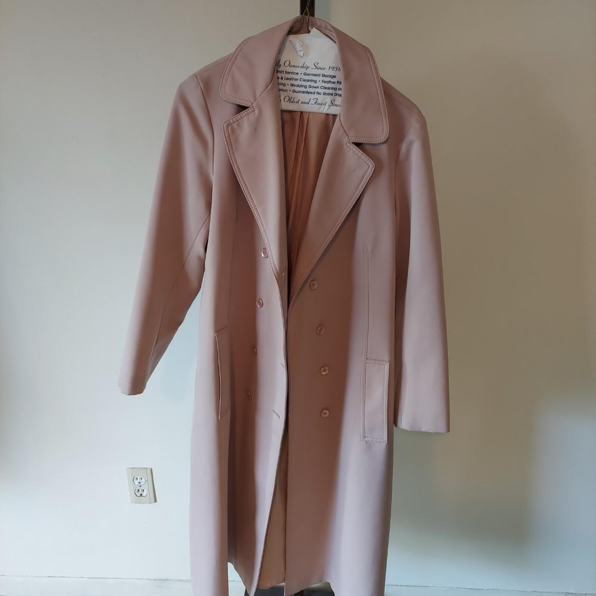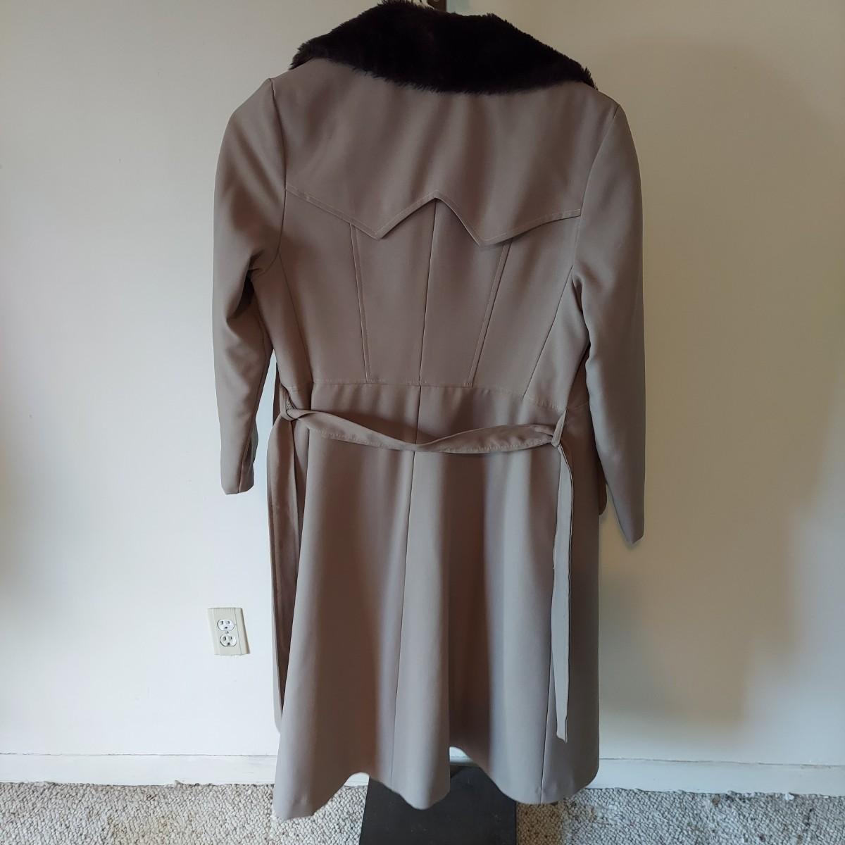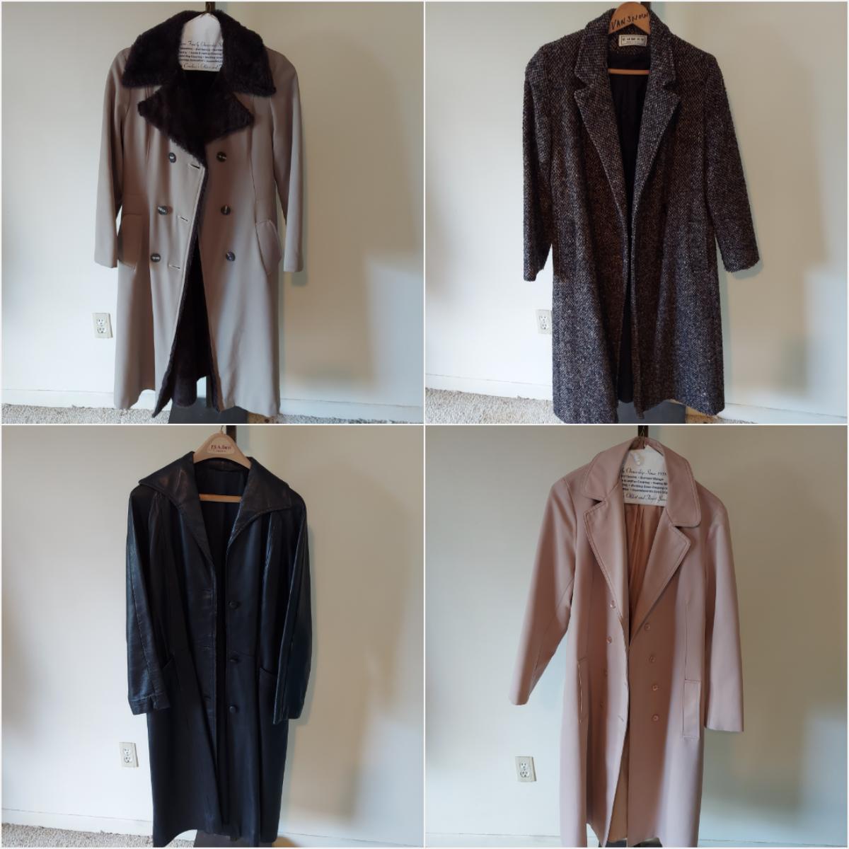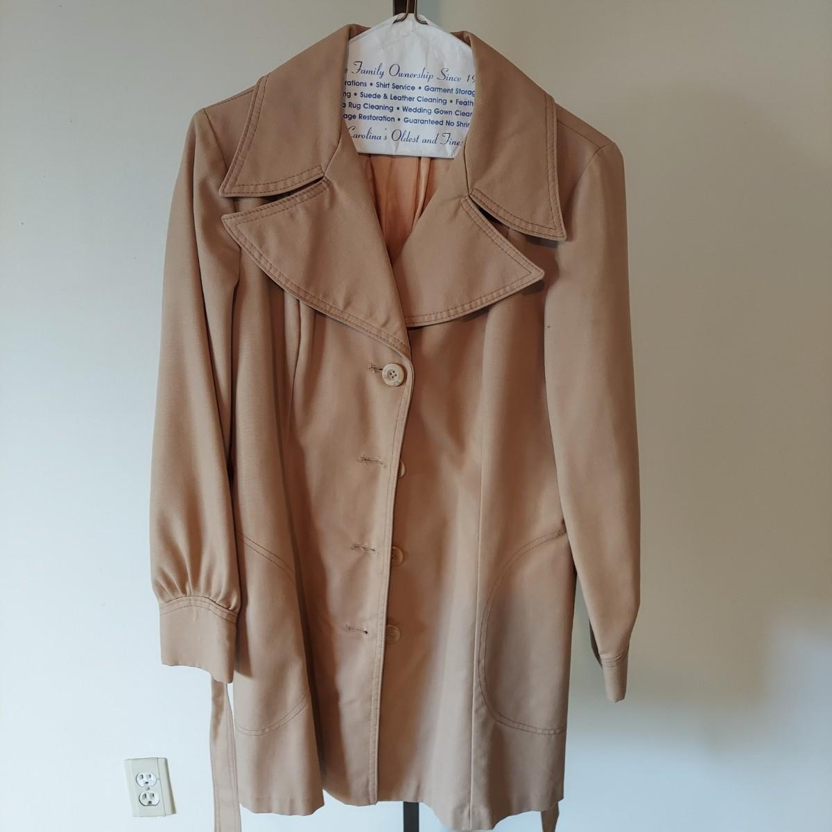 Five 1970s 1980s women's trench coats in roughly size small. Lot includes a black leather, a dark tweed, a tan with faux fur collar, a pink polyester canvas and a tan cotton canvas jacket. Please see photos for details. Shipping available. Clothing racks are props and are not included in the auction!