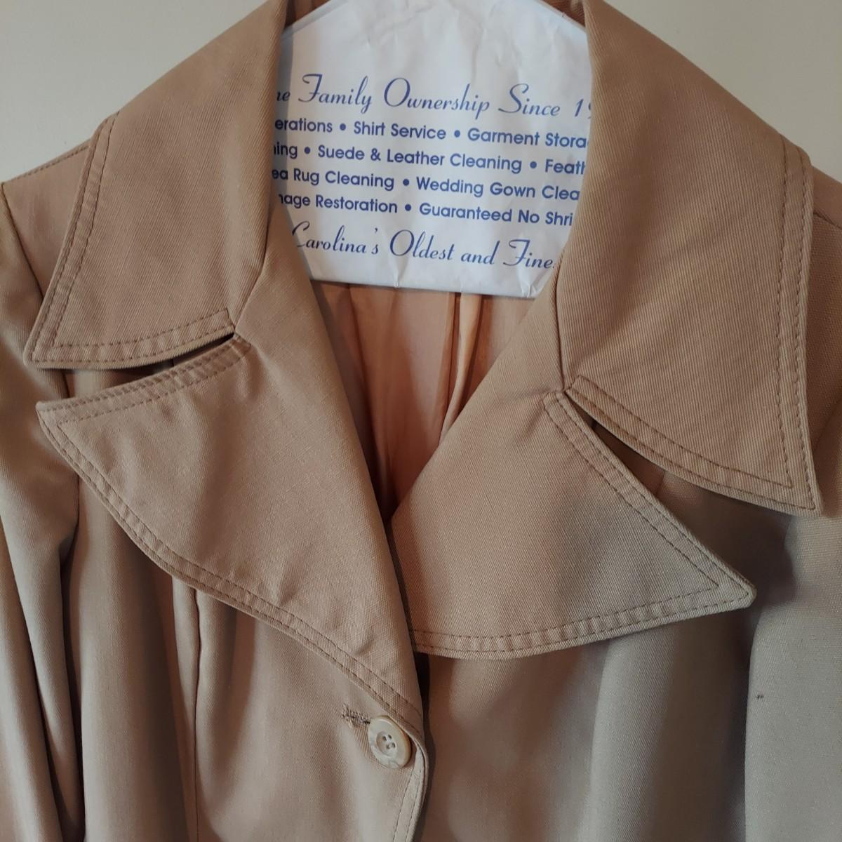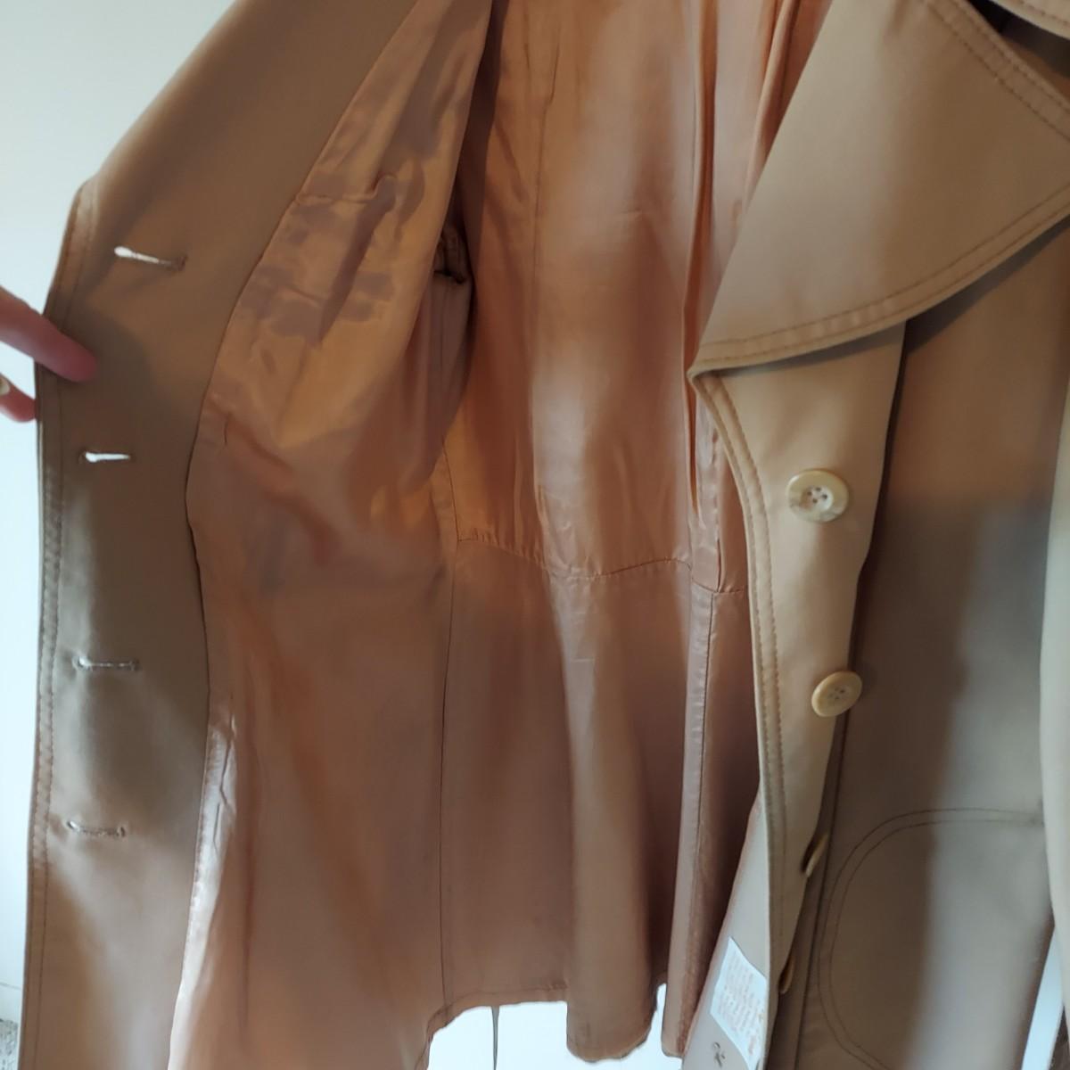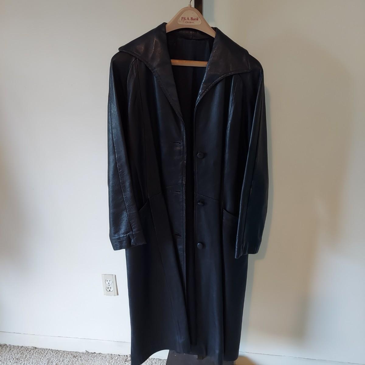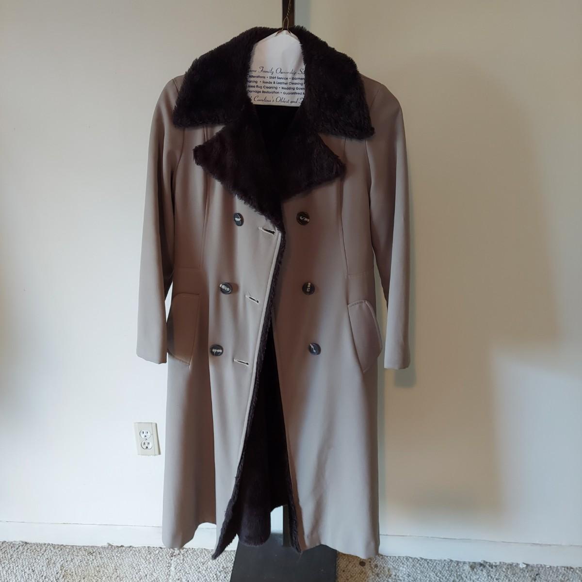 Five 1970s 1980s women's trench coats in roughly size small. Lot includes a black leather, a dark tweed, a tan with faux fur collar, a pink polyester canvas and a tan cotton canvas jacket. Please see photos for details. Shipping available. Clothing racks are props and are not included in the auction!