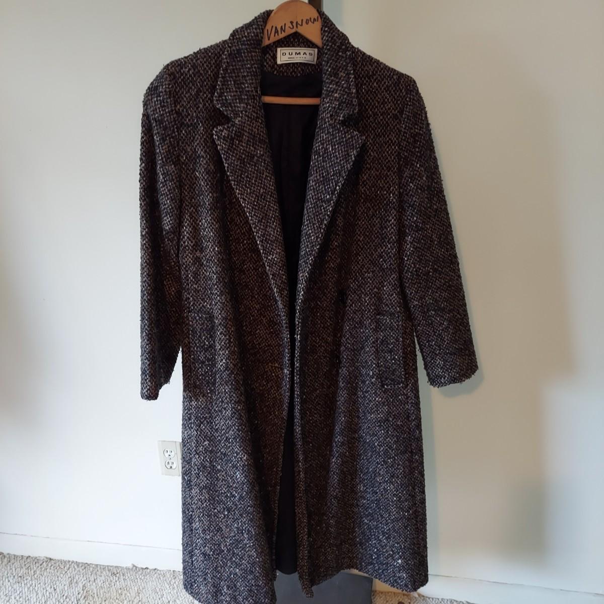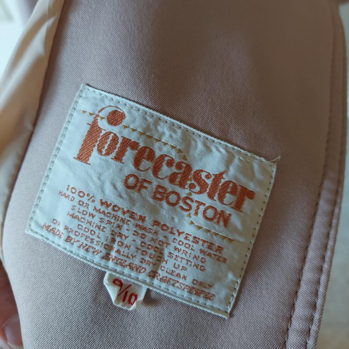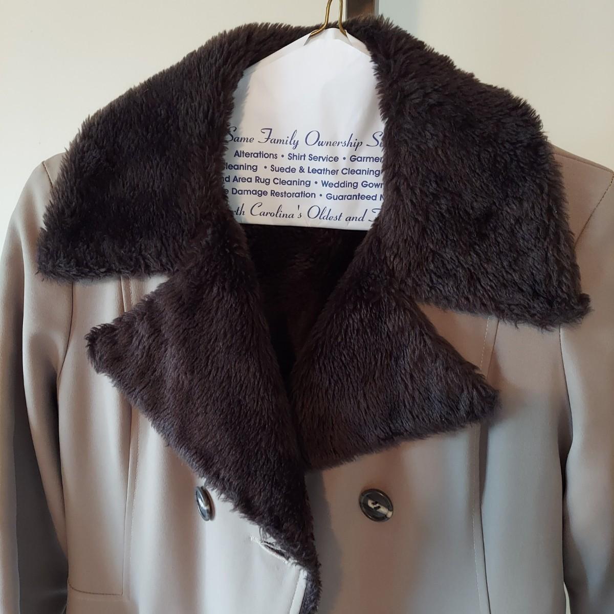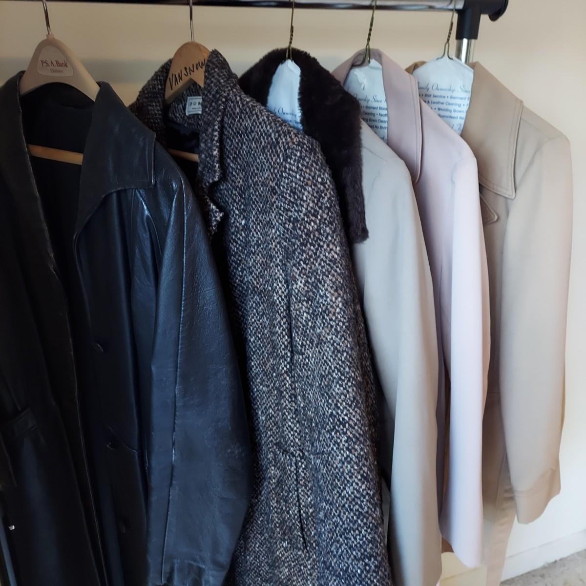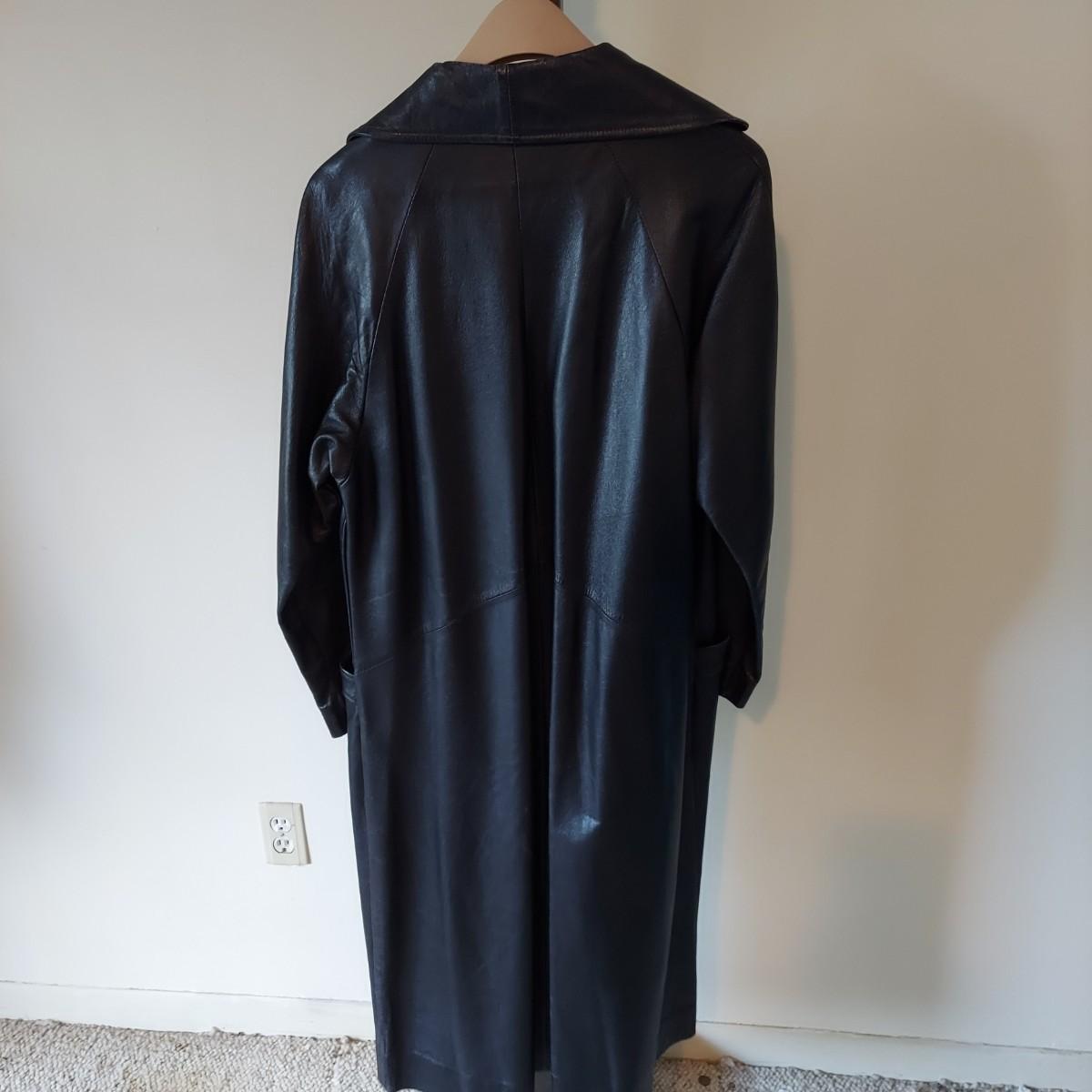 Five 1970s 1980s women's trench coats in roughly size small. Lot includes a black leather, a dark tweed, a tan with faux fur collar, a pink polyester canvas and a tan cotton canvas jacket. Please see photos for details. Shipping available. Clothing racks are props and are not included in the auction!