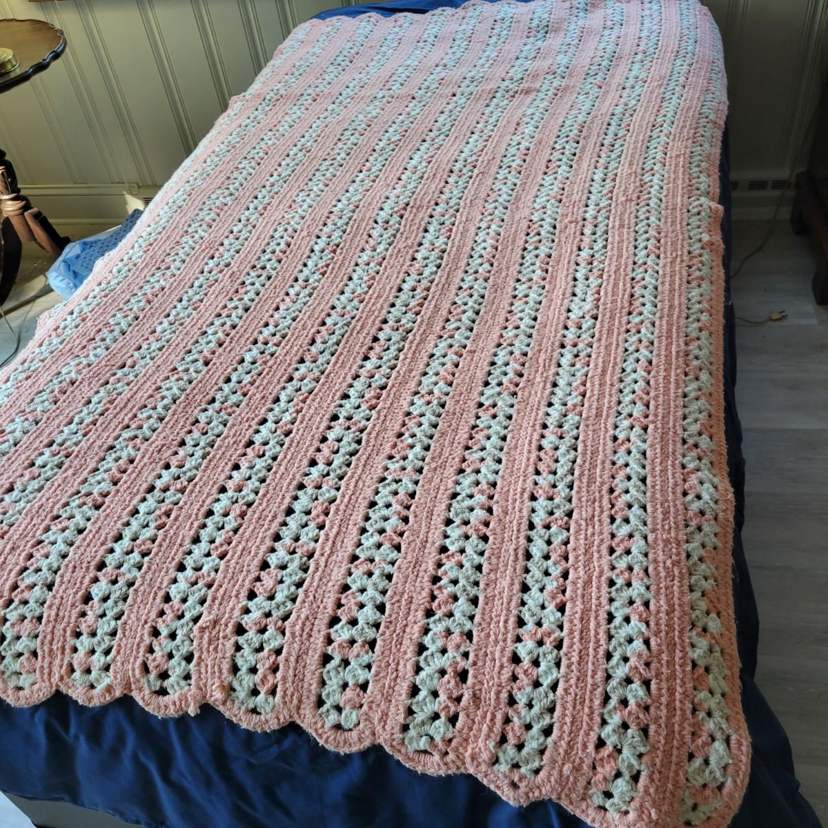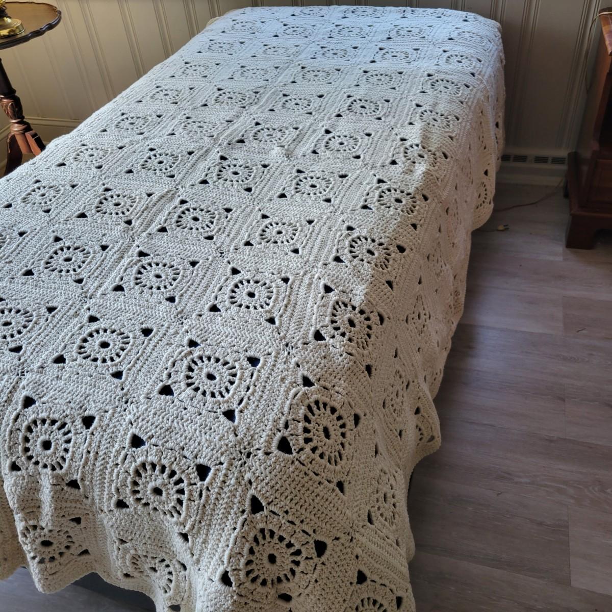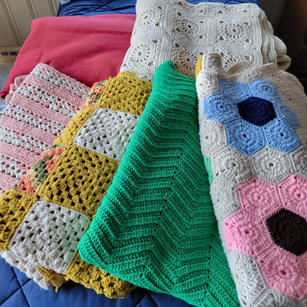 An assortment of five afghans and a wool blanket in good condition. One afghan does have a few areas that are pulling apart, see attached pictures for more detail. The bed (not included) they are displayed on is a size single for reference. The wool blanket measures approximately 82" x 87" and the white afghan measures approximately 74" x 86".