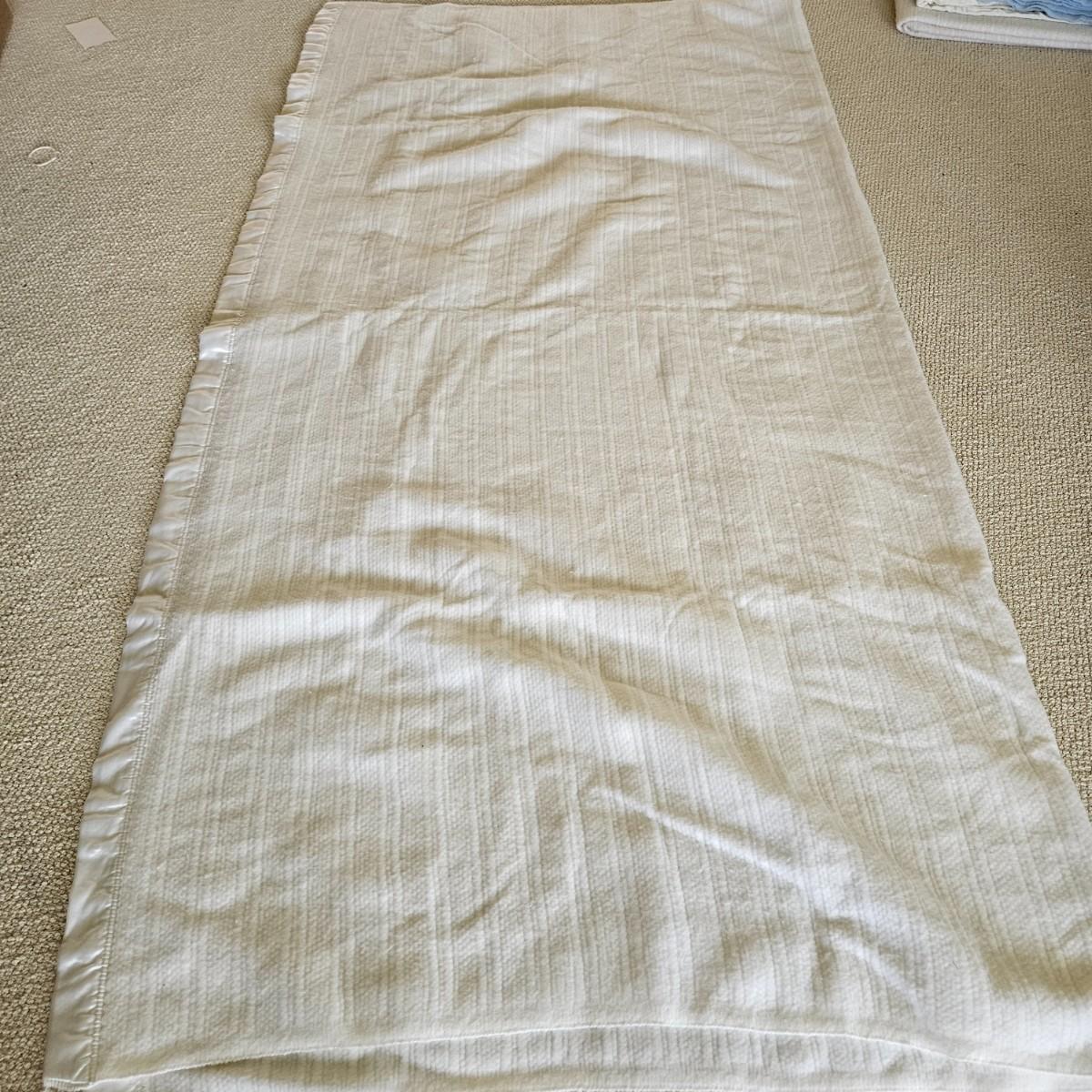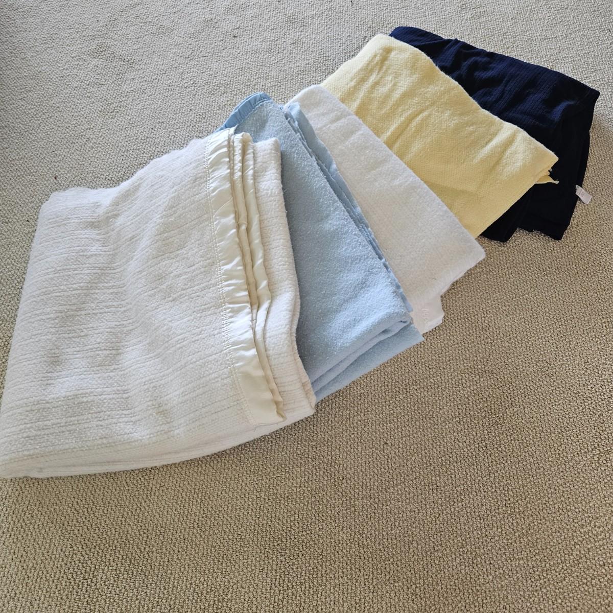 An assortment of five blankets in varying sizes made of acrylic and other synthetic materials. The navy-blue blanket is the largest and measures approximately 90" x 90". Local pickup only