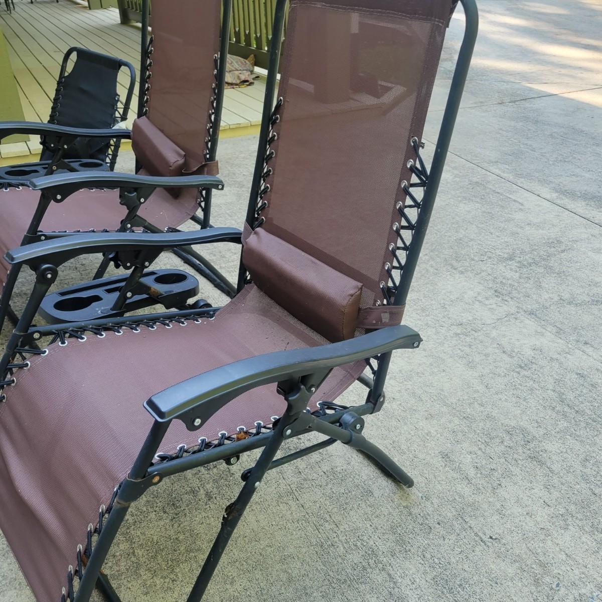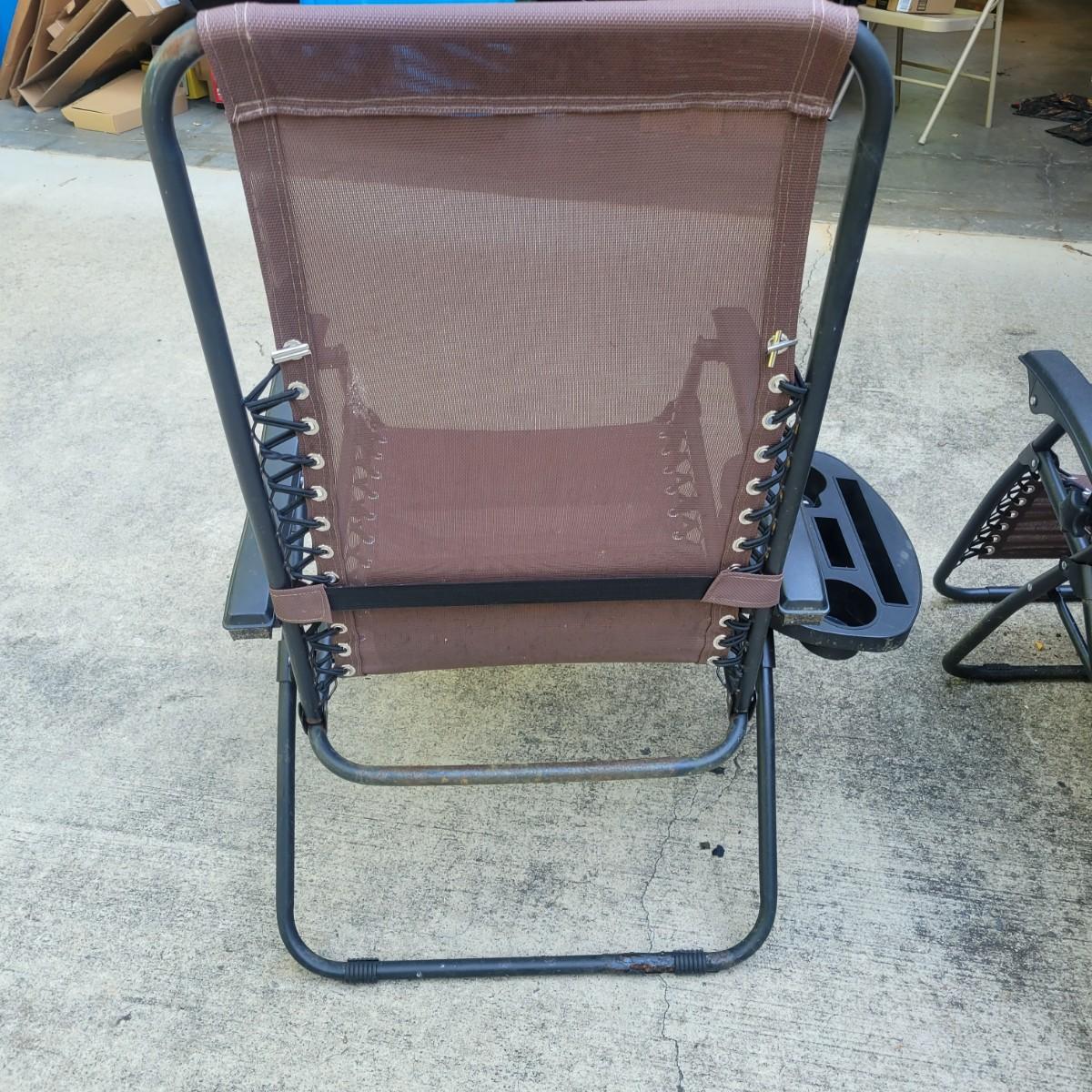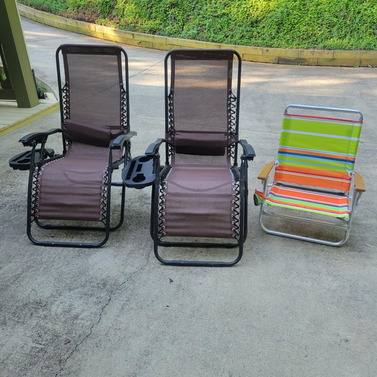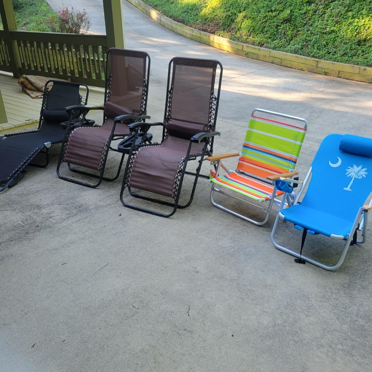An assortment of five chairs in various states of use. All five chairs fold up for convenient storage and transportation. They all have the ability to recline. The blue chair and the green and orange chair appear to be unused. The largest brown chairs measure approximately 33" x 34" x 43" with a seat height of 18". The brown chairs also have some rust and peeling paint. Local pickup only