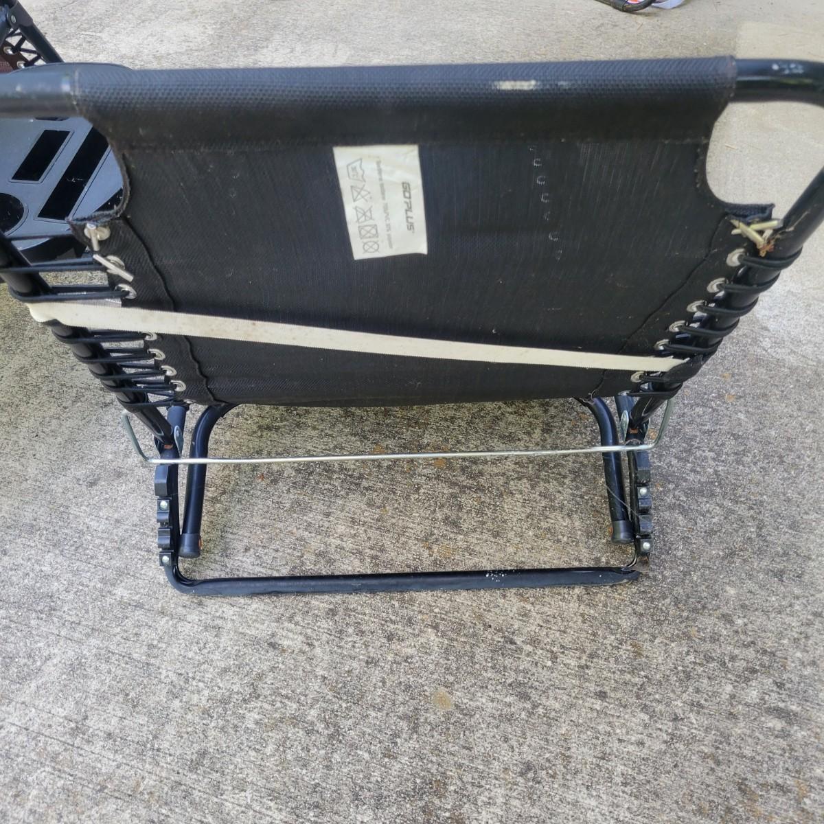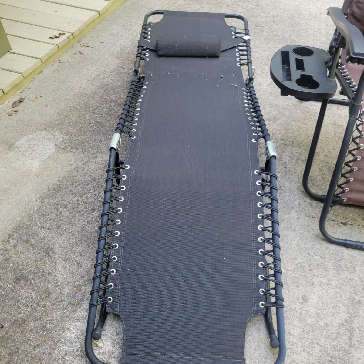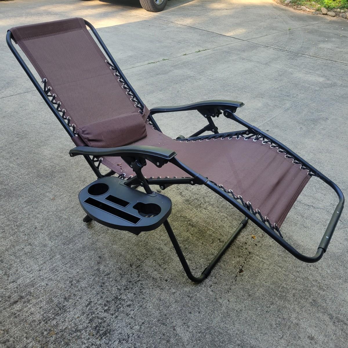 An assortment of five chairs in various states of use. All five chairs fold up for convenient storage and transportation. They all have the ability to recline. The blue chair and the green and orange chair appear to be unused. The largest brown chairs measure approximately 33" x 34" x 43" with a seat height of 18". The brown chairs also have some rust and peeling paint. Local pickup only