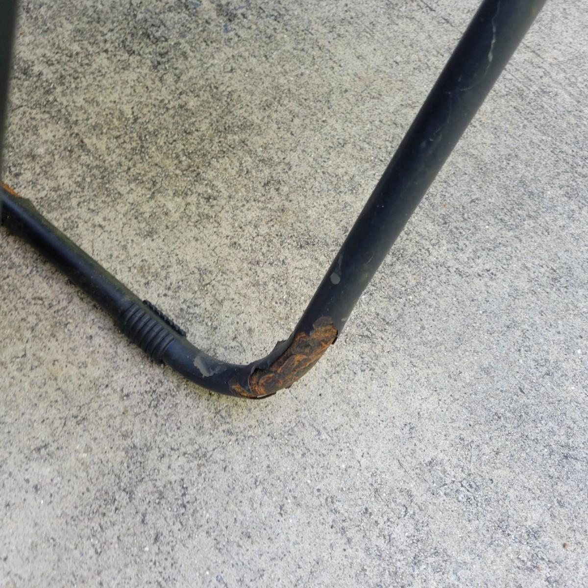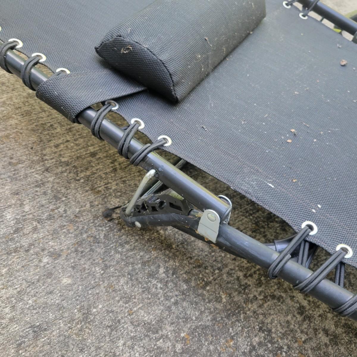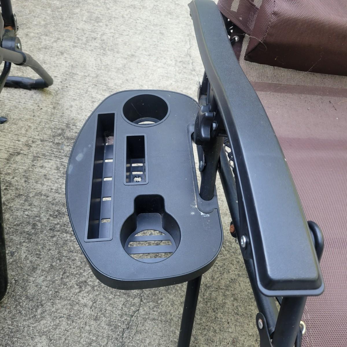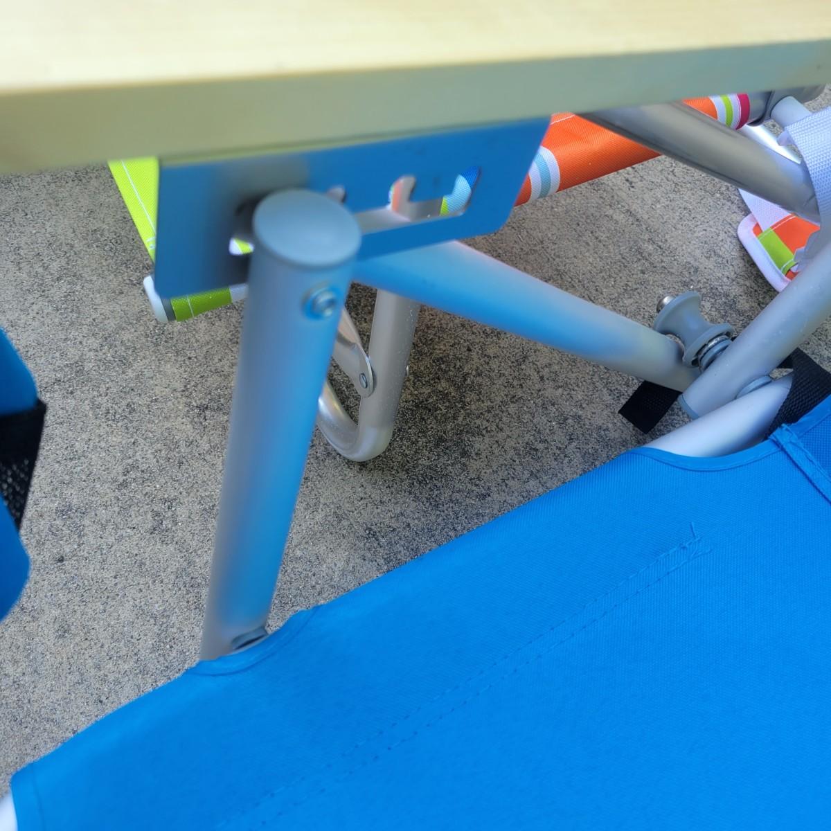 An assortment of five chairs in various states of use. All five chairs fold up for convenient storage and transportation. They all have the ability to recline. The blue chair and the green and orange chair appear to be unused. The largest brown chairs measure approximately 33" x 34" x 43" with a seat height of 18". The brown chairs also have some rust and peeling paint. Local pickup only