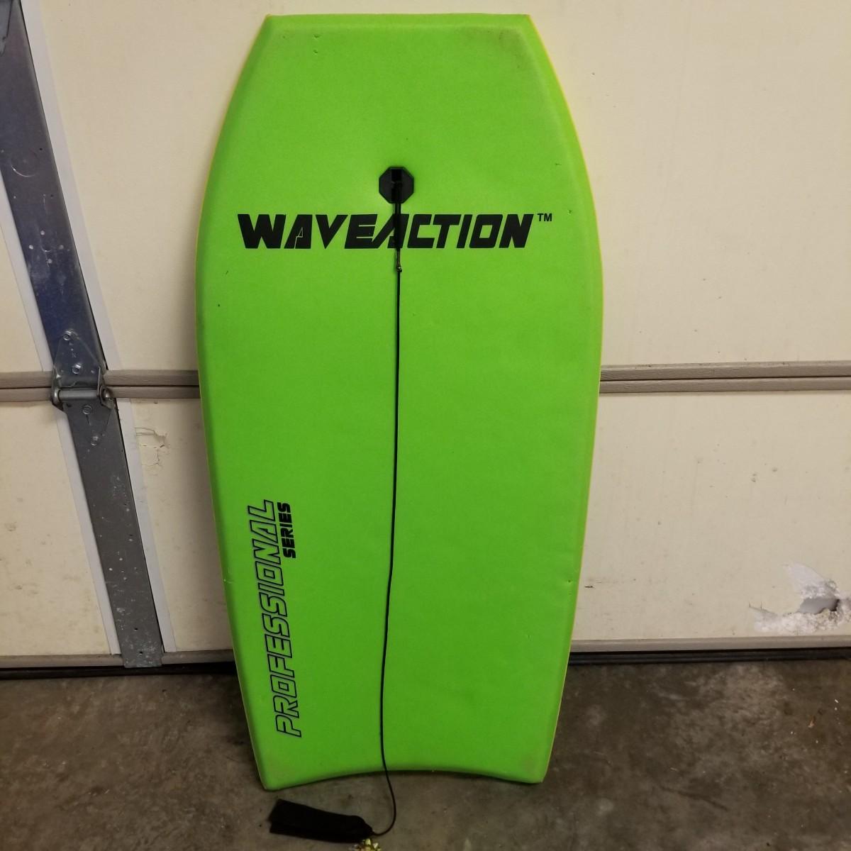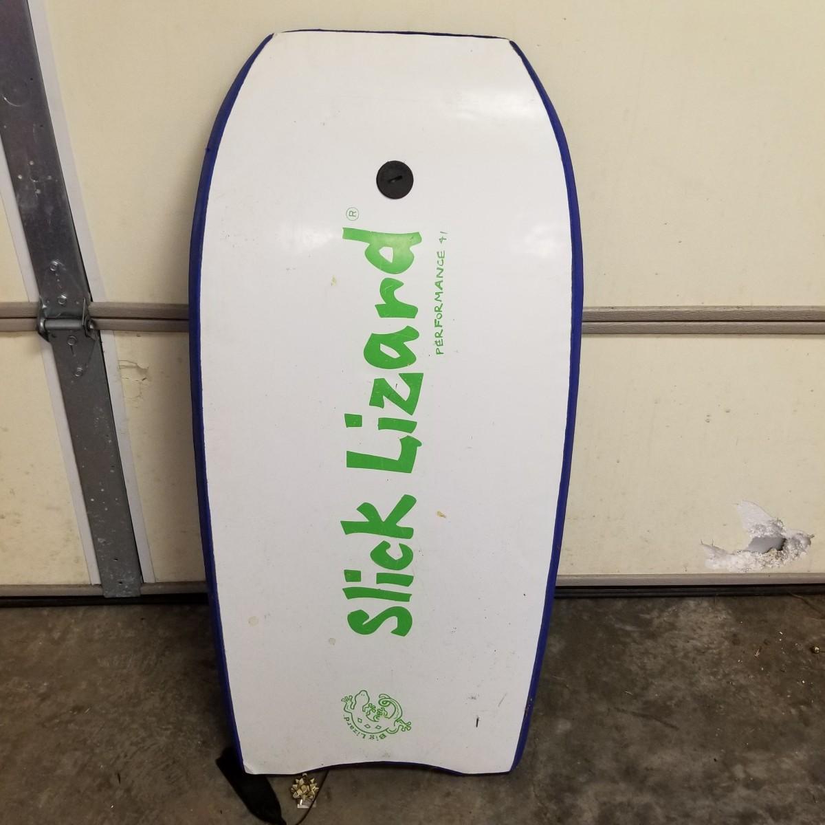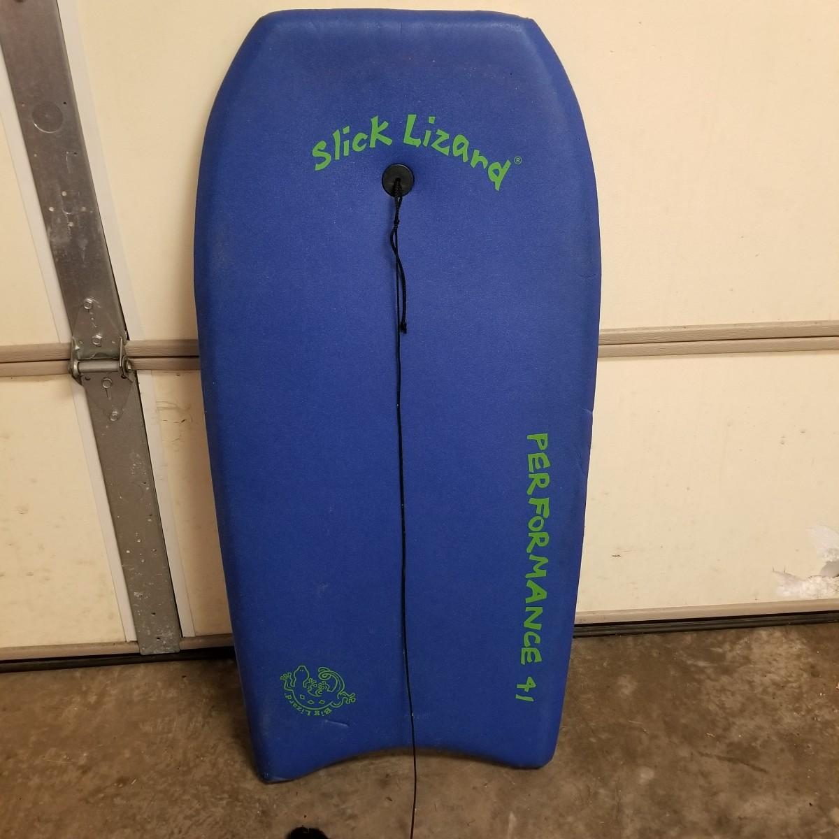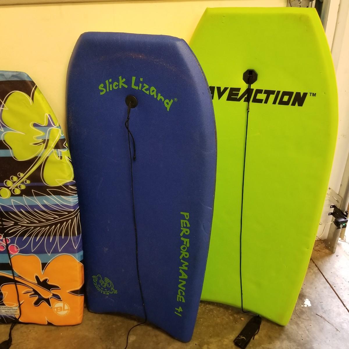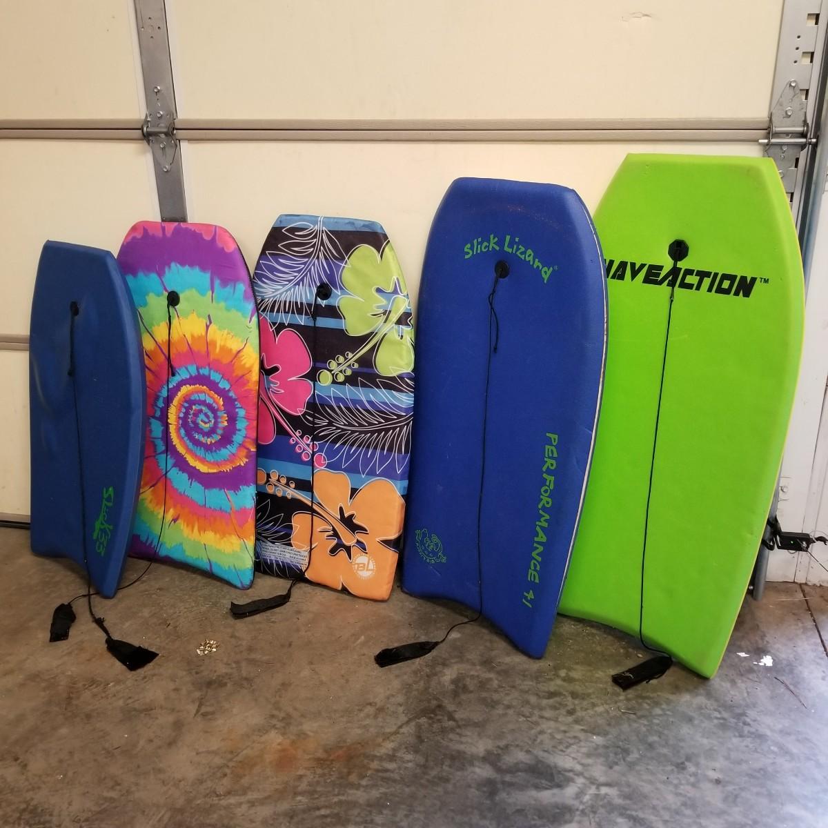 Five assorted boogie boards for beach use. Waveaction, Slick Lizard, Big Lizard brands. All come with ankle leashes. Boards range in size from 18" x 30" to 19" x 42". Boards show normal wear and tear from use. See photos for details. Shipping available.