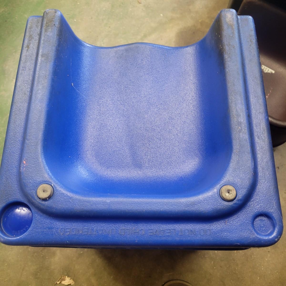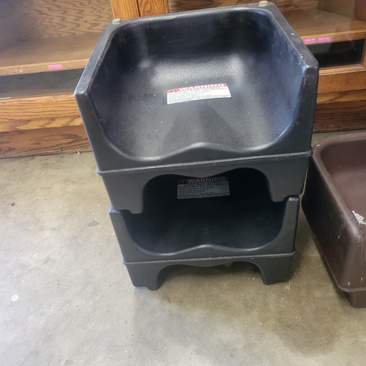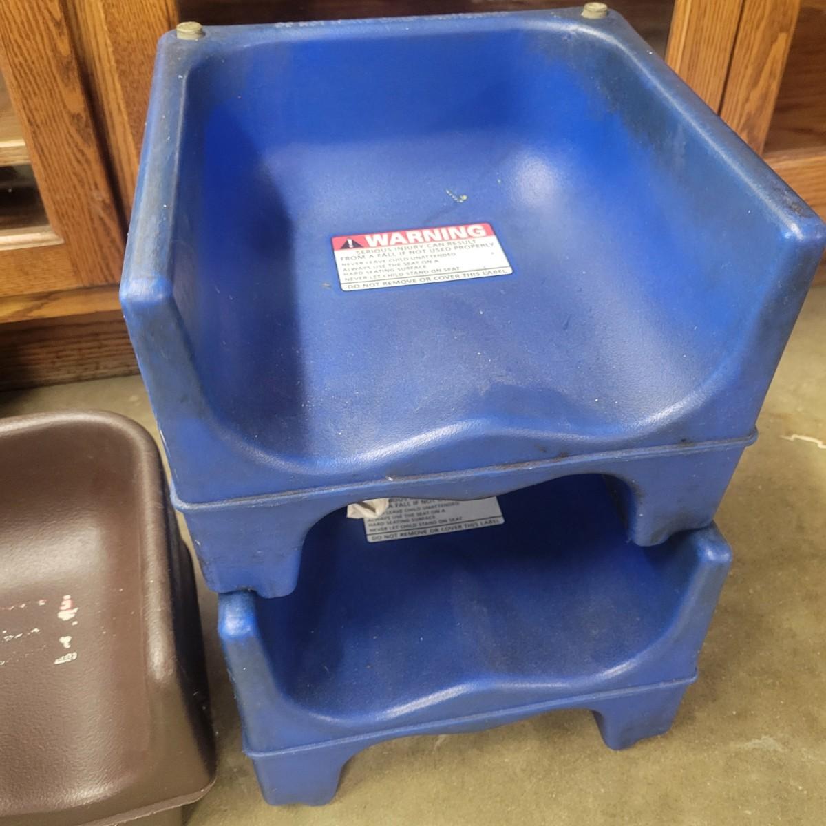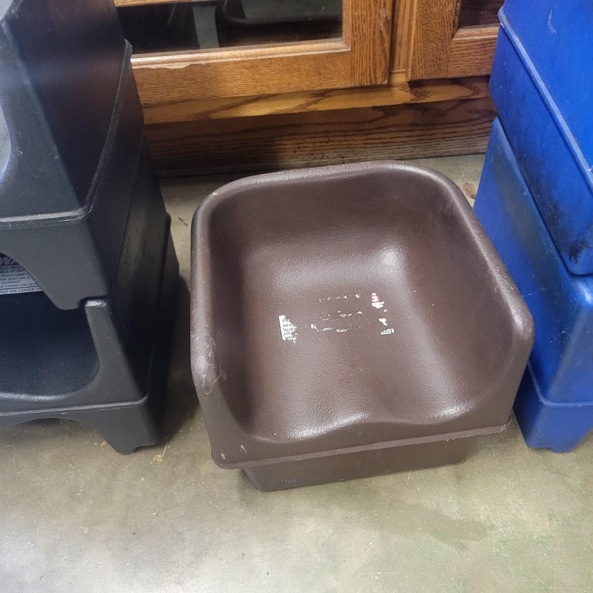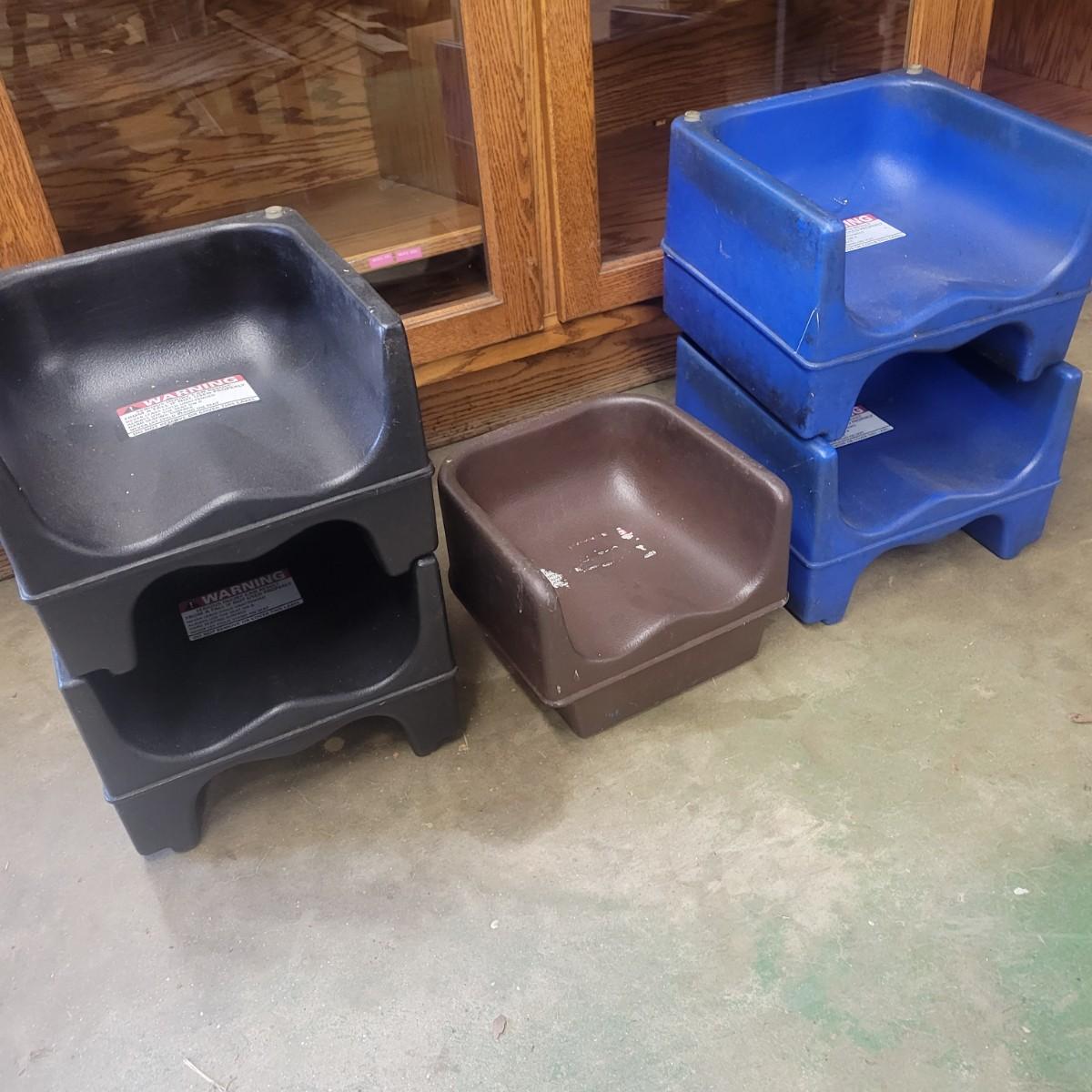 Five booster seats in used condition, but no notable damage, they just need a good cleaning. The black and blue ones are the same type and are dual sided with different booster heights. They measure approximately 13" x 12" x 10". The brown one is smaller and a single sided booster. It measures approximately 11.5" x 11" x 8". Shipping available