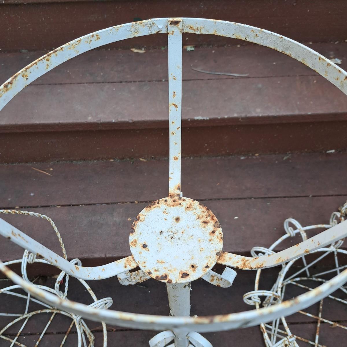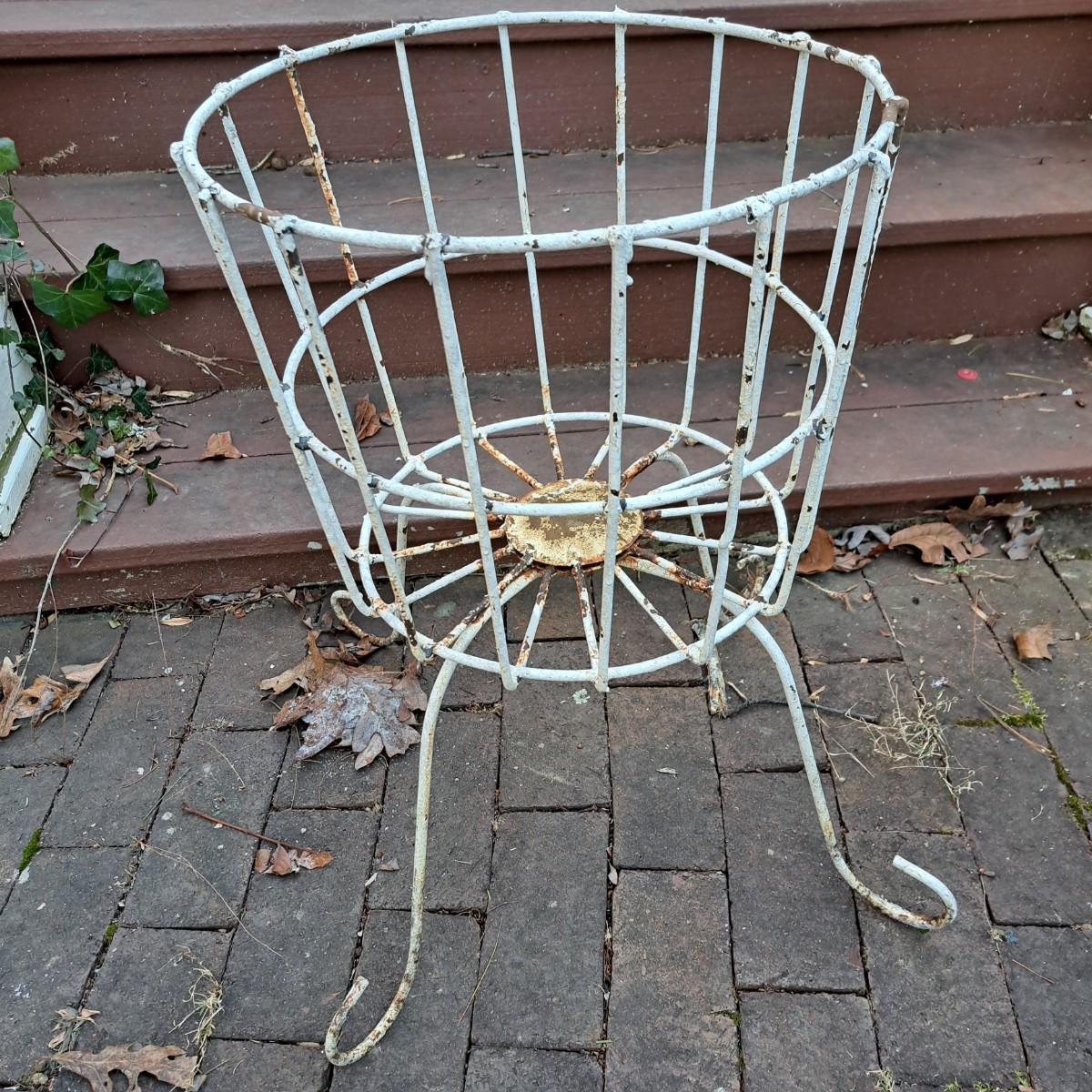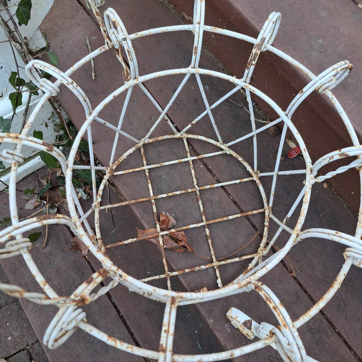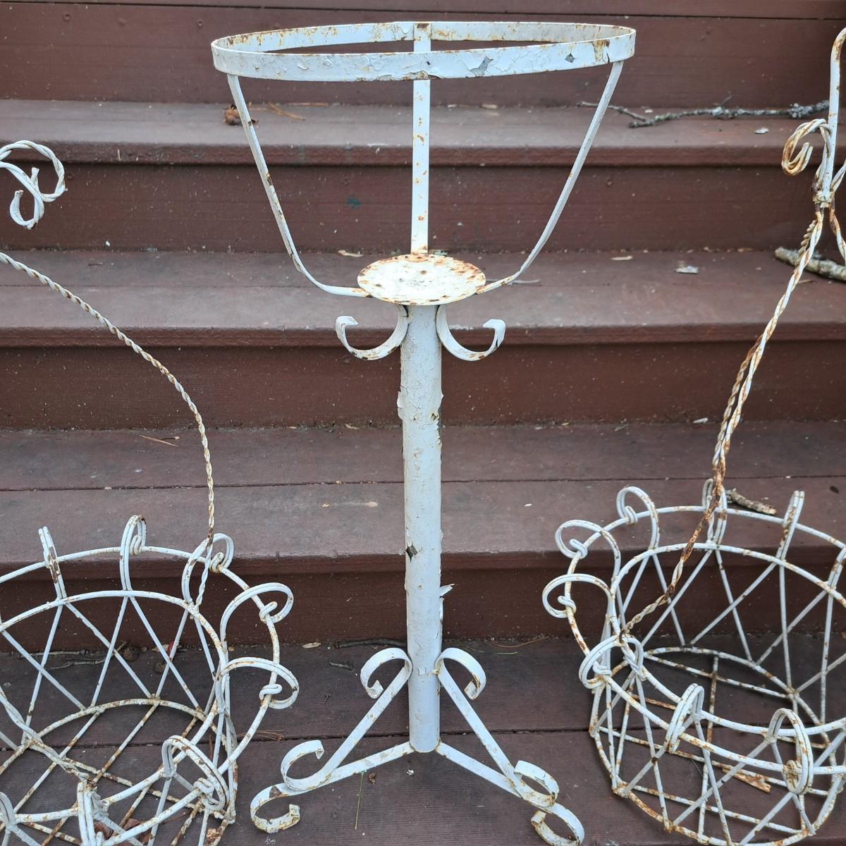 A bevy of five, white vintage metal planters, 14"D x 24"H, to include two round drum-style planters with curled legs, two round planters with wire arms for hanging and a smaller (10"H) round planter on a pole with three curled feet. Despite their chipped paint and here-and-there rust they're all very sturdy and ready to take on your most cherished household plants! Local pickup only.