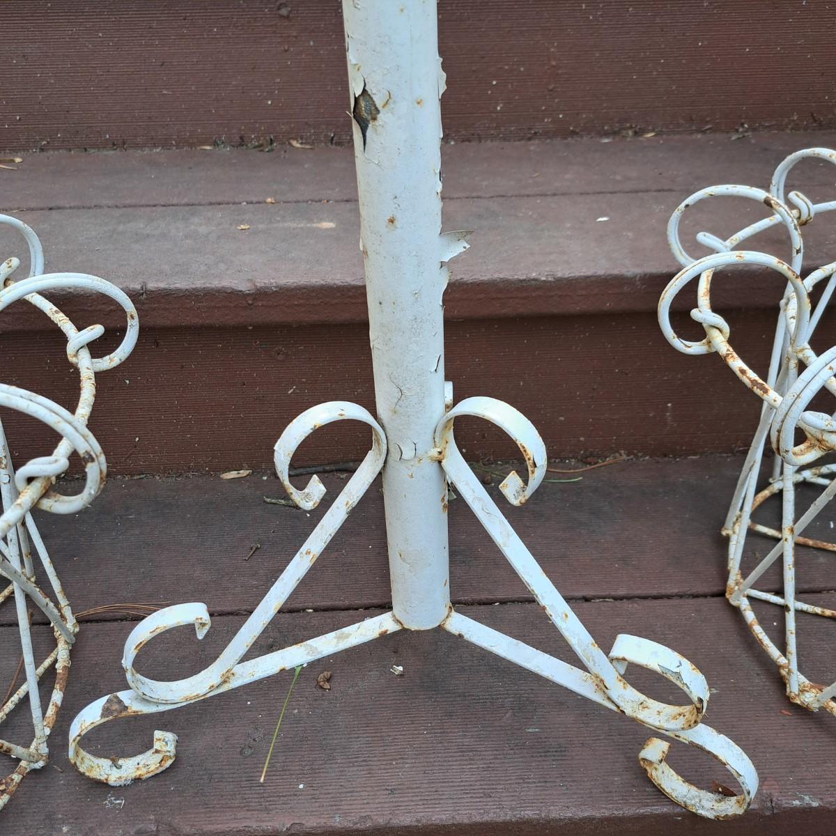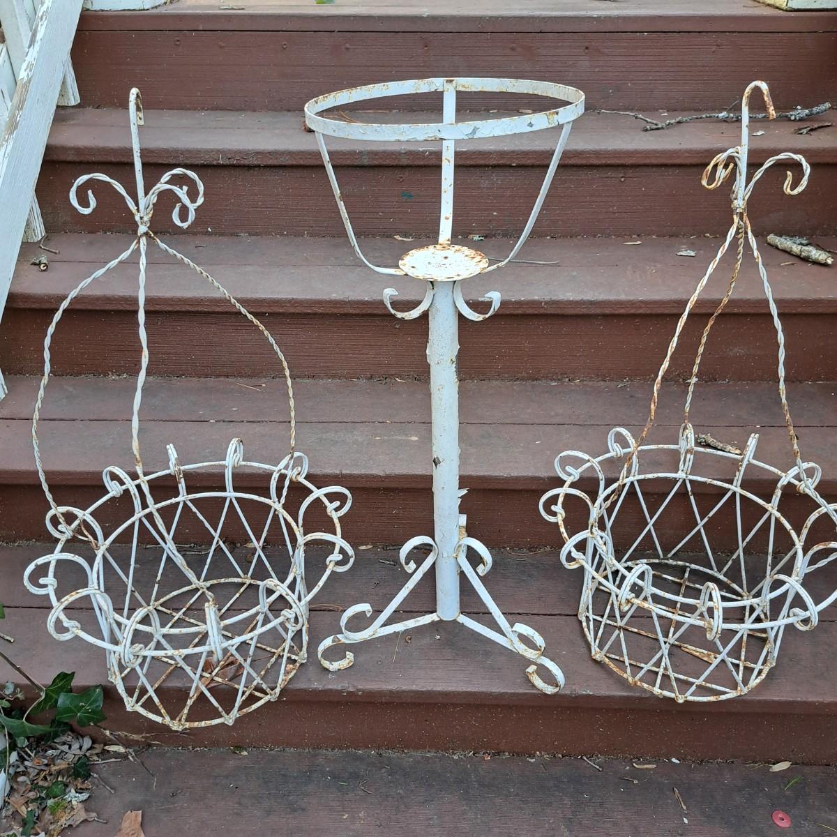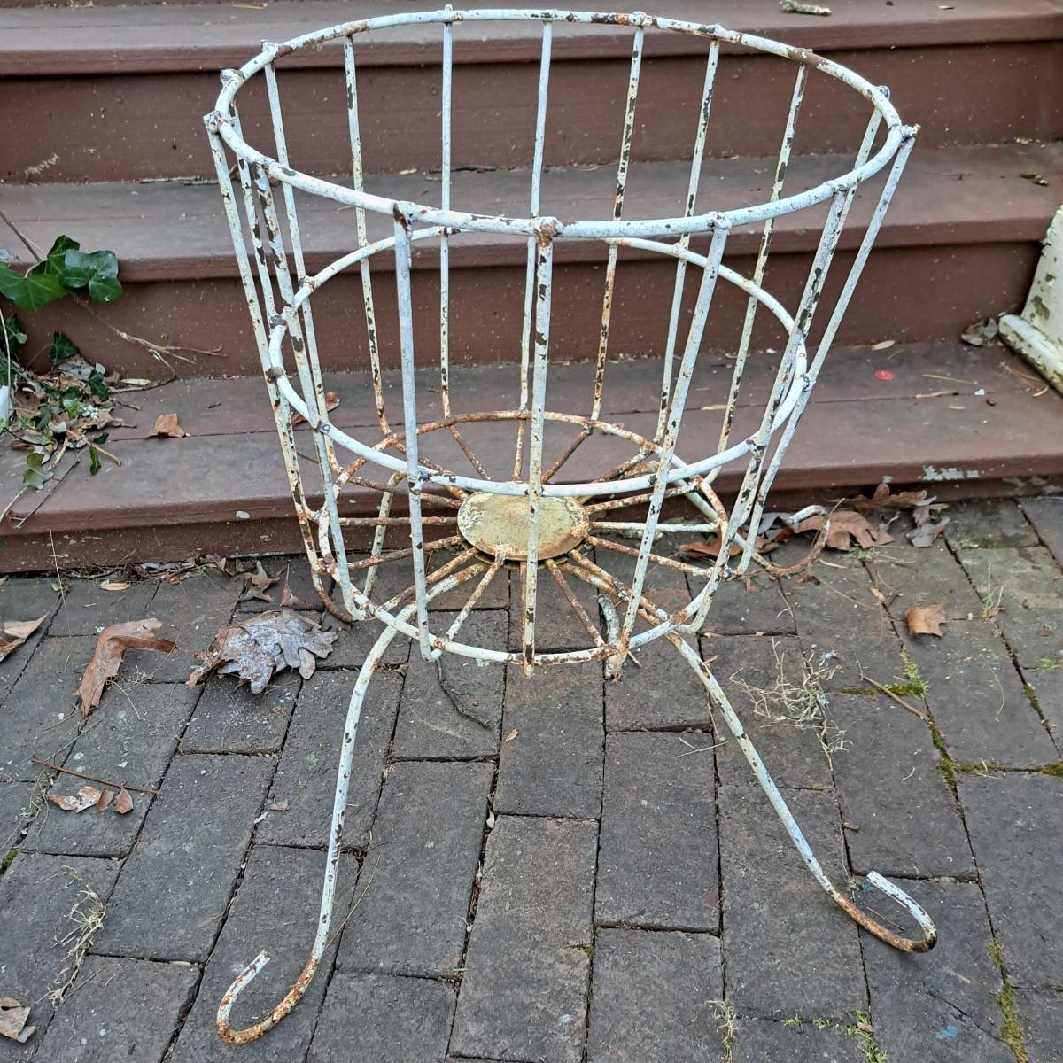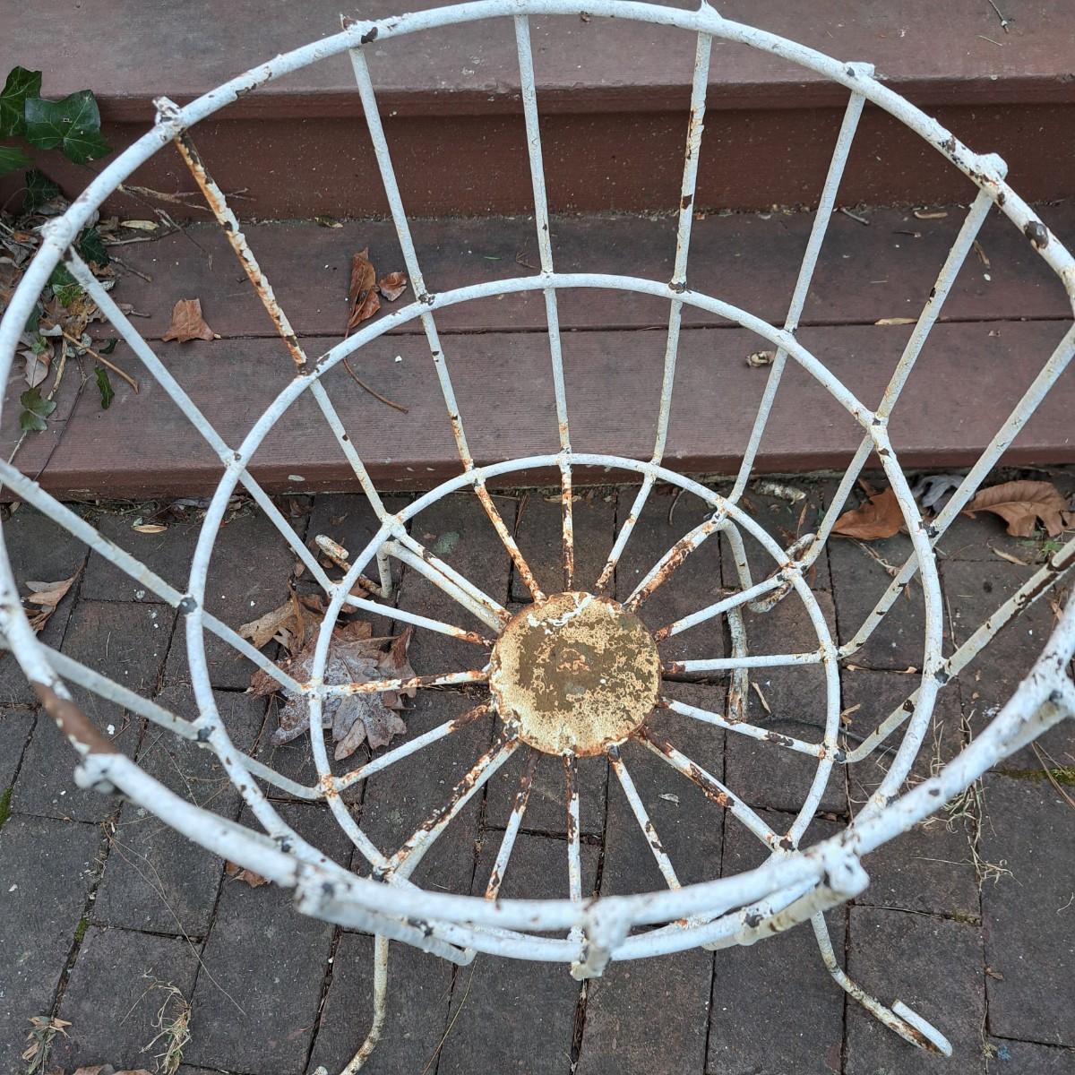 A bevy of five, white vintage metal planters, 14"D x 24"H, to include two round drum-style planters with curled legs, two round planters with wire arms for hanging and a smaller (10"H) round planter on a pole with three curled feet. Despite their chipped paint and here-and-there rust they're all very sturdy and ready to take on your most cherished household plants! Local pickup only.