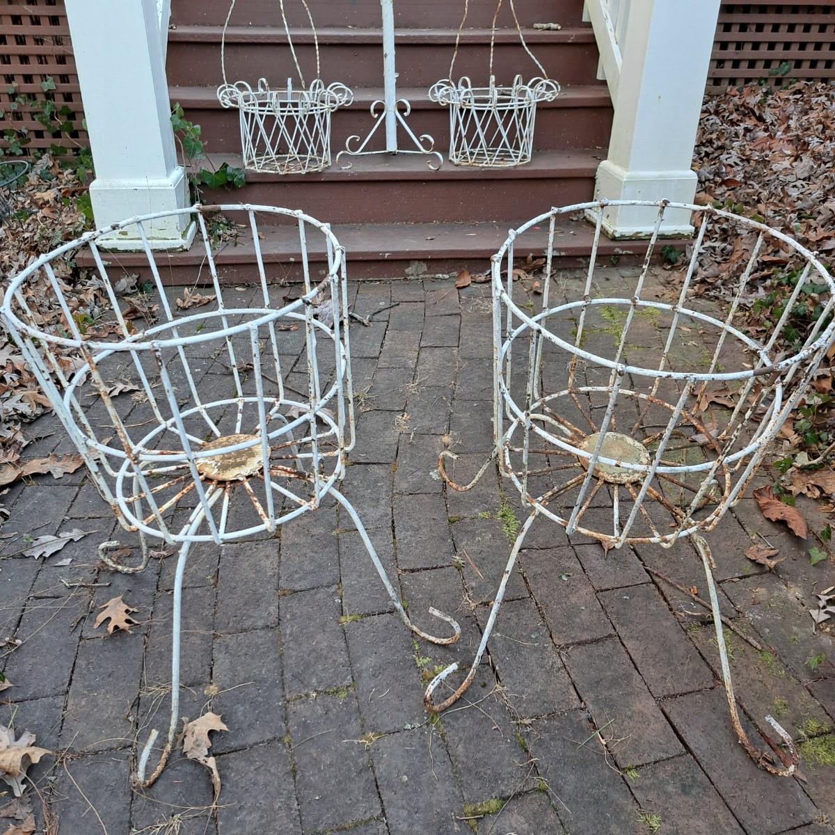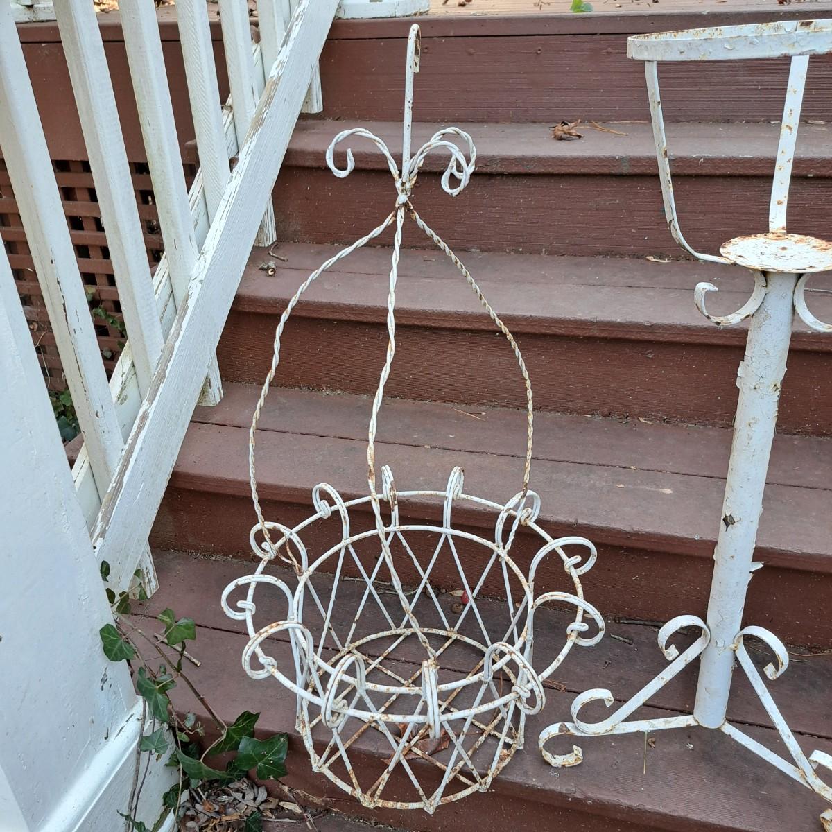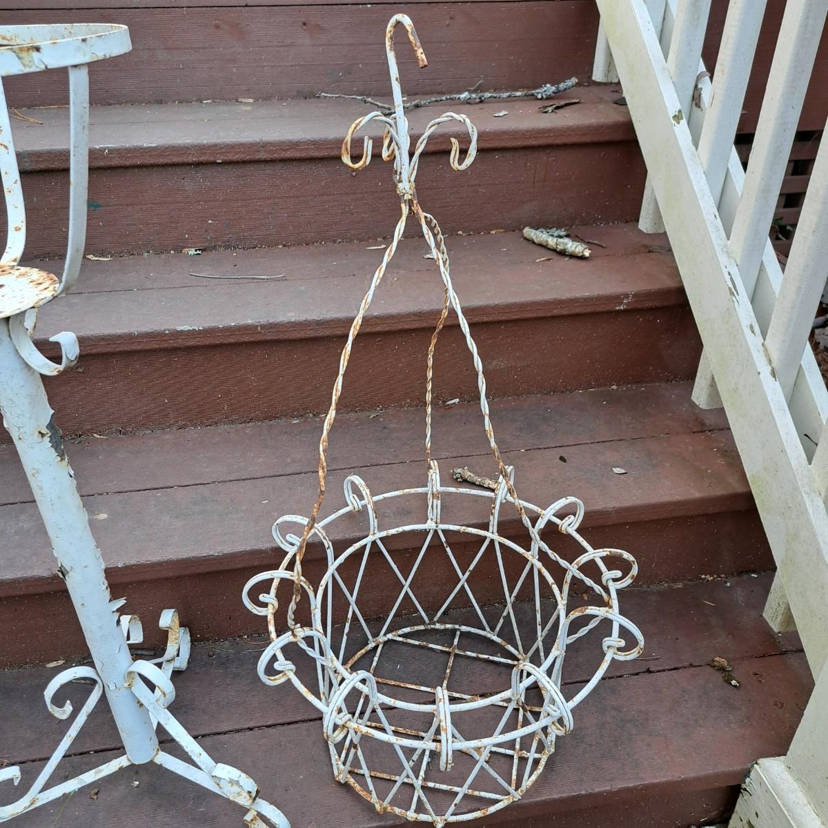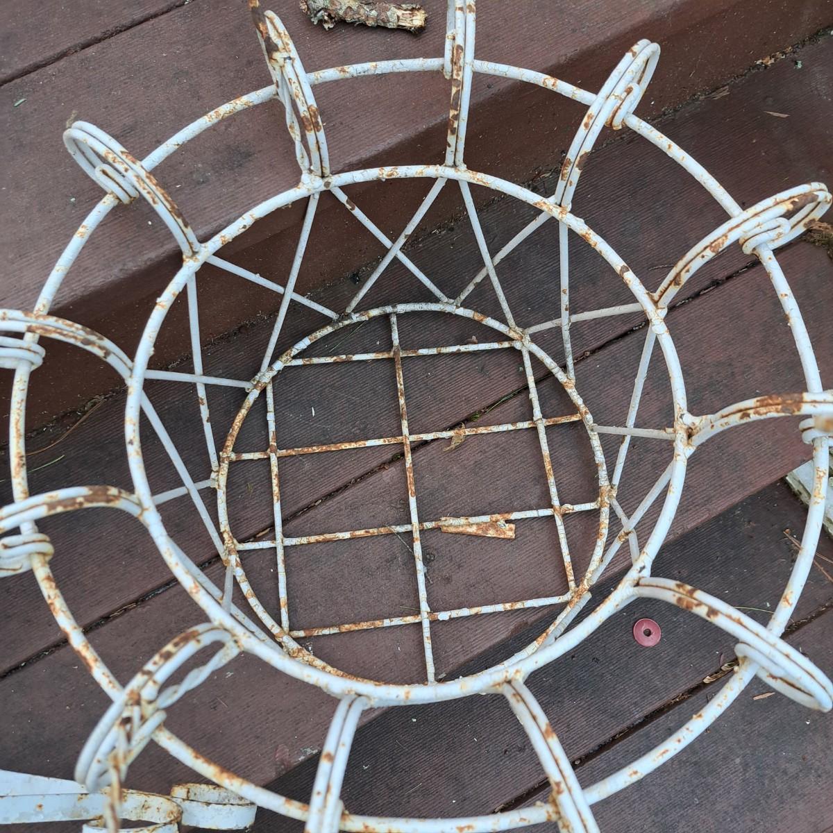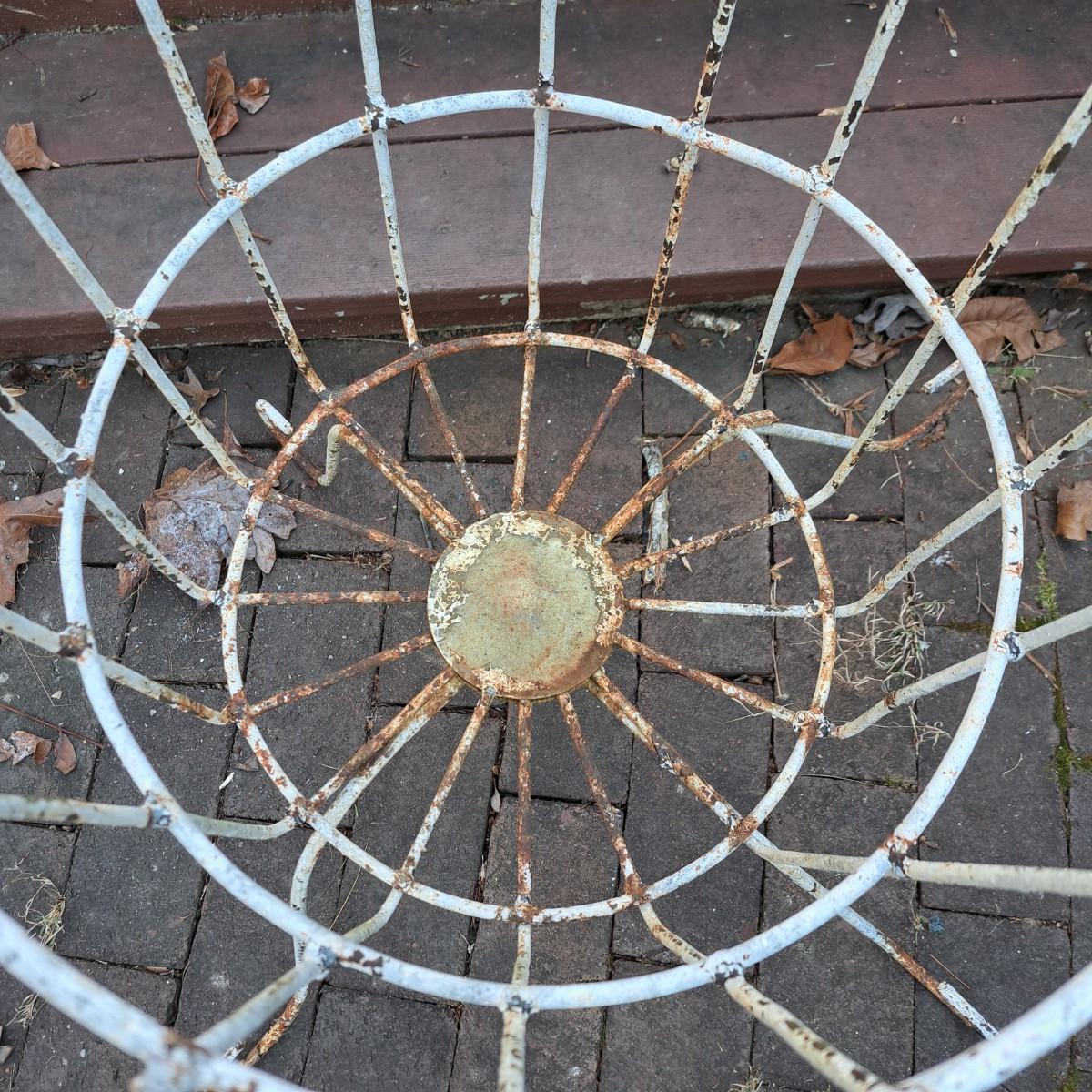 A bevy of five, white vintage metal planters, 14"D x 24"H, to include two round drum-style planters with curled legs, two round planters with wire arms for hanging and a smaller (10"H) round planter on a pole with three curled feet. Despite their chipped paint and here-and-there rust they're all very sturdy and ready to take on your most cherished household plants! Local pickup only.