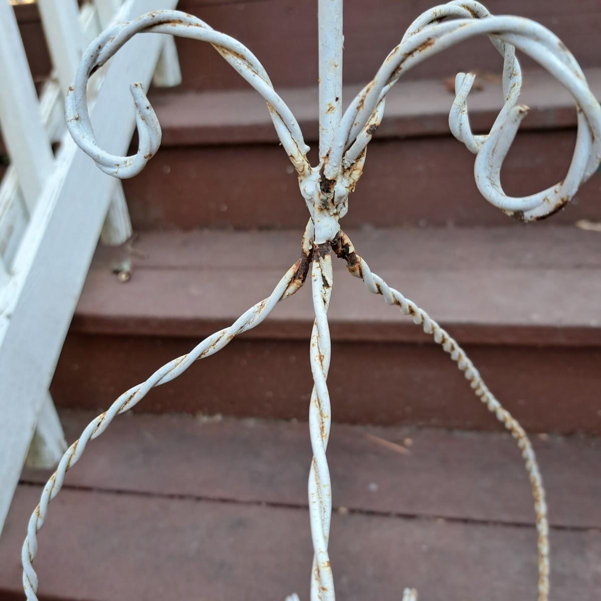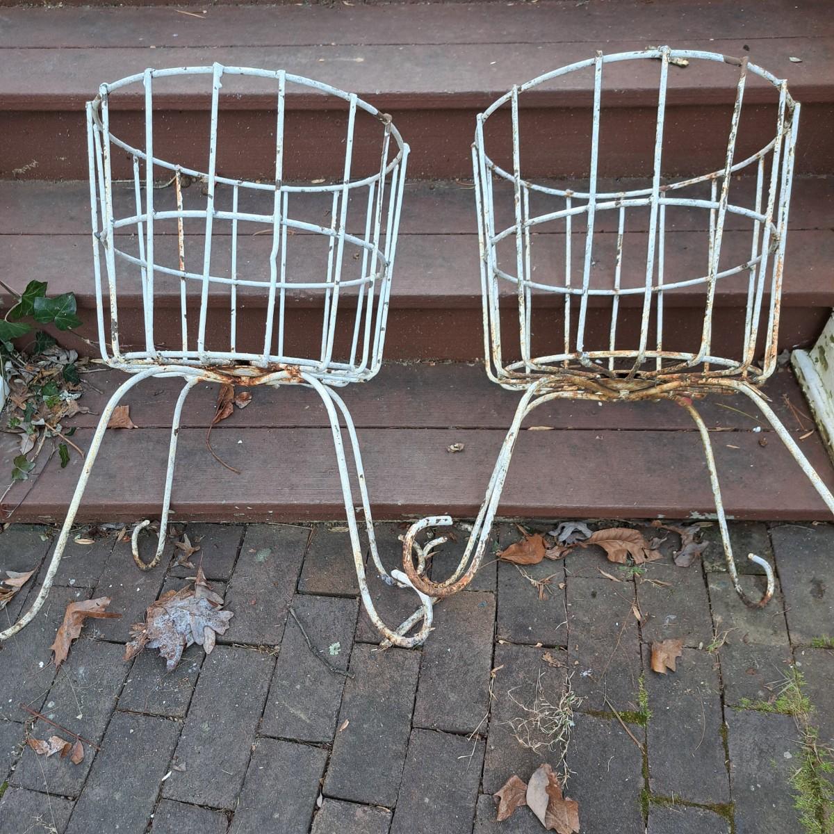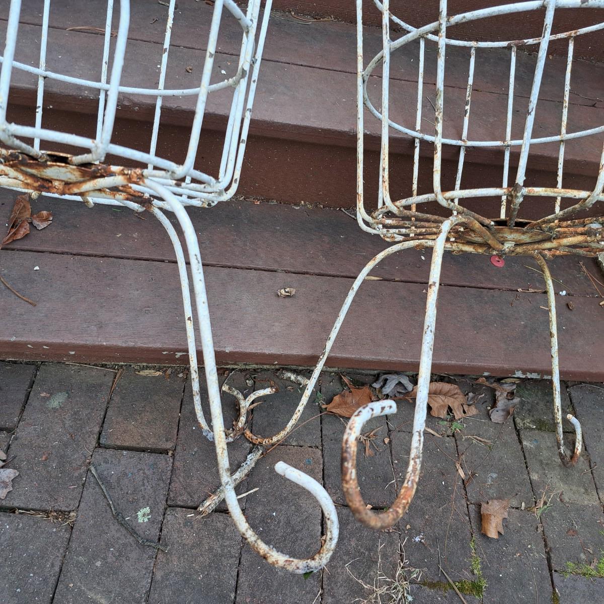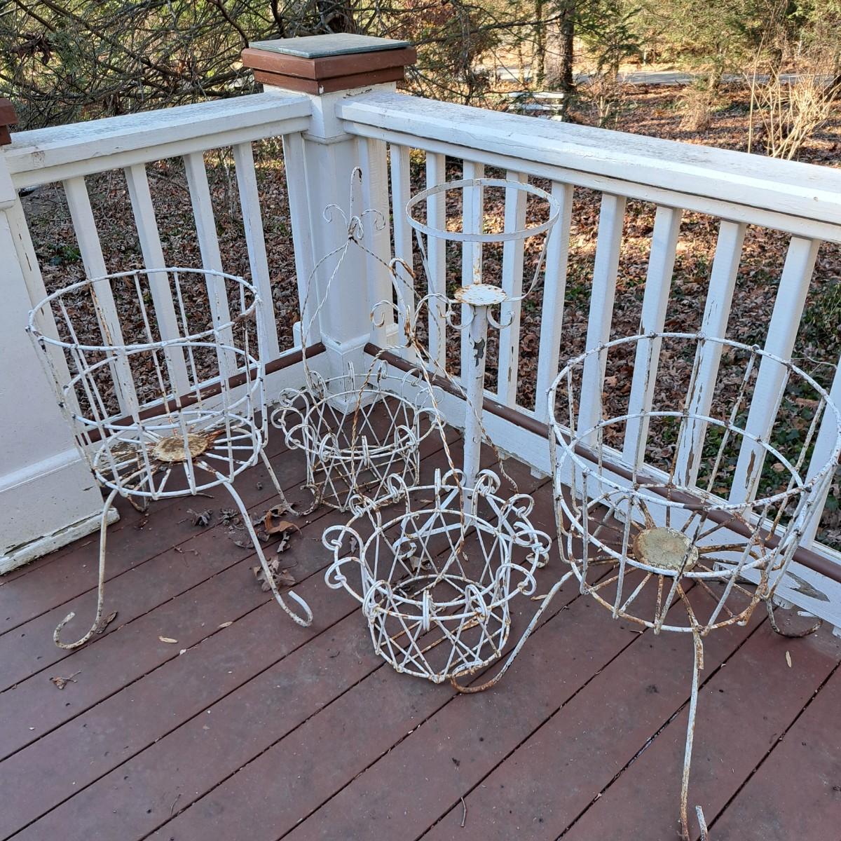 A bevy of five, white vintage metal planters, 14"D x 24"H, to include two round drum-style planters with curled legs, two round planters with wire arms for hanging and a smaller (10"H) round planter on a pole with three curled feet. Despite their chipped paint and here-and-there rust they're all very sturdy and ready to take on your most cherished household plants! Local pickup only.